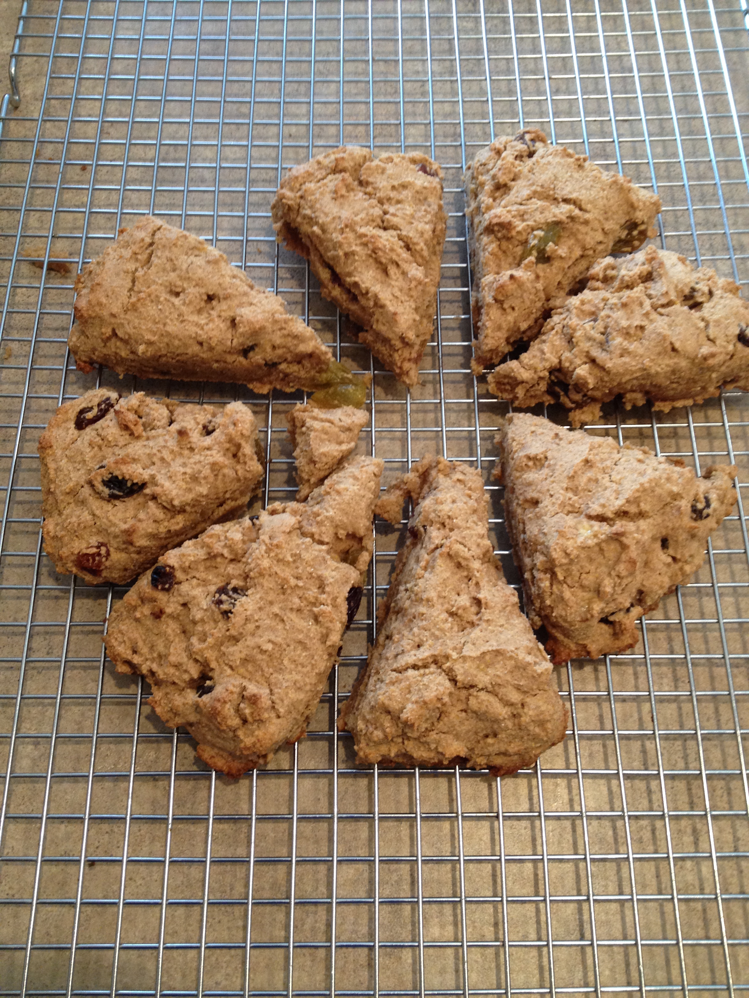 Have you tried scones yet? They are so much easier than I ever thought they would be to make. Start by dumping flours, spices, and baking powder into large bowl and mix. Add butter and use clean hands to squish all through. In a smaller bowl mash banana then add everything else and mix well. Gently stir into dry mix until just combined. Fold in raisins. Dump dough onto the baking sheet and form into a circle. Cut into 8ths and separate a little. Bake for 15 minutes at 415 degrees. Take out and let cool a little and enjoy!