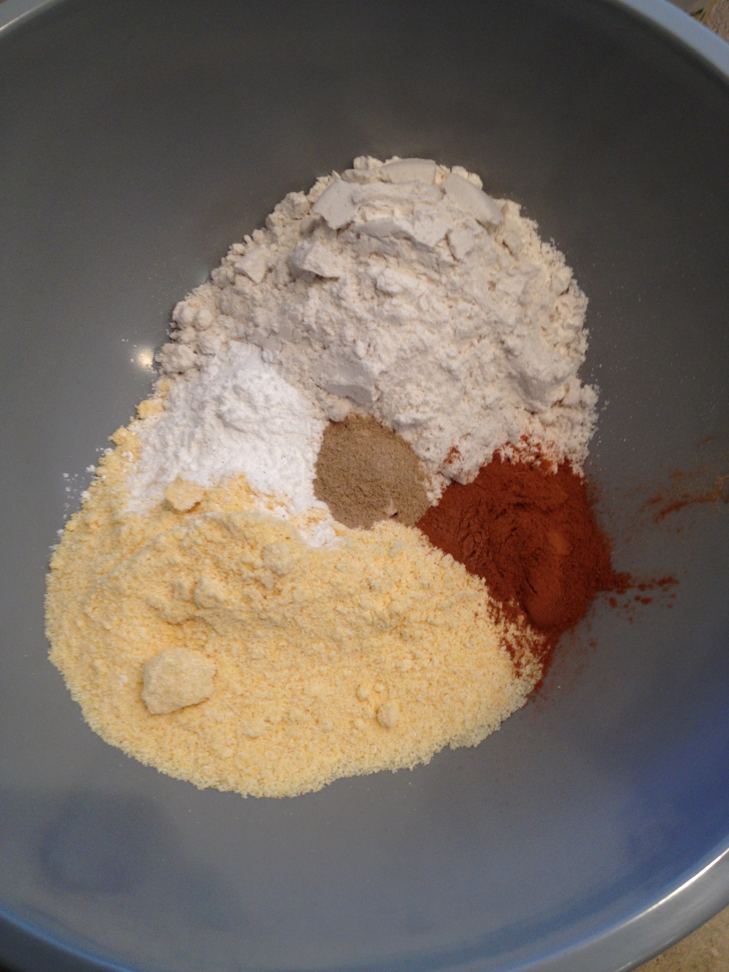 2. In a large bowl mix flour, meal, spices, and baking powder and mix.