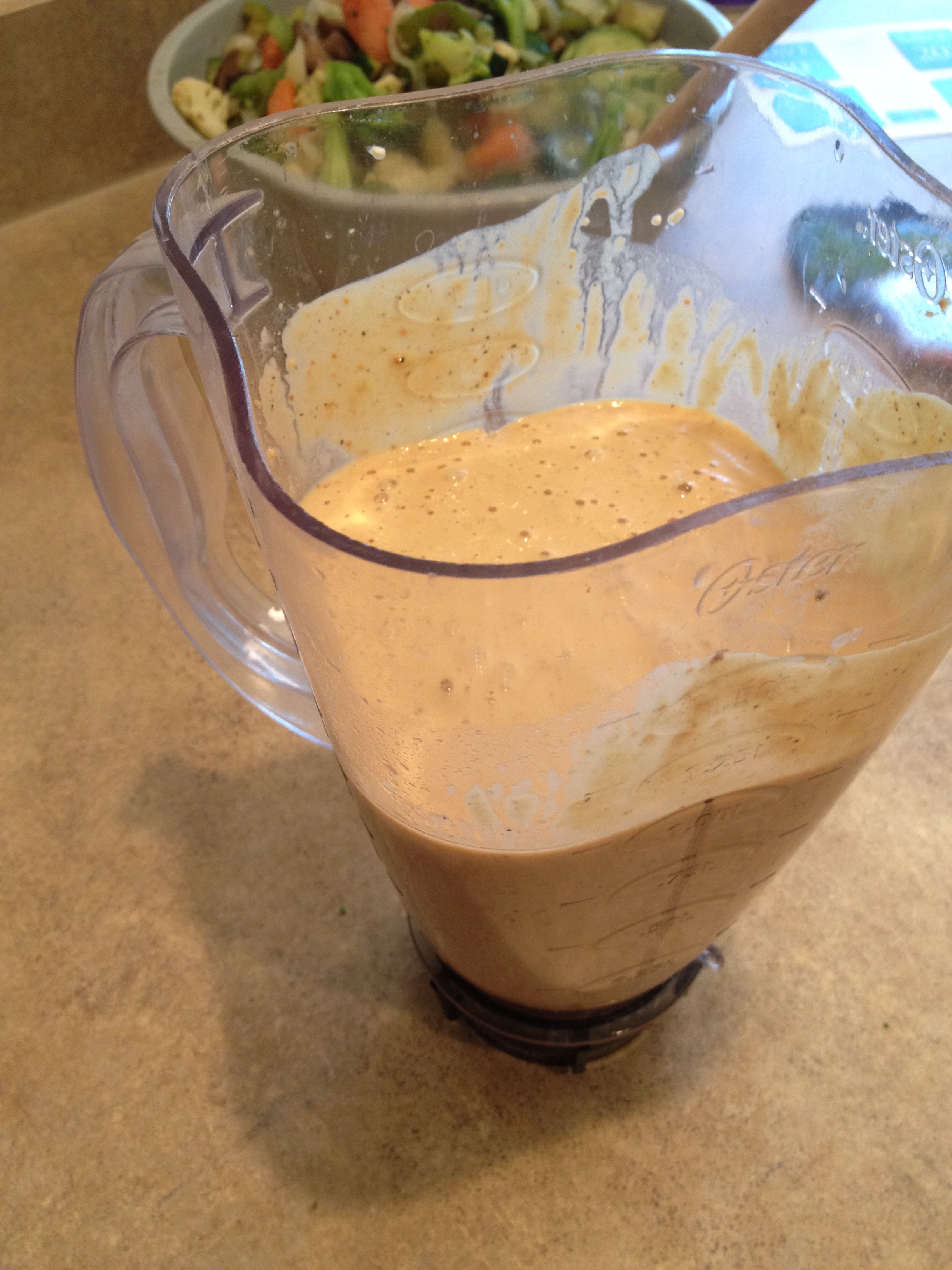 4. Drain tofu then dump in blender with rest of ingredients. Once garlic is done carefully squeeze into blender. Blend until liquid and everything is combined.