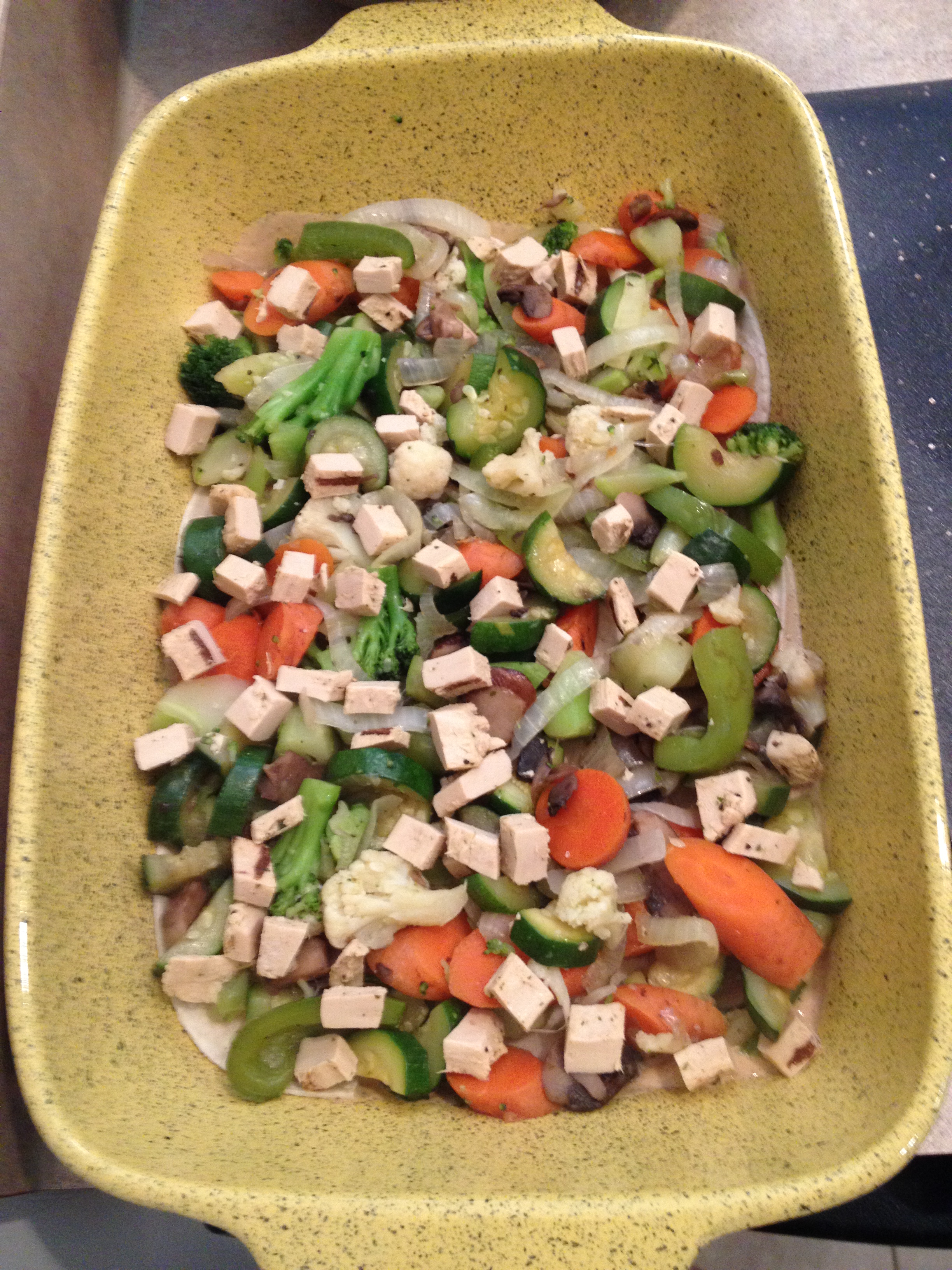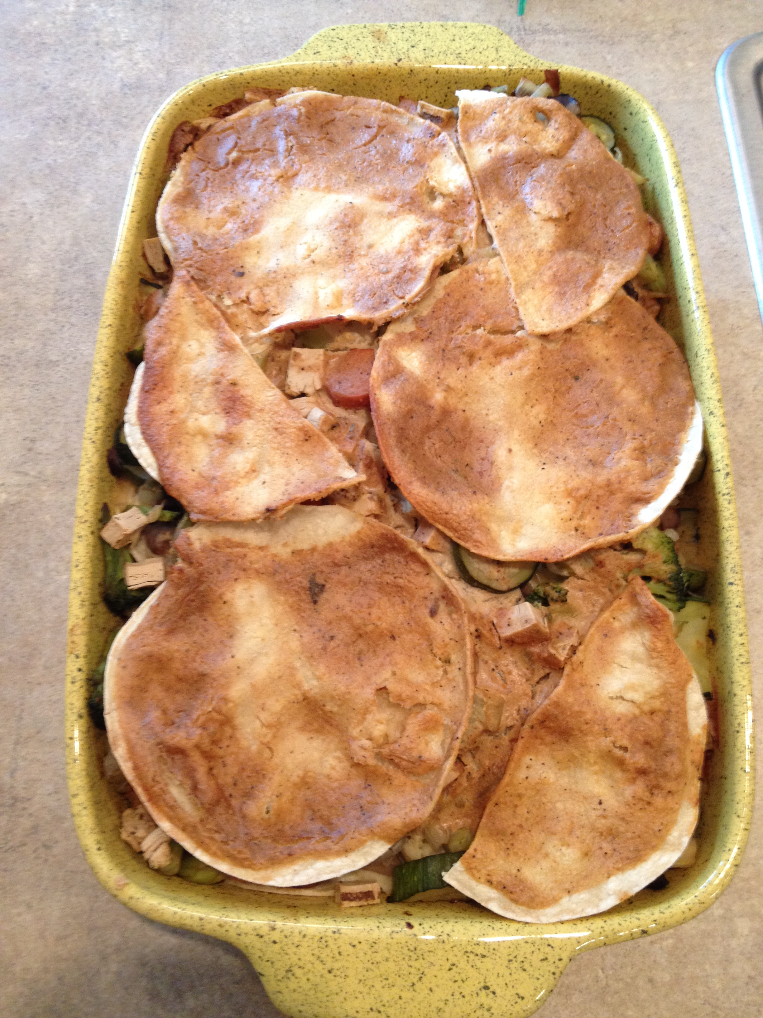 Start by roasting the garlic – cut the top off the bulb then place in middle of parchment paper and sprinkle a little olive oil and black pepper over bulb. Bake at 375 degrees for 40 minutes. While garlic is roasting slice all veggies thinly then start sauteing in batches. I use the term “saute” loosely; I poured a little veg broth into the saute pan then added a small portion of veggies and just started sweating them. I didn’t want the veggies to be mush, just took the hardness out of the veg then I spooned out the done ones into a bowl and added more. I just continued doing this until all veggies were done and in a large bowl. While the veg was doing its thing I drained the liquid from the tofu and dumped the tofu into the blender then added the rest of the sauce ingredients. Once the garlic was done I carefully squeezed the cloves into the blender – it’s hot, and yes your fingertips will get toasty. Blend until liquid. Start the lasagna process by pouring some sauce on the bottom of the pan then layer tortillas, veg, chicken, sauce, repeat until everything is layered. Bake at 375 degrees for 40 minutes. Enjoy!