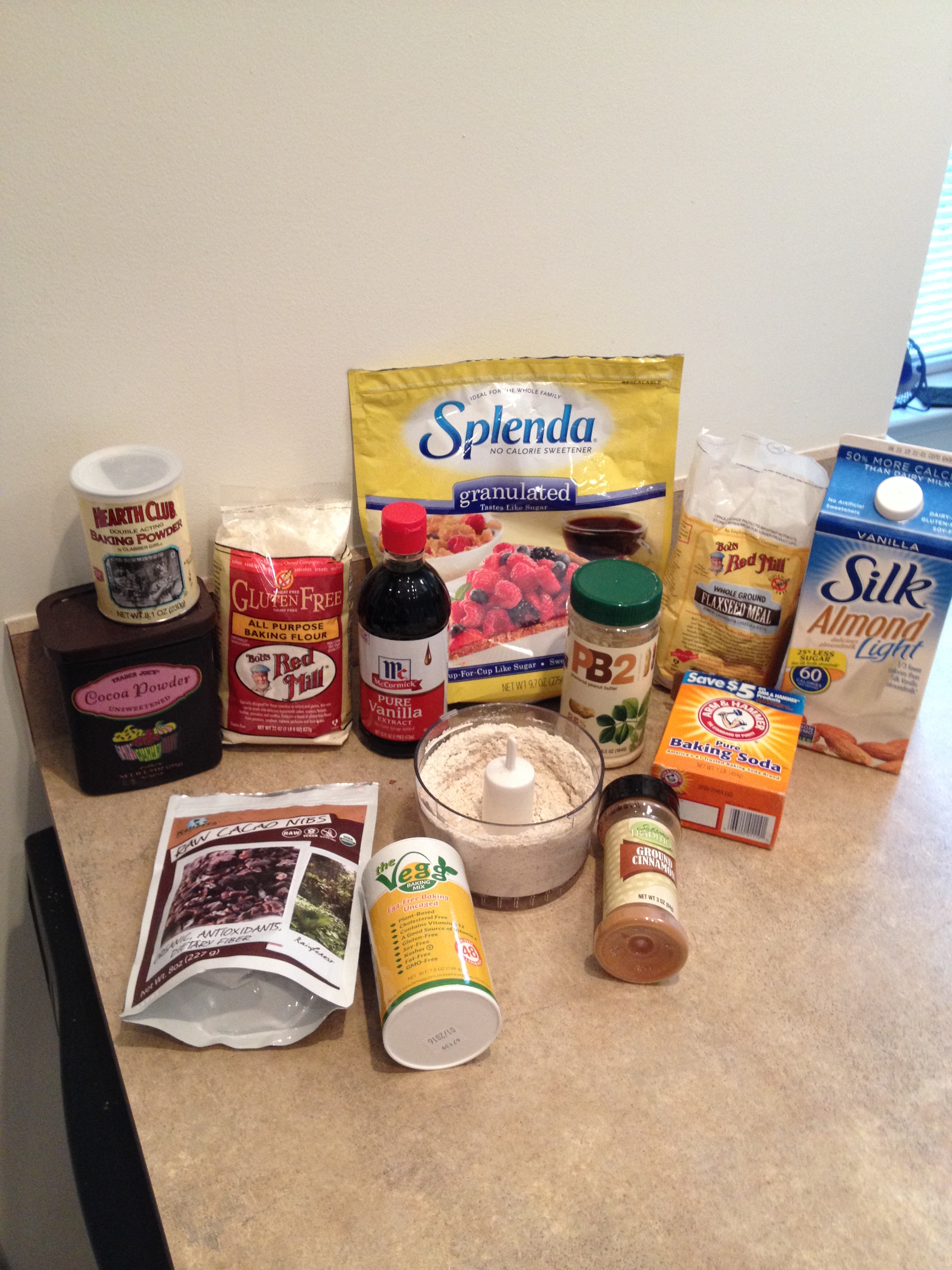 Process one cup oats in a small food processor into flour then dump into a large bowl. Add the gf flour along with the peanut and cocoa powder, flax meal, baking powder and soda, and cinnamon. Mix until combined. In the same small FP, process bananas with vanilla extract until liquid mash then dump into a small mixing bowl. Add Splenda then mix well. Add 1/3 cup milk and Veggs and mix again. Dump wet mixture into dry and mix until just combined. Add nibs and rest of mix then mix again. Spoon into large muffin tins 3/4 way full, then into mini-muffin tins almost full. Bake at 350 degrees. Large muffins for 15 minutes and 13 minutes for mini-muffins. These muffins rose like champs! Enjoy these babies warm!!