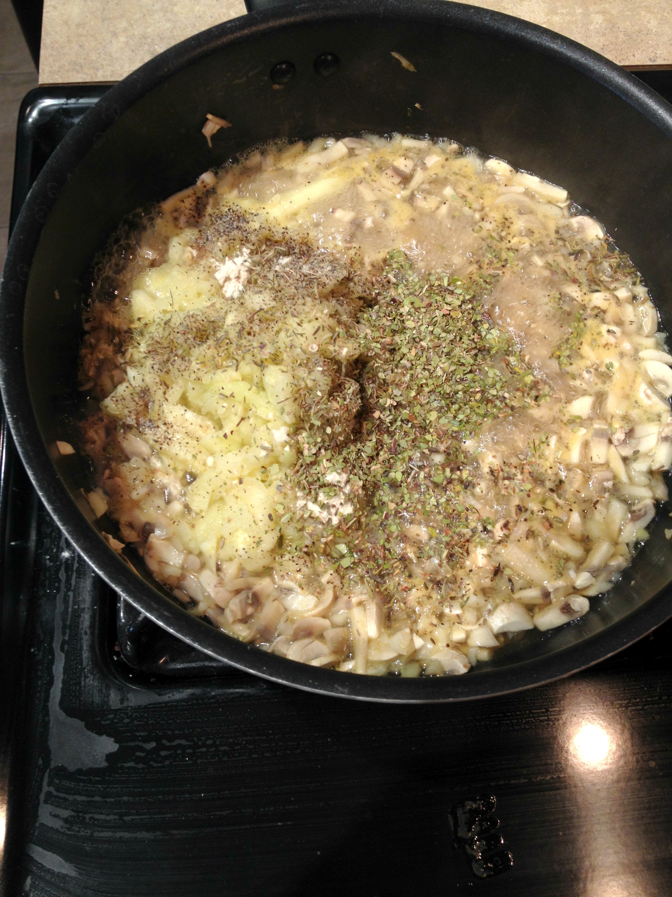 5. In a saute pan on medium heat pour in veg broth, garlic, and mushrooms.