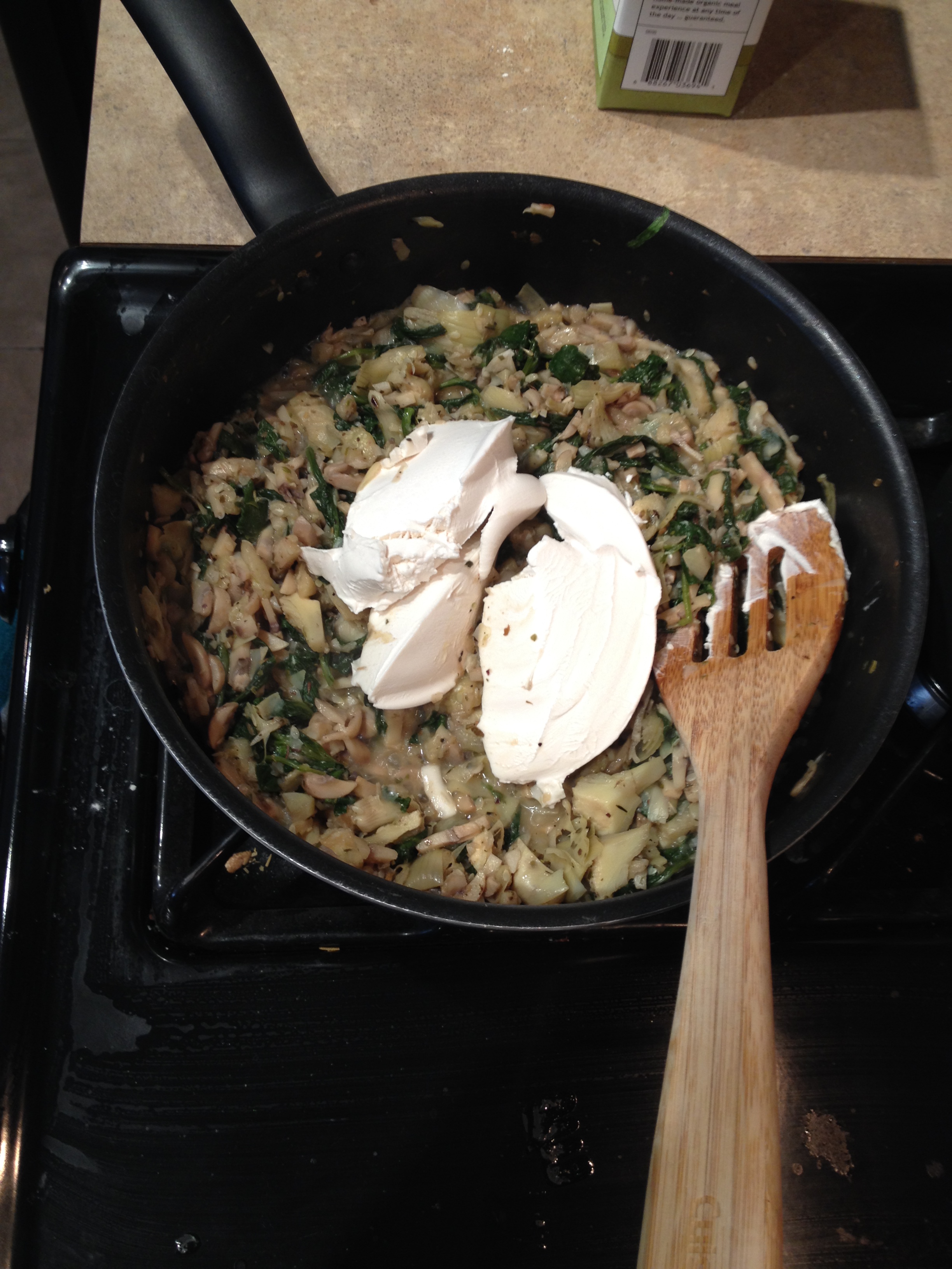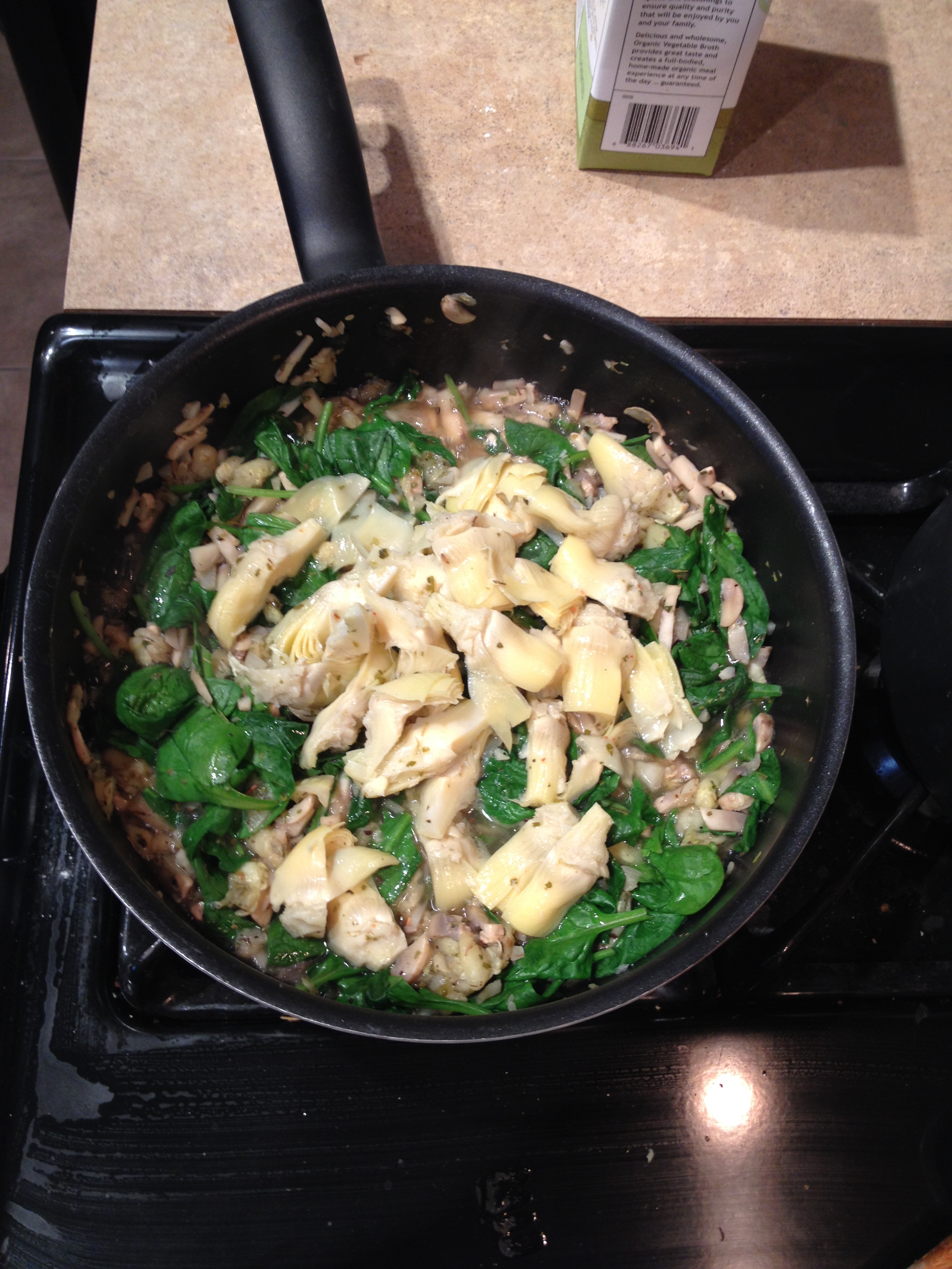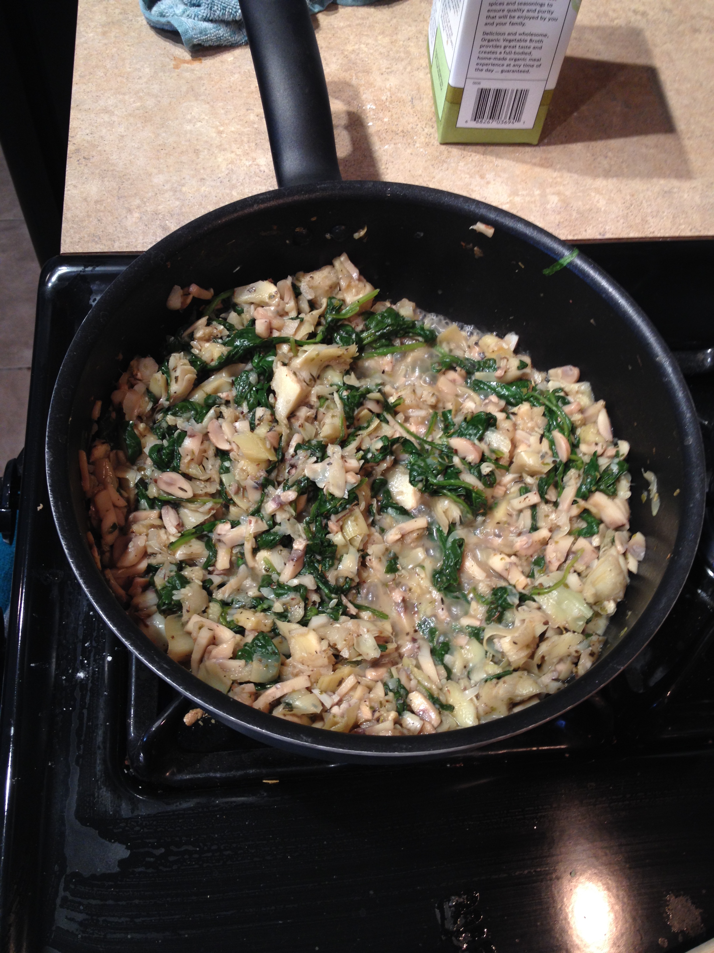 9. Let spinach wilt then drain artichokes in the sink then add hearts to pan and mix using the spoon to break Vegan and Gluten-Free Spinach Artichoke Zucchini Boatsapart artichokes.