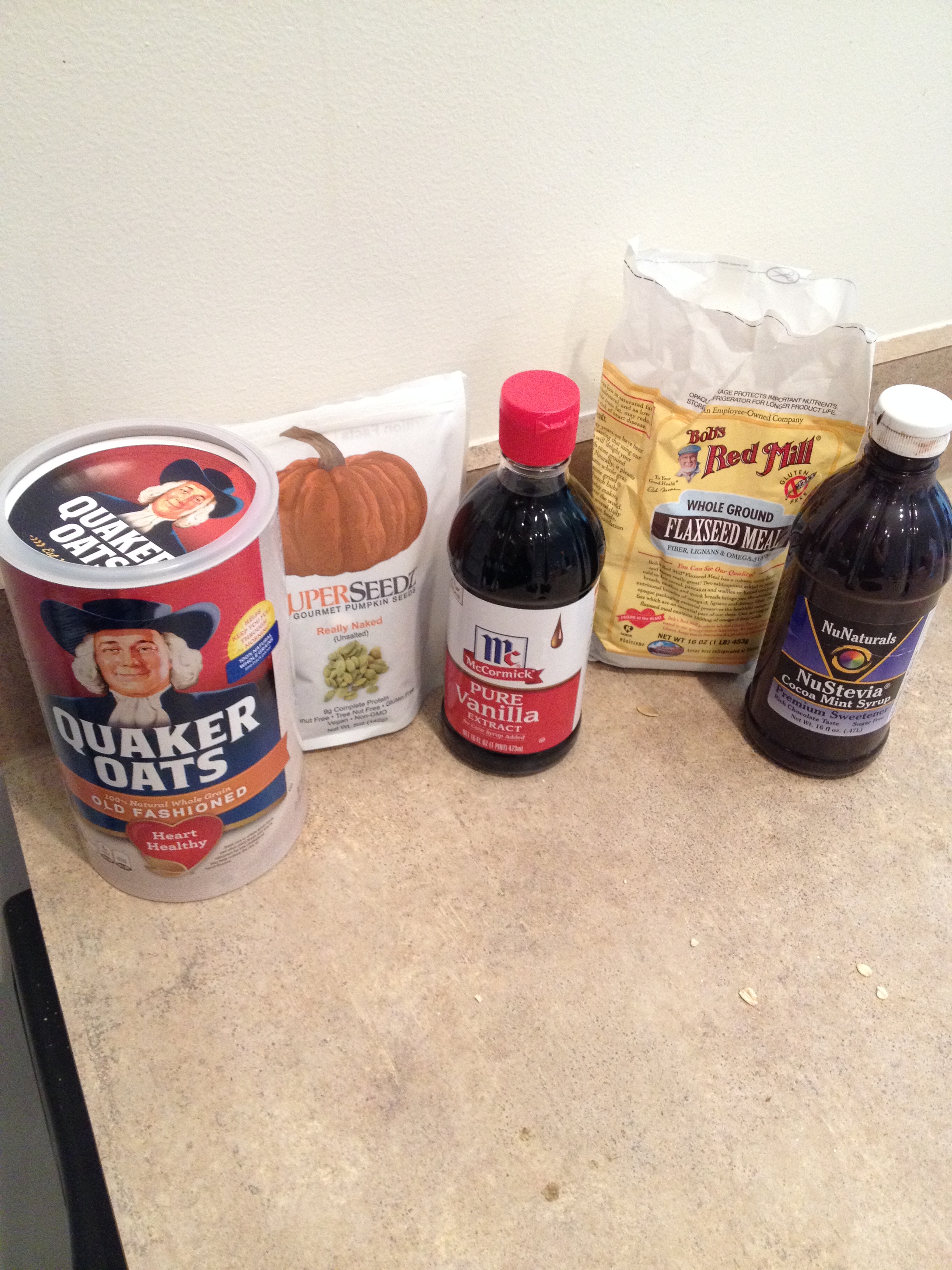 Start by processing your plain unsalted pumpkin seeds into a butter. I didn’t let mine go until smooth, I let it still have some texture to it. I started the processor and let it whirl until everything was broken up then added 3 tablespoons of water in intervals to get it into a butter. I dumped that into a small bowl and added the vanilla extract and mint chocolate sauce and mixed. Yum. In a larger bowl I dumped the oats and flax and mixed – if I had thought it out I would have dumped the minty butter into the large bowl and then dumped everything into just one bowl. Anyway – heat the minty mix for 30 seconds in the microwave then dump into the oats bowl and mix. Lay parchment paper on a small baking sheet then dump oat mixture onto sheet. Spread out and press down with the spoon. Bake at 300 degrees for 20 minutes then take out and break up with the spoon into large chunks. Bake 10 more minutes then take out and let cool. Enjoy!