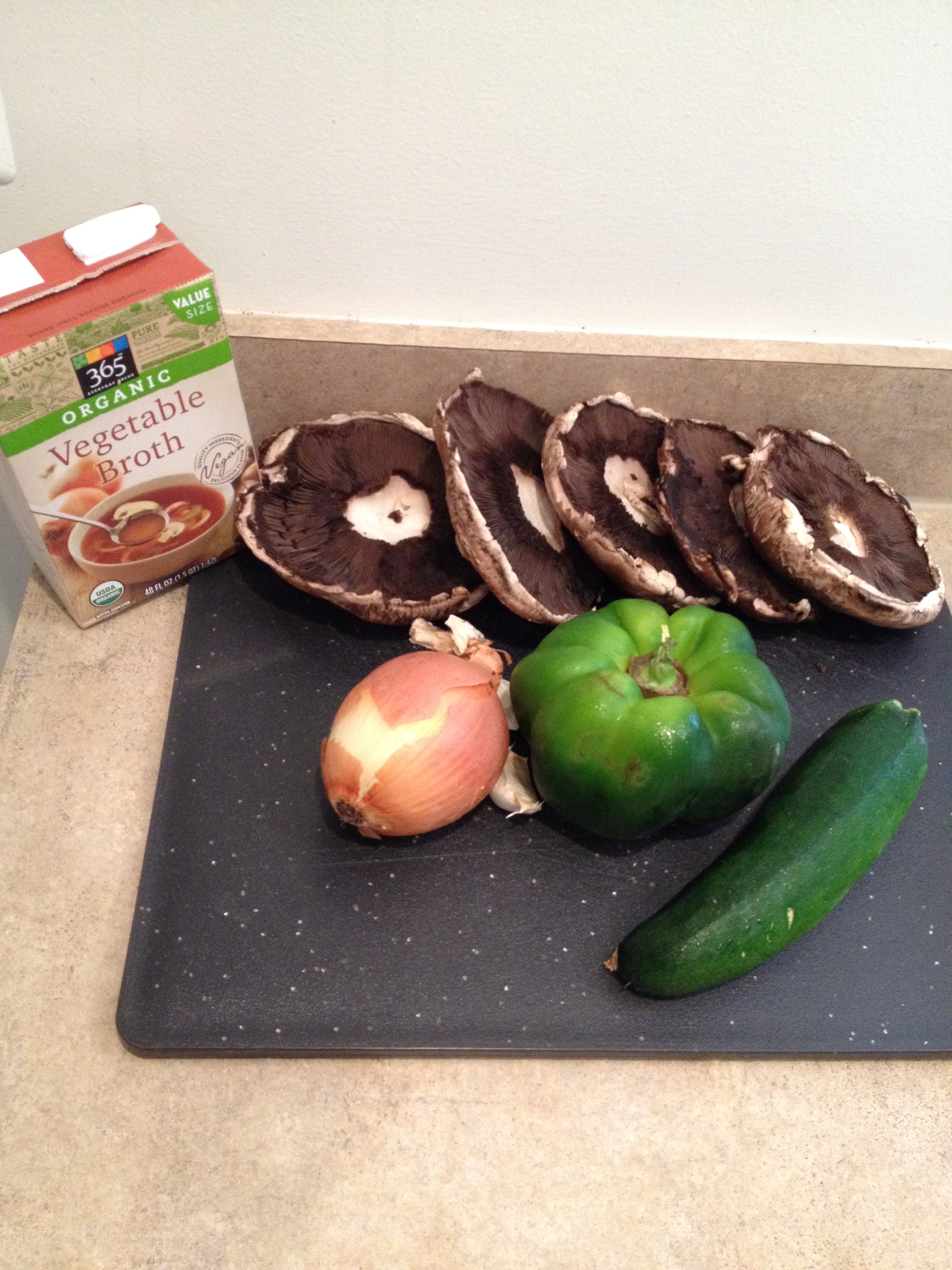 2. Pour veg broth into a saute pan and turn on medium-low heat and dump in veggies.