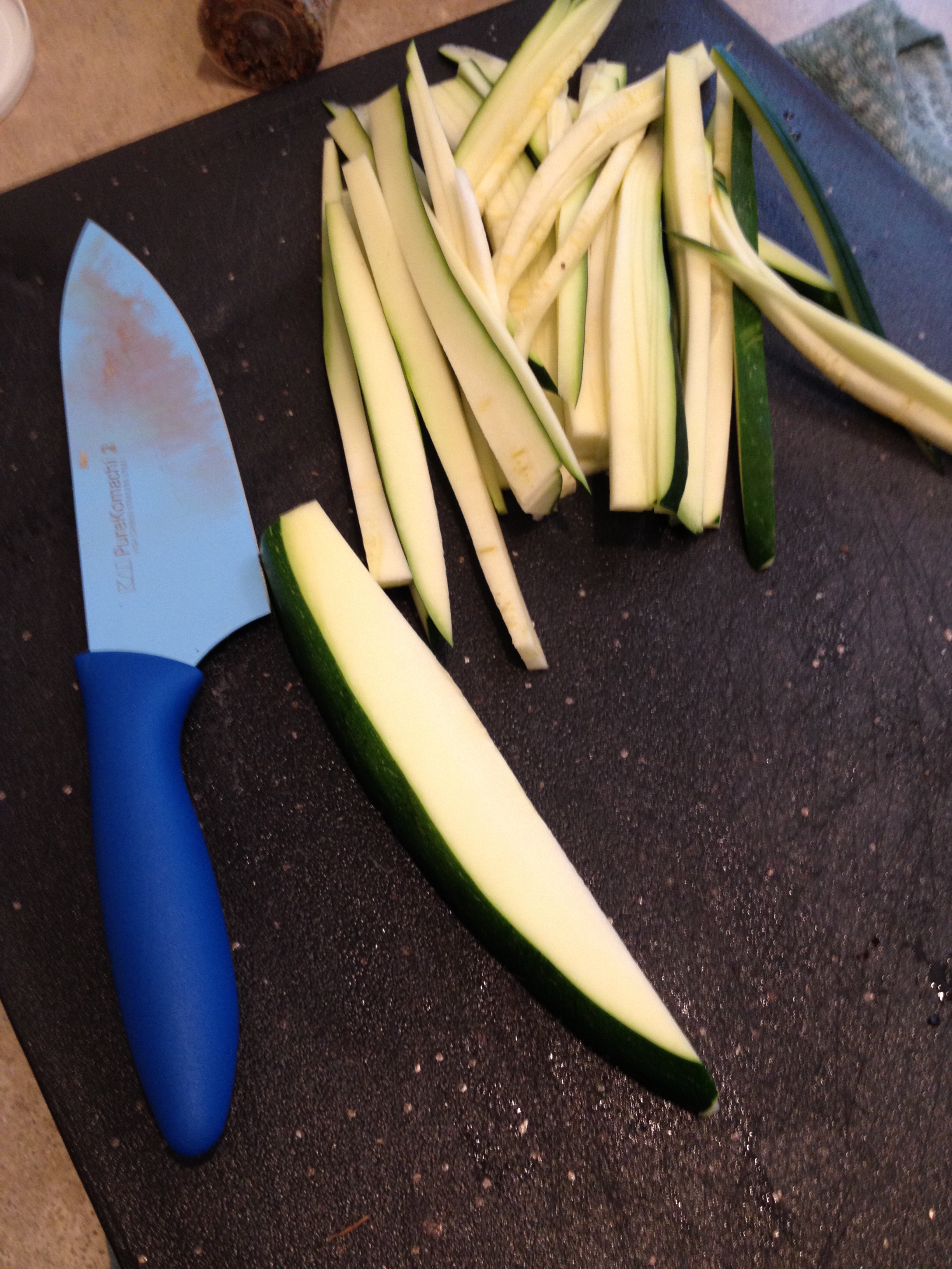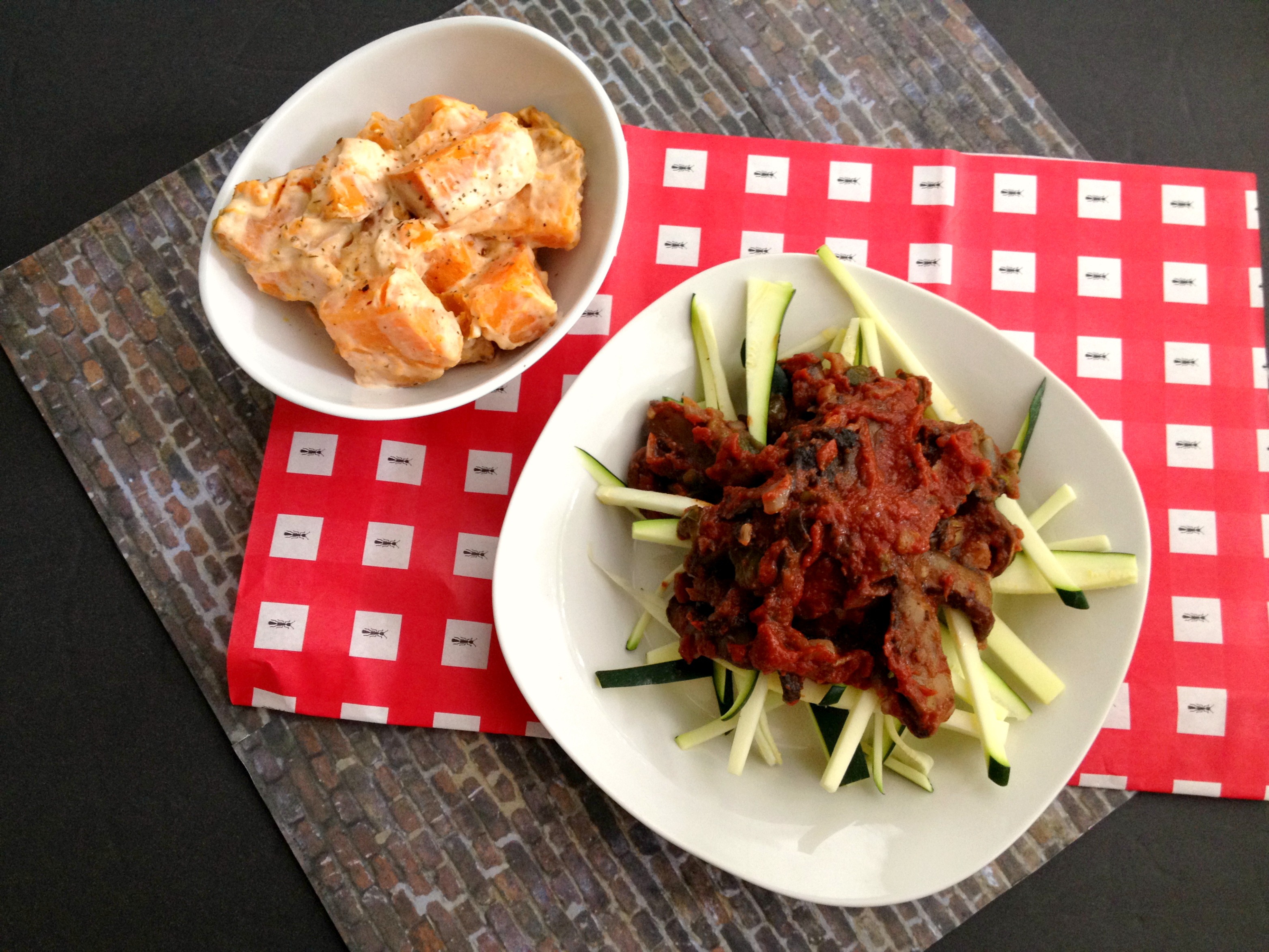With Memorial Day right around the corner, as well as summer crashing in on us, I figured it was time I did a potluck-like post. Whenever my family has a get-together I either end up having a store-bought veggie burger or just pick at side dishes. Sometimes we get a portobello mushroom and toss it on the grill along with everyone elses burgers. But I wanted to make a main dish that would be easy to knock out while chit chatting with people and also one that could be made ahead of time and then just heated up. It’s too easy for words! Just chop your Vegan BBQ Pulled Portobellos and Sweet Potato Saladonion and pepper and mince your garlic. In a saute pan pour half cup veggie broth and dump in veggies then turn the heat to medium-low and put the lid on to sweat out the veggies. While veg is heating, clean mushroom caps then use a spoon to scrape out the ribs of the mushrooms. Slice mushrooms very thin then dump into saute pan. Put lid back on only until the liquid has come out of the mushrooms then take the lid back off and mix. Let saute until all liquid is gone and veggies are starting to brown. Turn heat to low then pour in homemade BBQ sauce and mix until everything is combined and heated through. I had gotten a zucchini and used a sharp knife to slice it into thin strips to make “noodles” since I don’t have a zoodle-maker. This would have been awesome as a sandwich too!