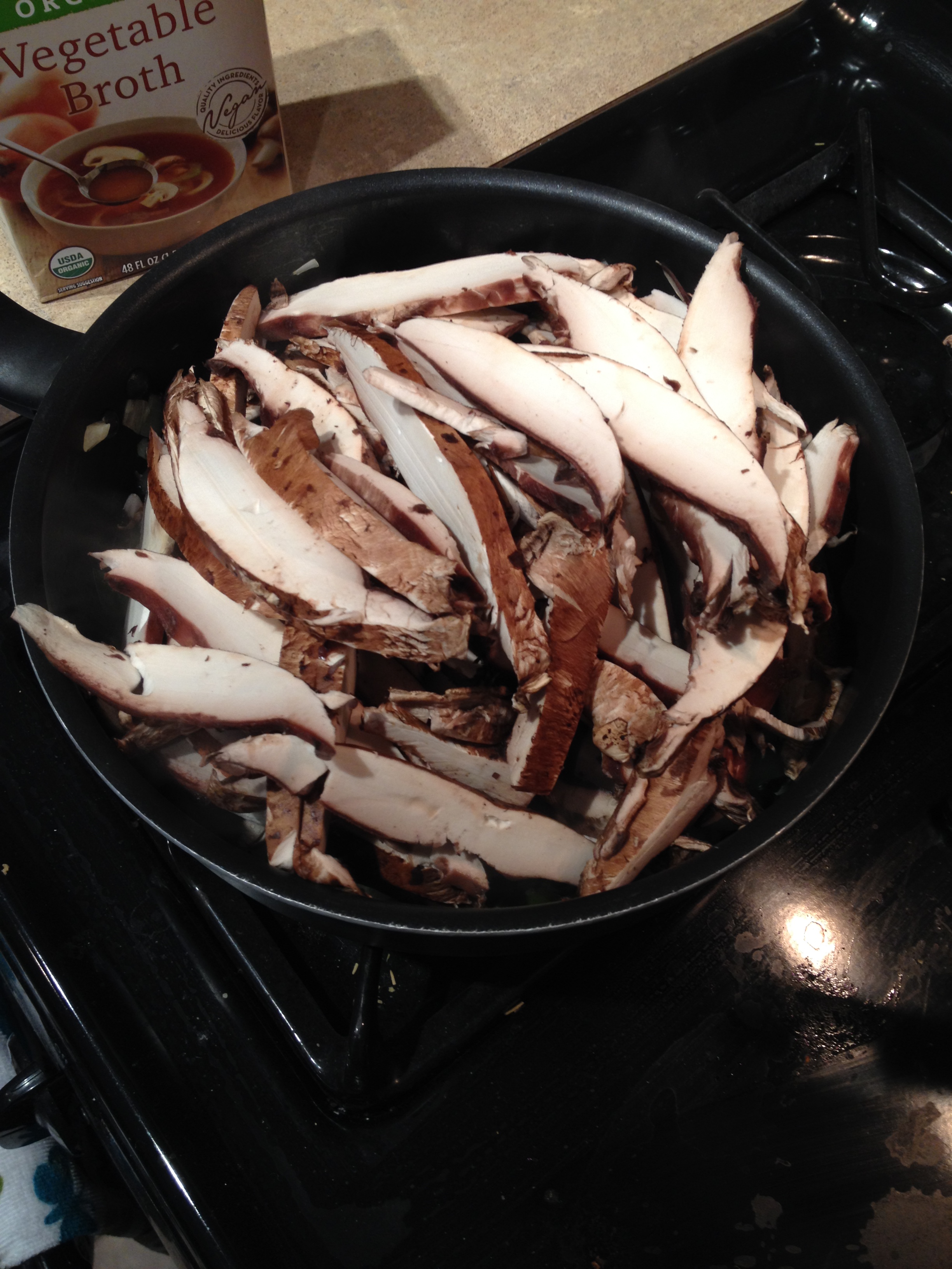 5. Dump mushrooms into saute pan then put the lid on to pull liquid out.