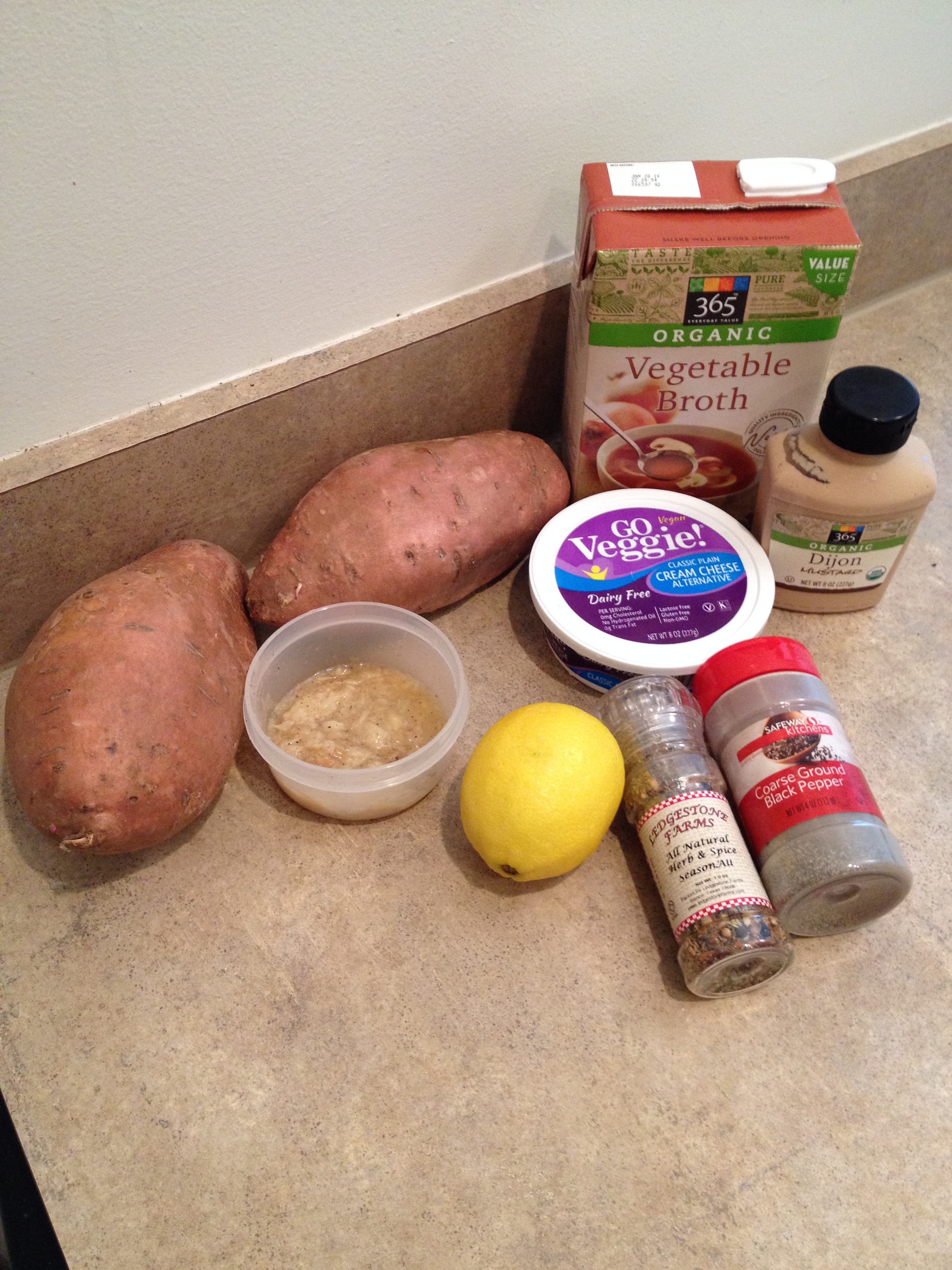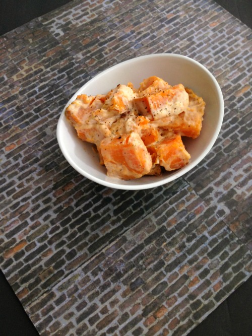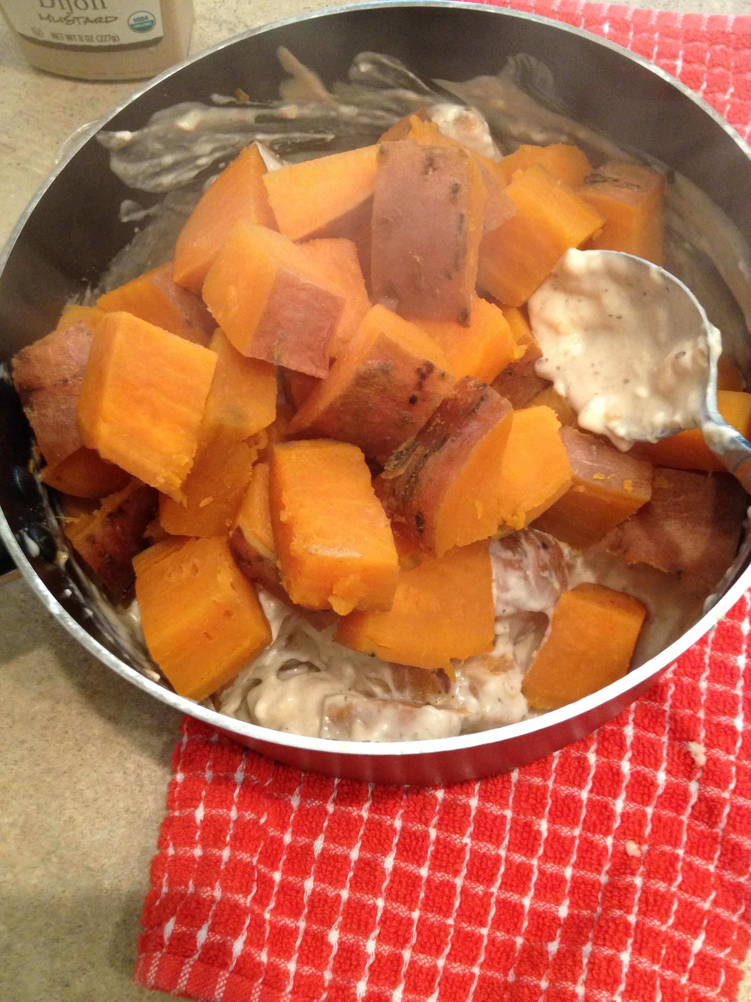 You can’t have a bar-b-que without potato salad right? My mom makes the best potato salad and it is her go-to potluck dish. It is loaded with white potatoes and mayonnaise. But since I don’t like the taste of vegan mayo I decided to just go ahead and make a different type of salad, one with sweet potatoes and a tangy cream cheese sauce. I unfortunately don’t have a potato peeler so my potatoes didn’t get peeled, but I would recommend peeling the potatoes before chopping them into small like-size pieces. Also, a few weeks ago I had roasted a few bulbs of garlic and froze them – just roasted them like normal then squeezed the garlic into a small plastic container and used a fork to mash it up then tossed it into the freezer. Perfect for this salad! Start by washing and peeling your potatoes then chop into smallish pieces and boiling until just fork-tender. Drain the potatoes and leave in the strainer. In the hot pot dump in the sauce ingredients and mix then dump in the potatoes. Mix until combined. Enjoy this salad hot or warm. It is good cold, but awesome hot!