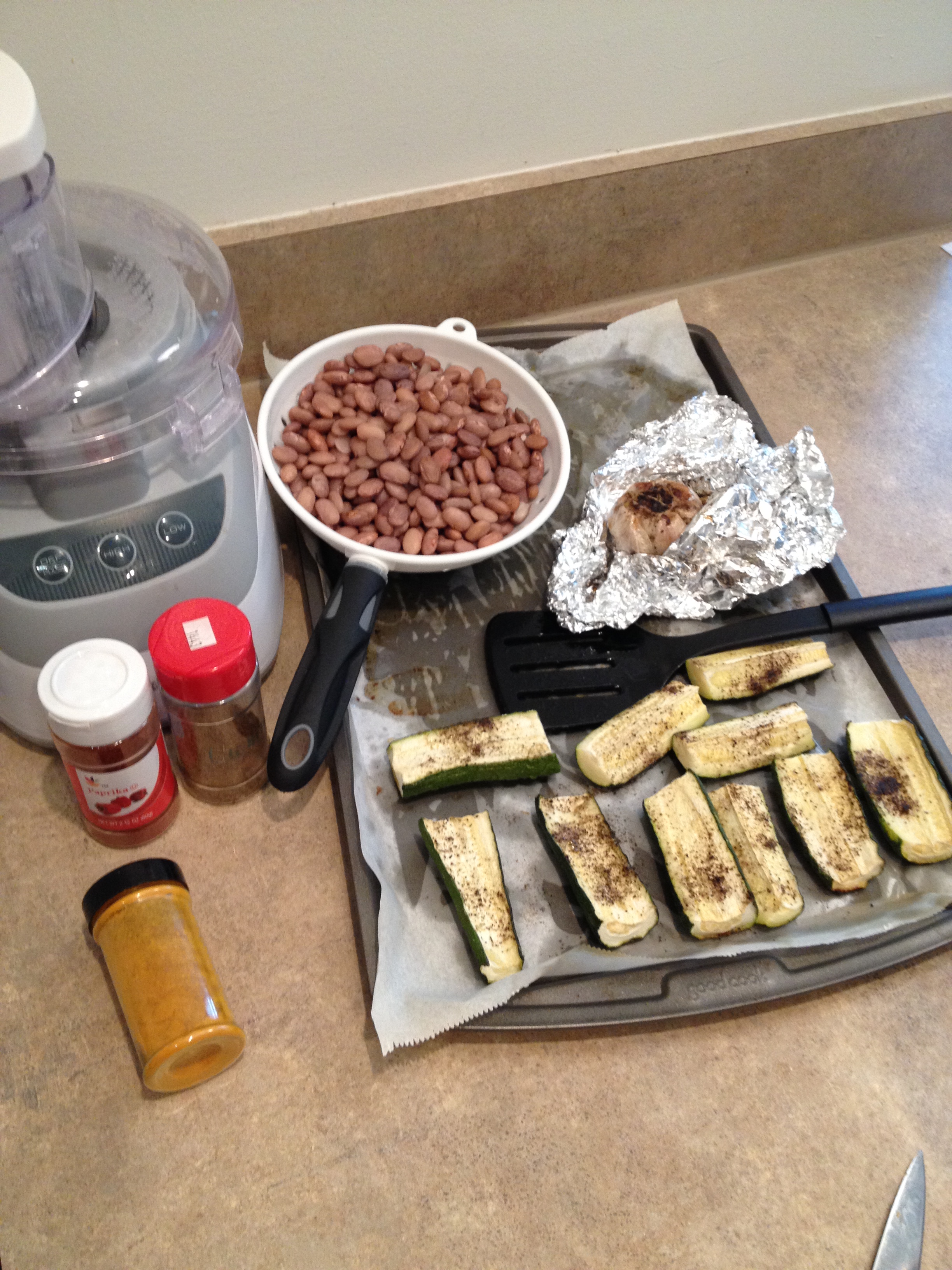 6. Dump cooled beans, zucchini, and garlic into food processor with spices.