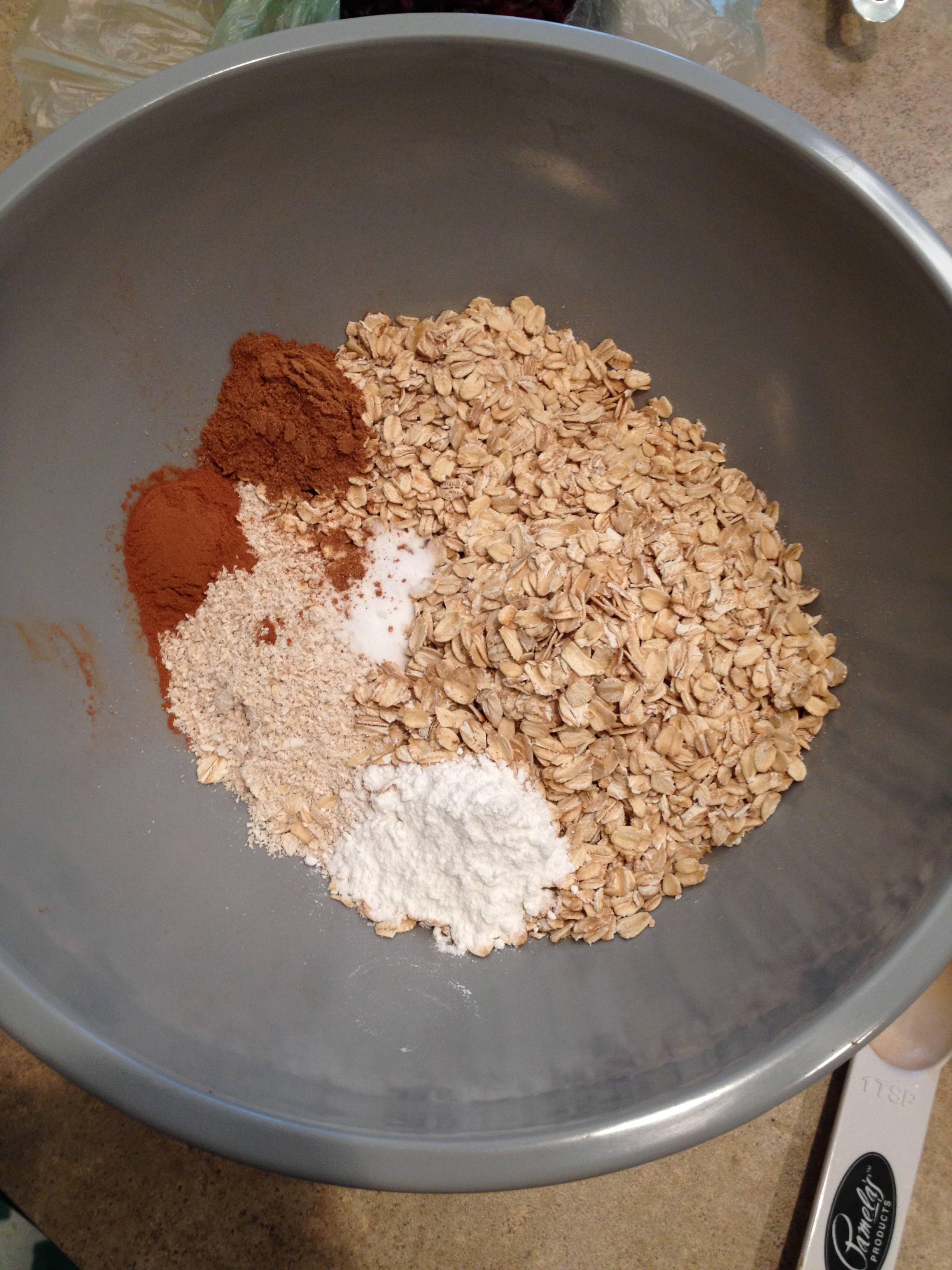3. In a large mixing bowl add flour, oats, baking soda and powder, cinnamon, and 5 spice and mix.