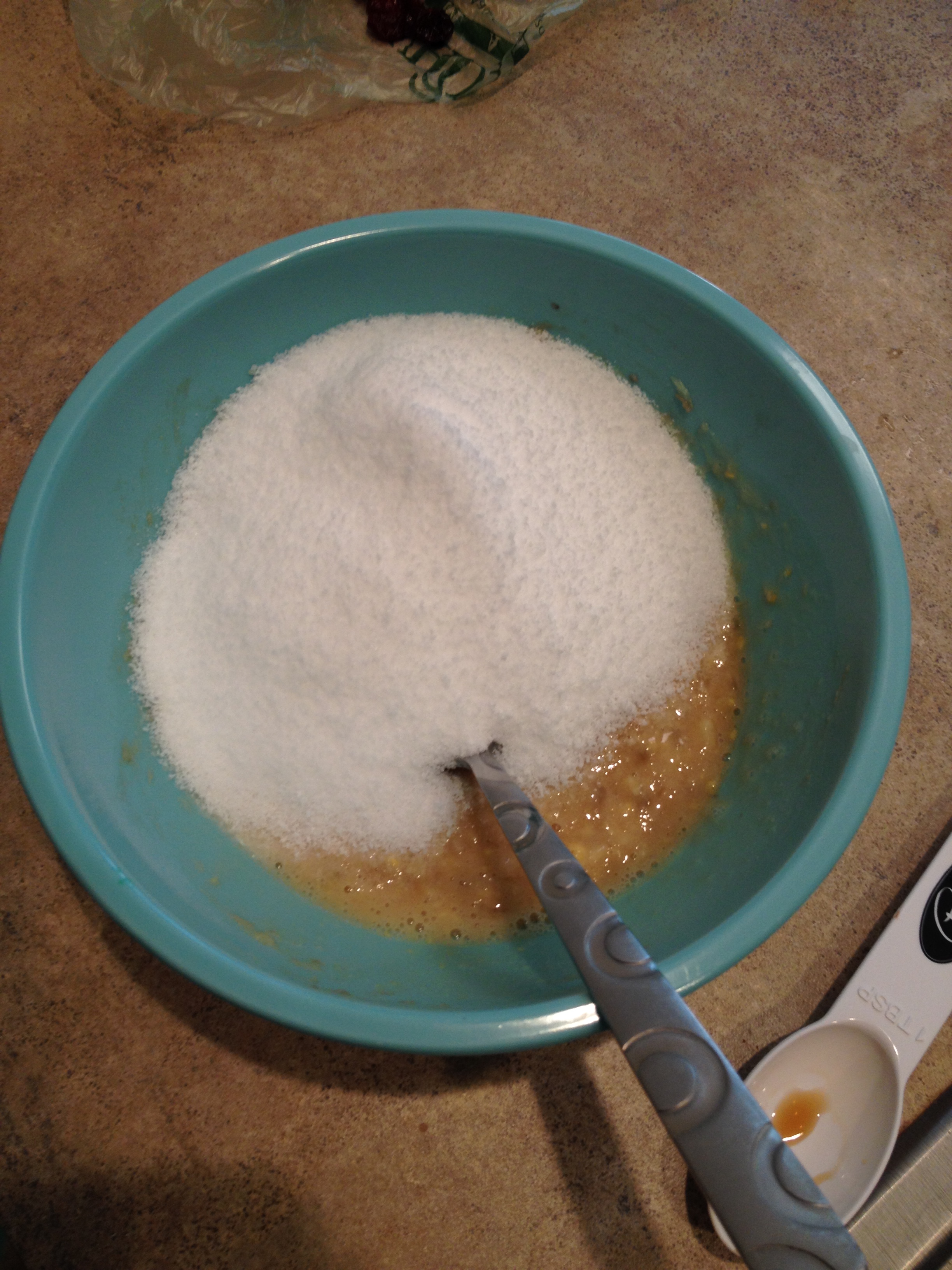4. In a small bowl mash banana with vanilla. Mix Vegg with almond milk and add to bowl along with Splenda. Mix then dump in large bowl.