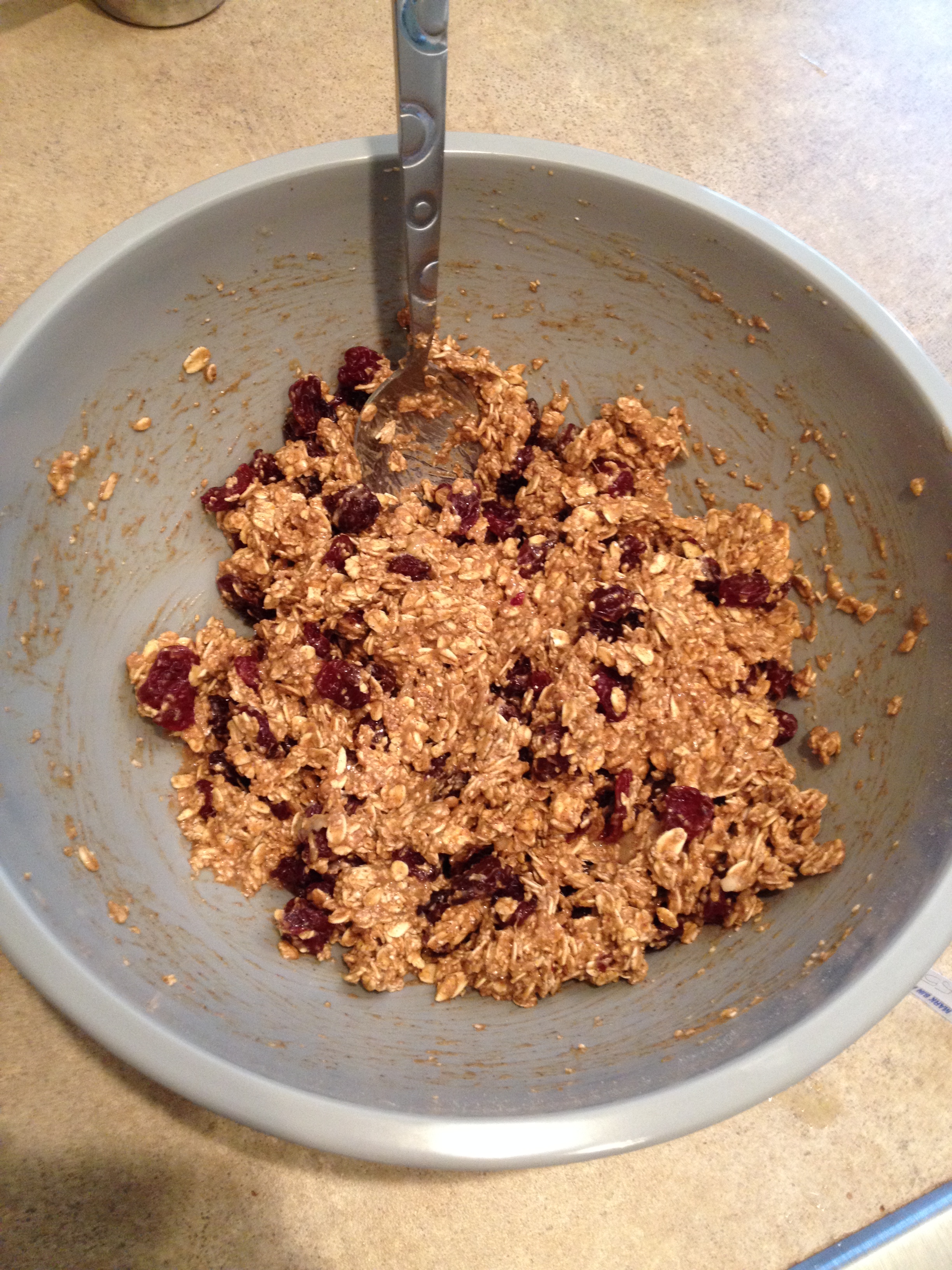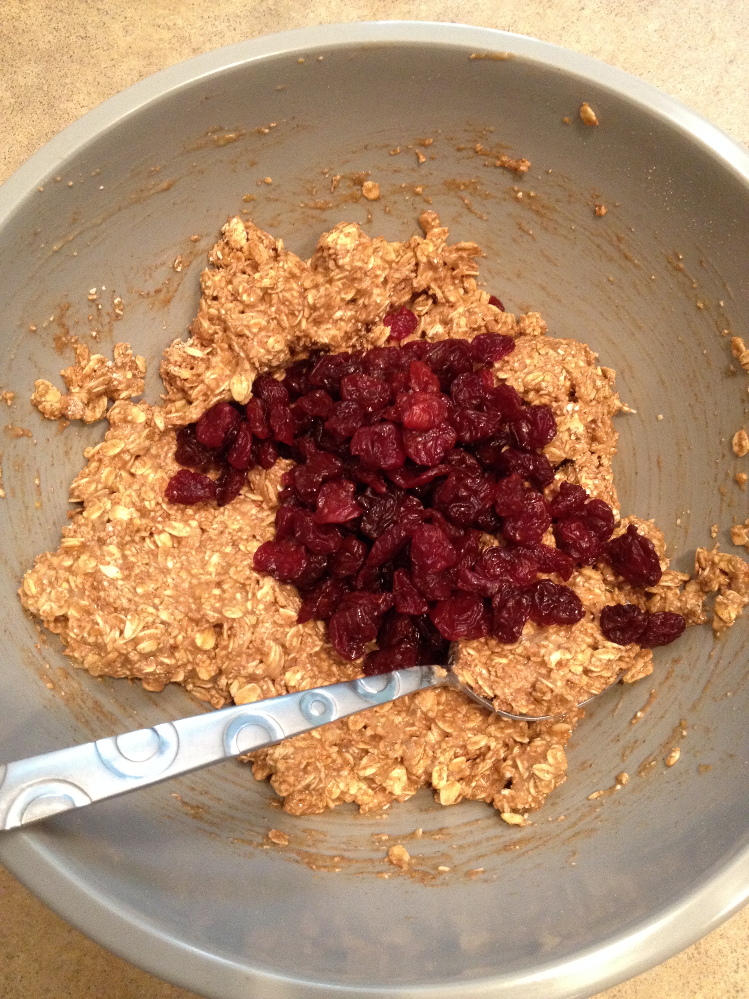 I didn’t have oat flour so I ground my own in my handy-dandy small food processor. In a large bowl add the flour, oats, baking soda and powder, cinnamon, and 5 spice then mix really well. In a smaller bowl dump banana and vanilla and mash. My banana didn’t mash well so I microwaved it for 30 seconds then mashed, then microwaved 30 more seconds. Once warmed the banana was perfectly mashable. Mix The Vegg with almond milk in a small container then add Vegg, vanilla, and Splenda to bananas and mix well. Dump into oats and mix then add cherries and mix again. The batter will be pretty loose so I scooped up a small portion with the spoon then pressed the batter into the bowl of the spoon then pushed it onto the baking sheet. Normally I just dump the batter on the sheet not caring if the cookie is just a lump or how it looks, but I was trying for a flat cookie this time. And it worked. These flat licorice tasting cookies turned out awesome!