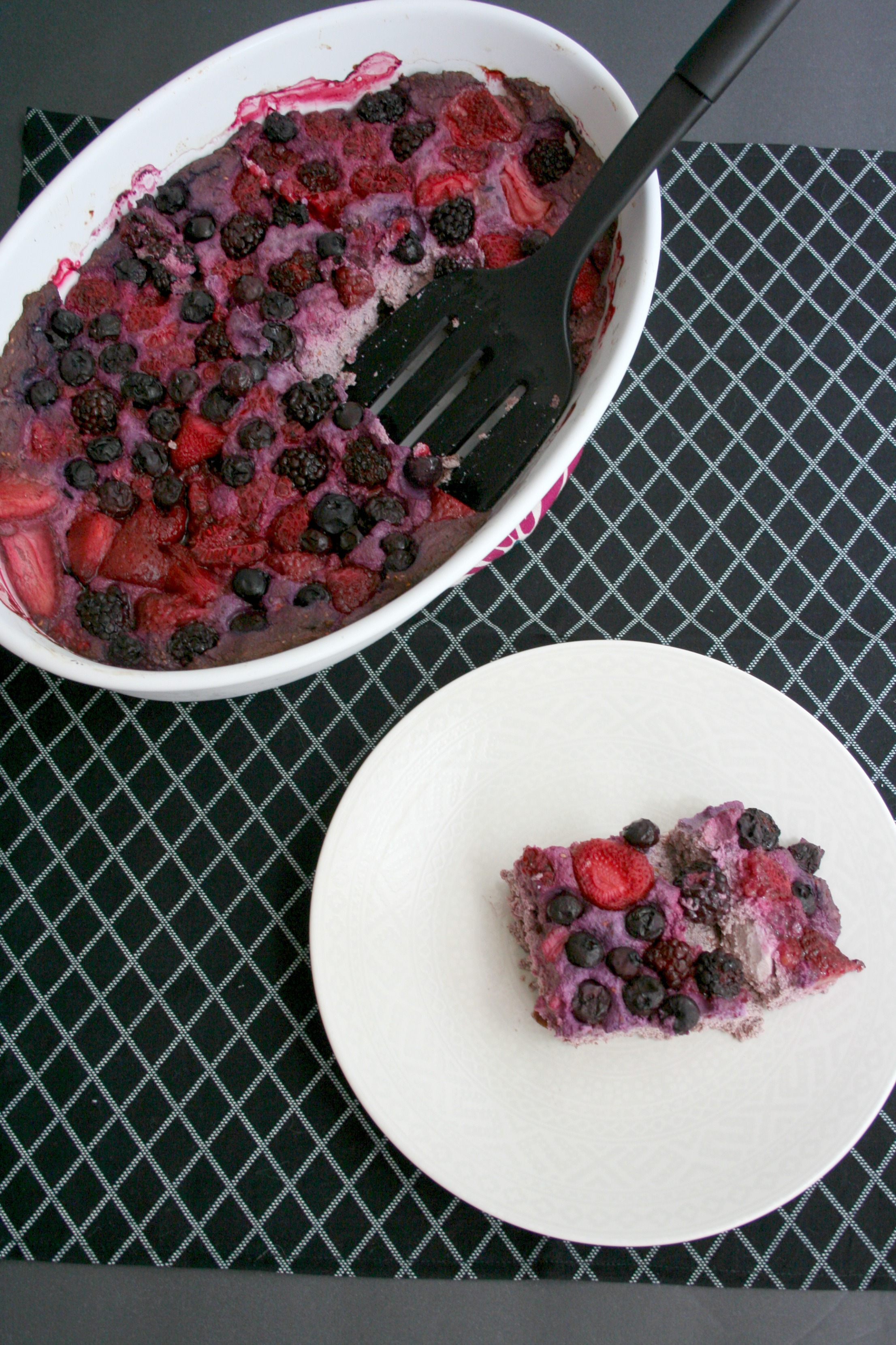 Some recipes just turn out right on the first try for me. I can make most savory dishes once and love them and write about them no problem; sweet or baked treats? Oh sheesh. The flavors are always great but they just take time to get right or become baking fails to never be heard from again. This fruity frittata? Well it took two times to get right, but the first one tasted so good that I didn’t mind eating it up, and I had no problem making it again – with a few tweaks of course. The first time I tried this I didn’t press the liquid out of the tofu, I just squeezed what I could out then added everything and baked. Well, all that extra liquid didn’t help to hold together the fruitatta so it was more the consistency of runny oatmeal. It still tasted awesome and was so sweet and yummy, and the consistency didn’t bother me, but I knew I could do better. The second go around turned out perfect – same ingredients as the last time but I pressed out my tofu between two plates and towels and weighed down with cans of pineapple for about 6 hours – it was in my fridge the whole time so no biggie. Then I whipped it up, baked it and oh. Yum. The baked whole berries and sweetened tofu? So decadent tasting! And filled with protein! The perfect breakfast after a workout!