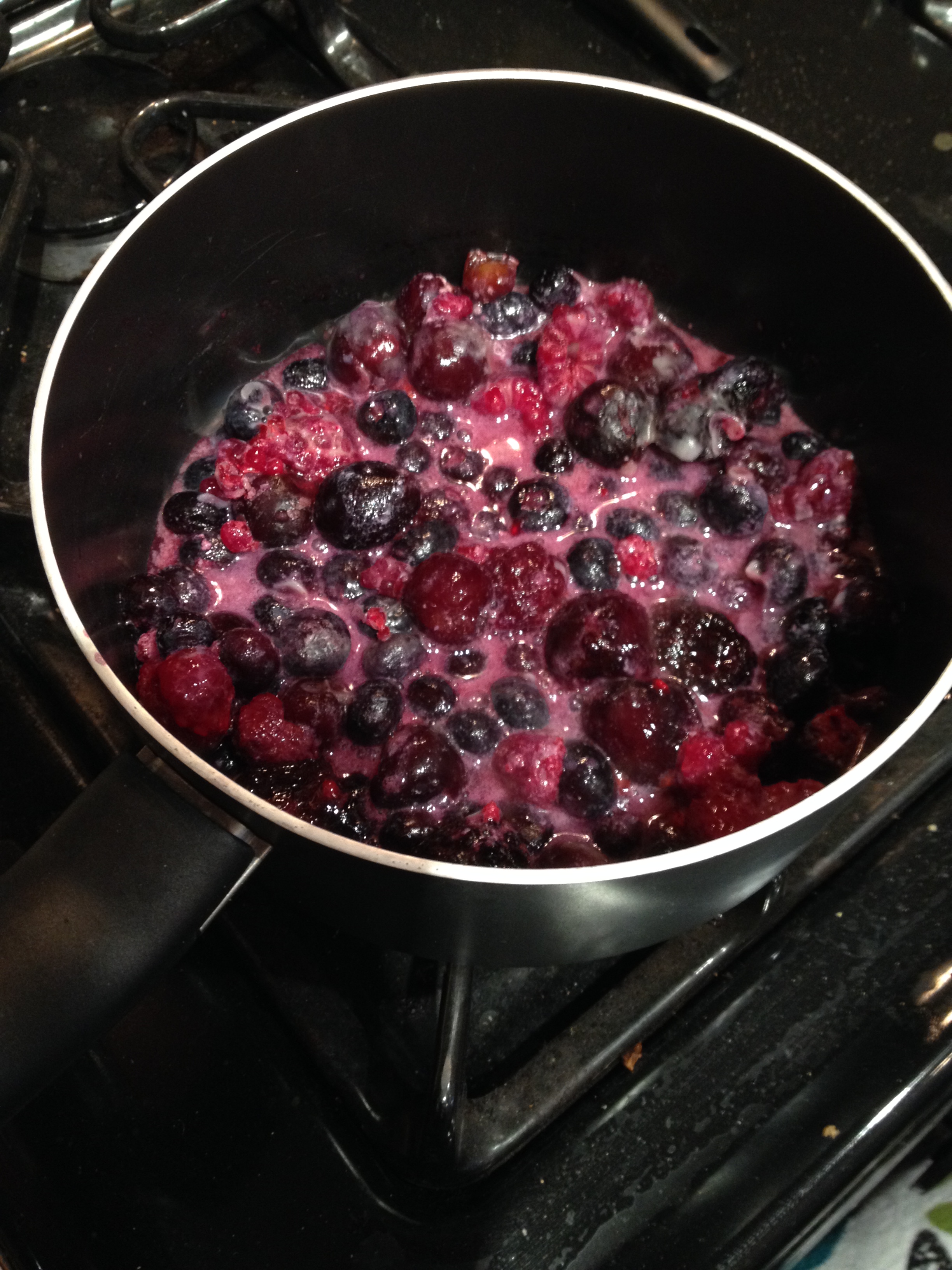 3. Dump one package frozen berries into a pot with the simple syrup and heat until berries have defrosted and are mushy.