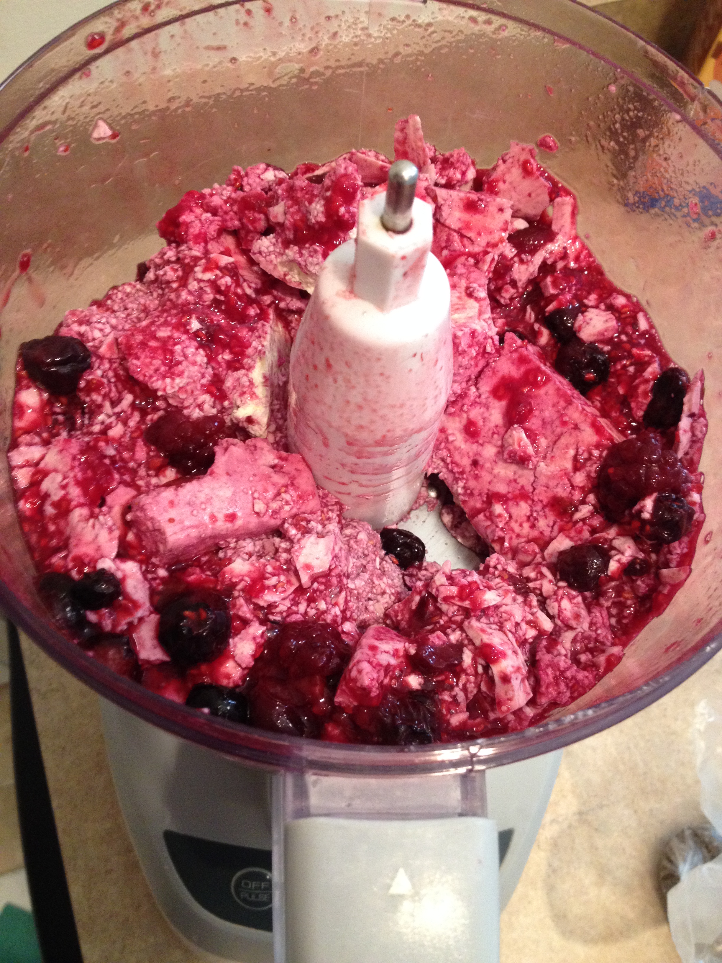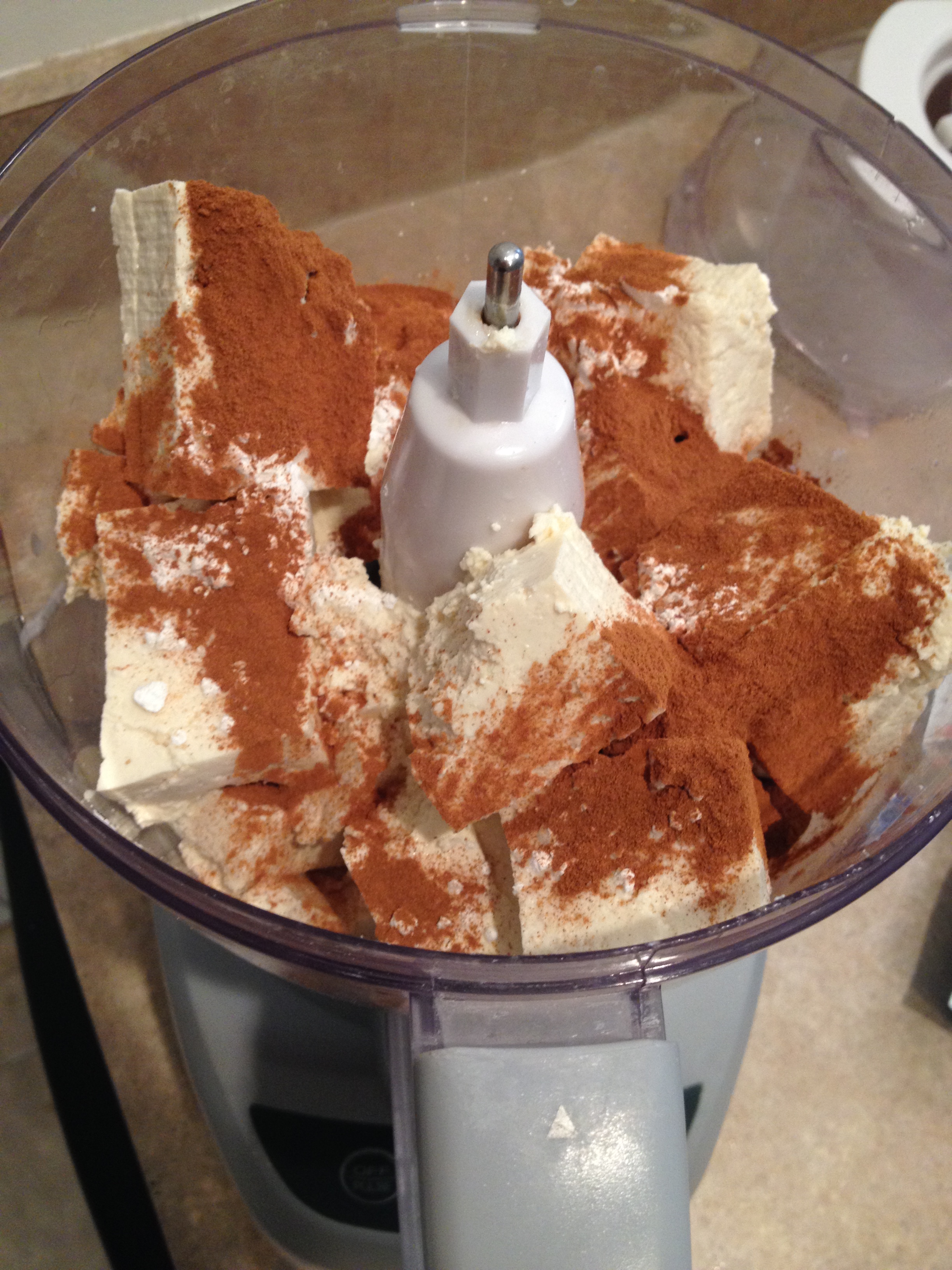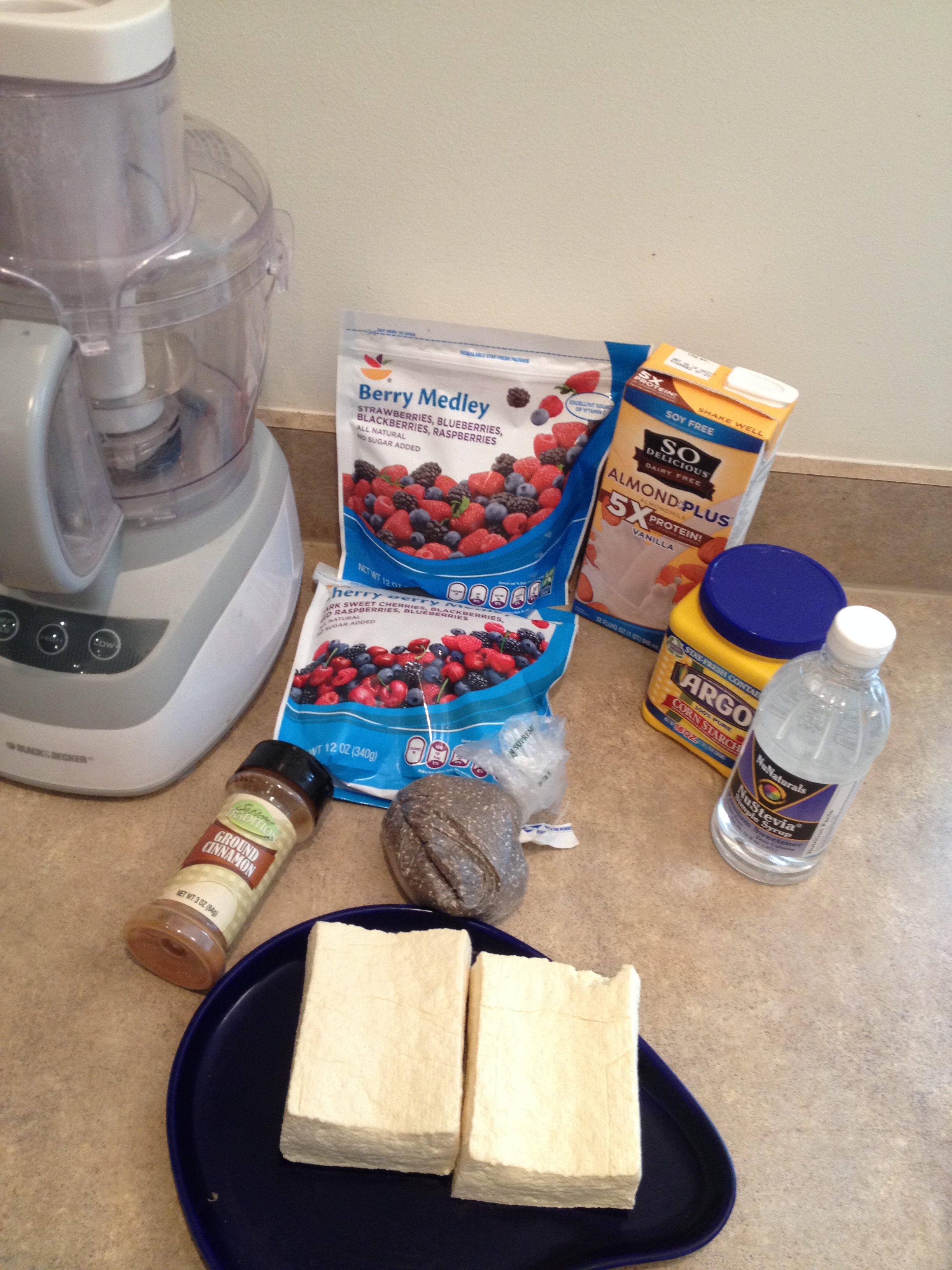 4. Dump tofu, hot berries and syrup, cinnamon, cornstarch and chia seeds into the food processor.