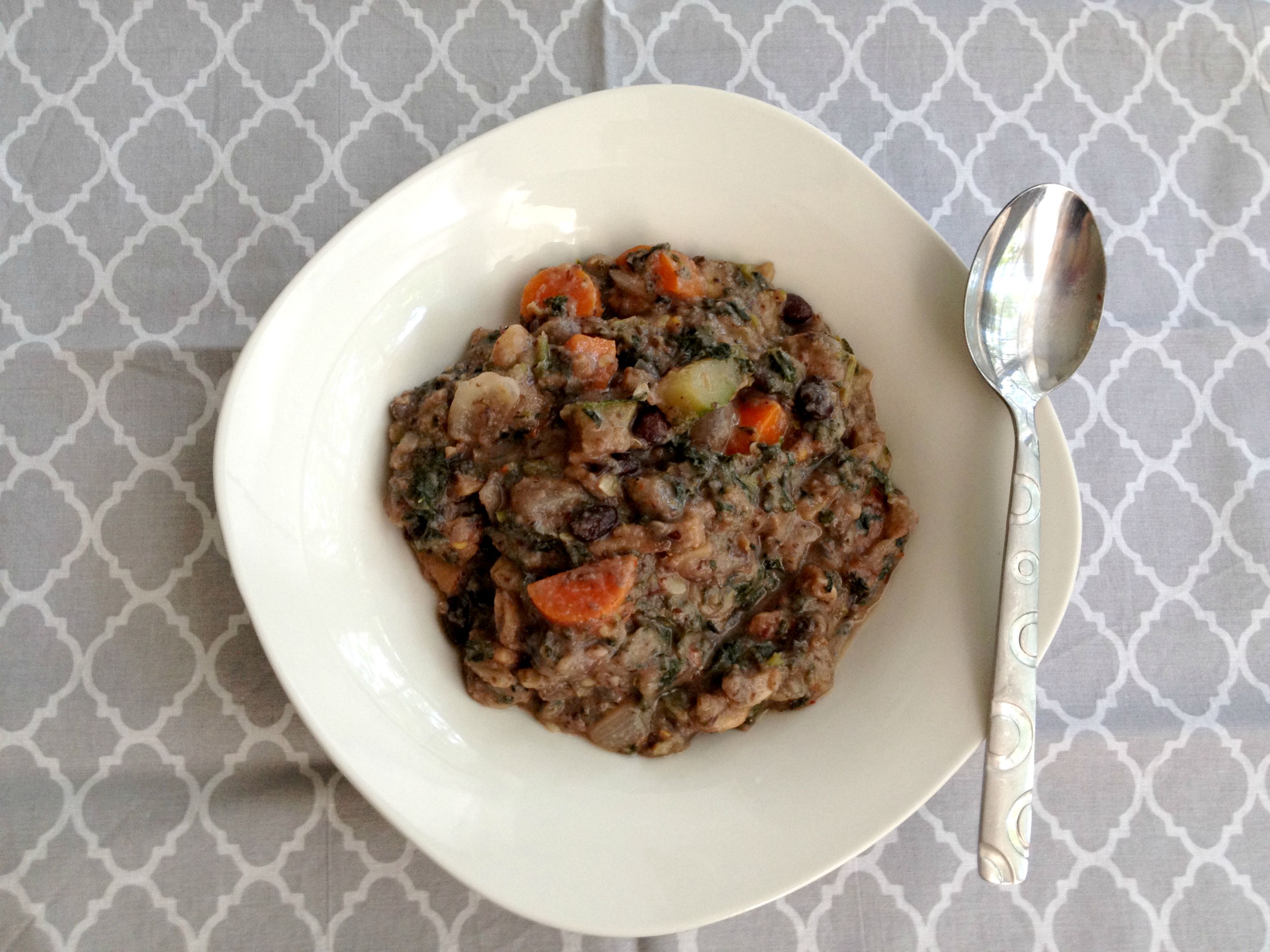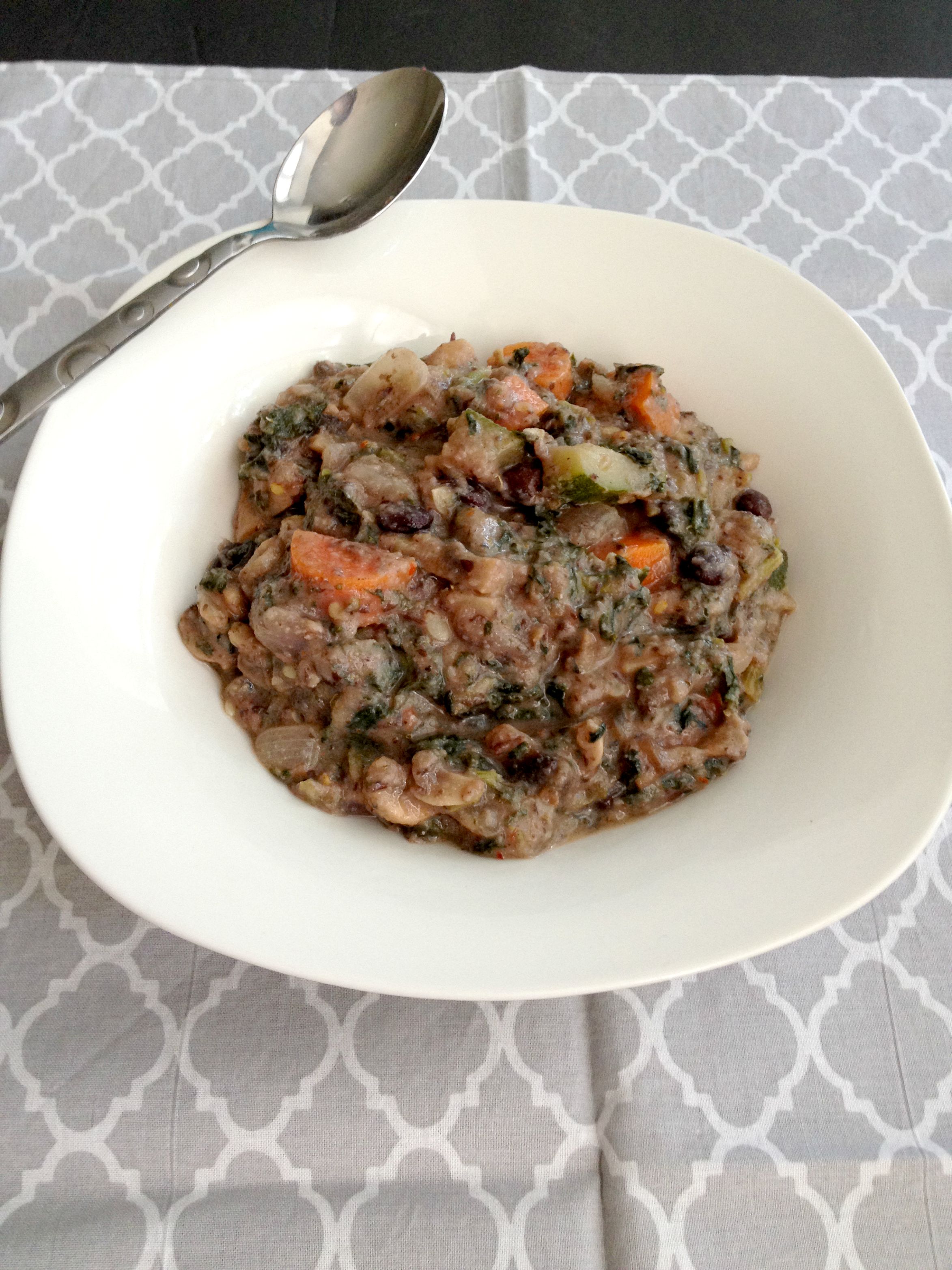 Start by soaking the beans the overnight. Rinse the beans and the wash out the pot. Dump the beans back into the pot and pour hot water over. Bring to a boil and then lower heat. Put lid on a little skewed and let simmer for 30 minutes. While the beans are working roast the garlic in the oven for 45 minutes at 350 degrees. Once softened rinse and let sit. Once beans are cool, defrost cauliflower and kale in the microwave then dump cauliflower first into a blender then add roasted garlic and milk. Blend until smooth then add two cups beans and blend. Add spices and blend then set aside. In a soup pot add olive oil and chopped onions and mushrooms. Saute on medium heat until mushrooms get liquidy then add in chopped zucchini and carrots. Once veggies are soft add kale and rest of beans and mix then add bean puree and mix well. There should be enough veg liquid in the pot that you won’t need to add any water but you can add water to loosen up if needed. Let cook about 30 minutes. Enjoy.