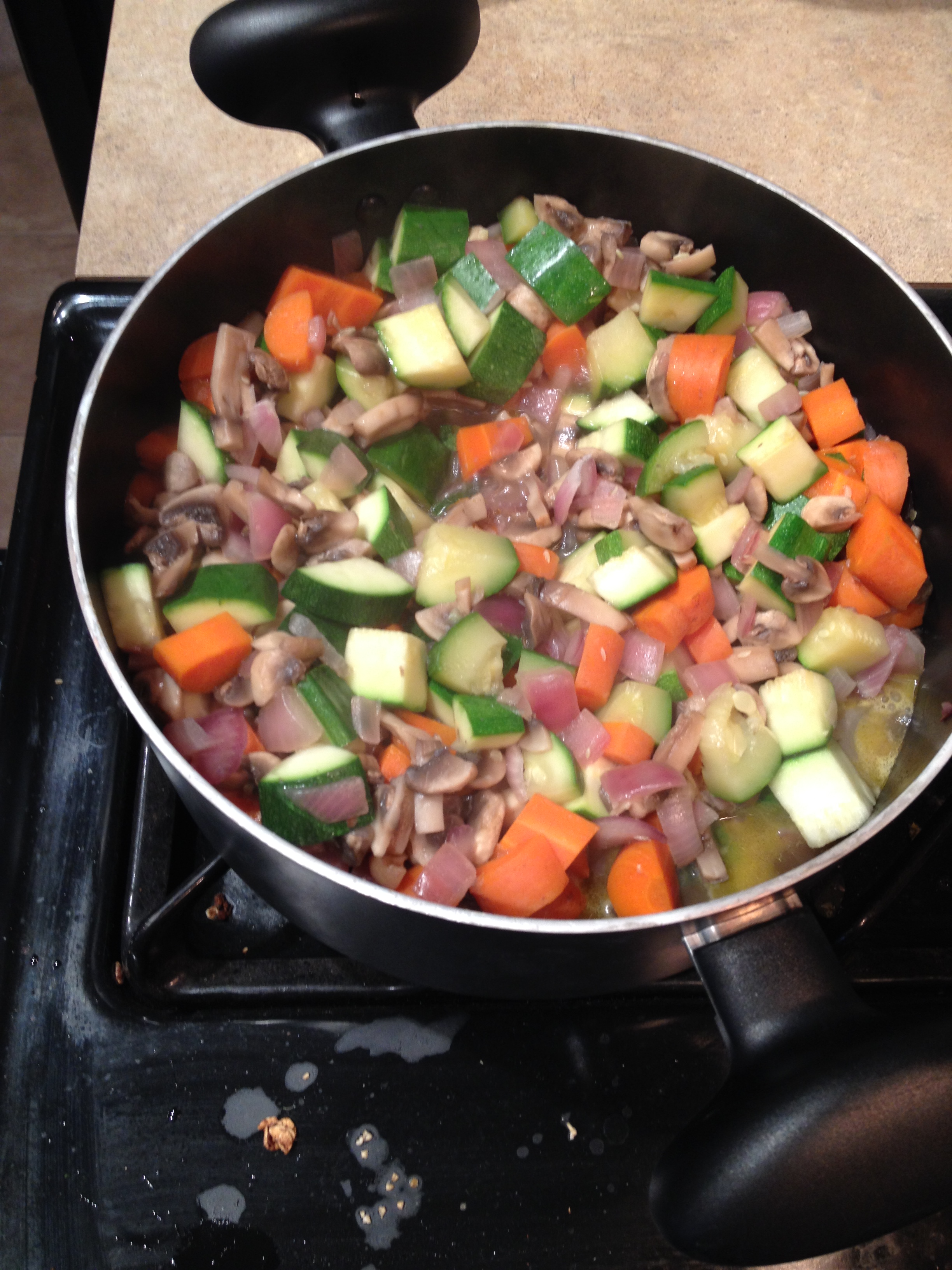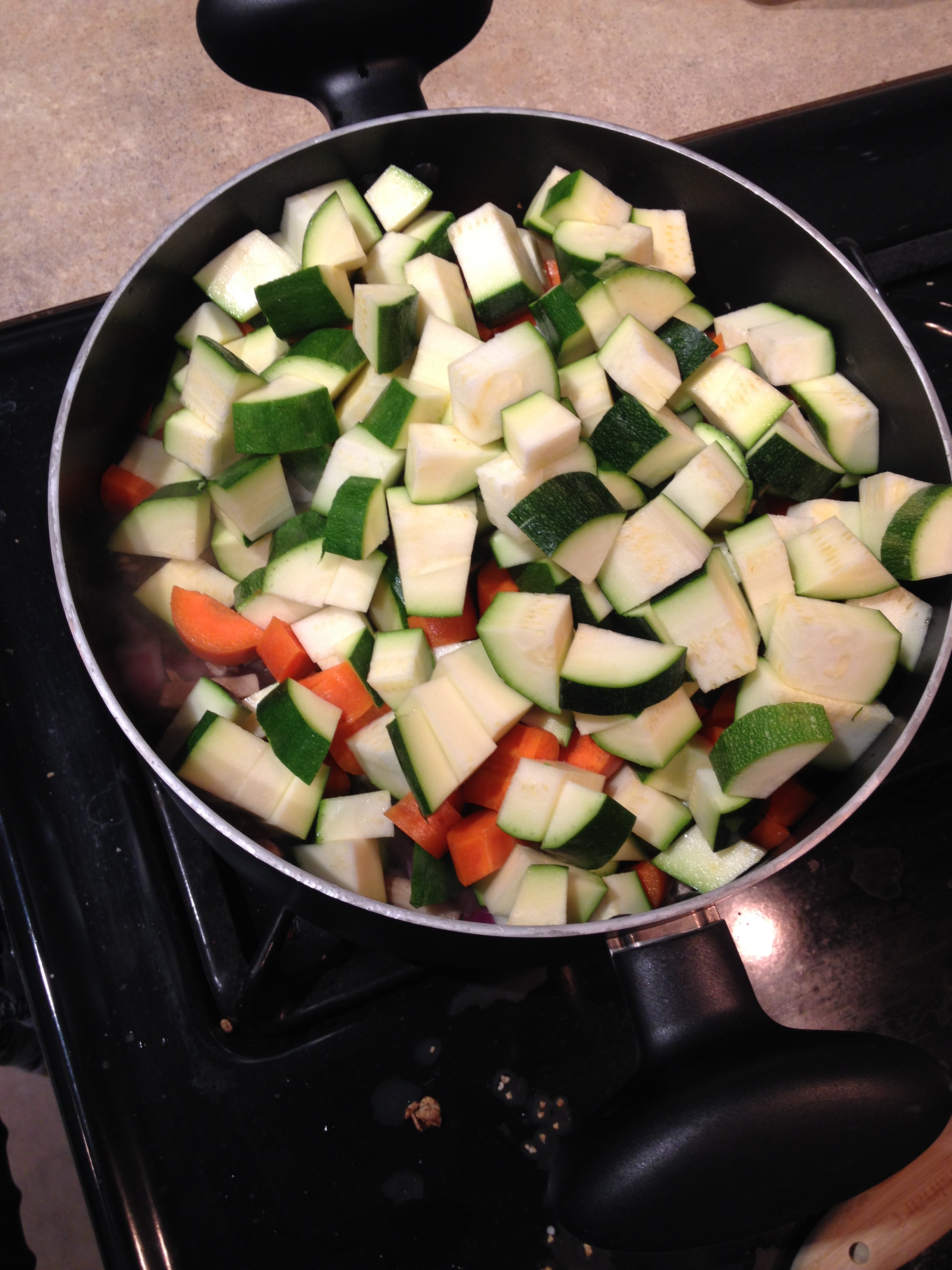 6. Chop carrots and zucchini into small chunks. Add to pot and mix then put lid back on. Let heat until veggies are soft.