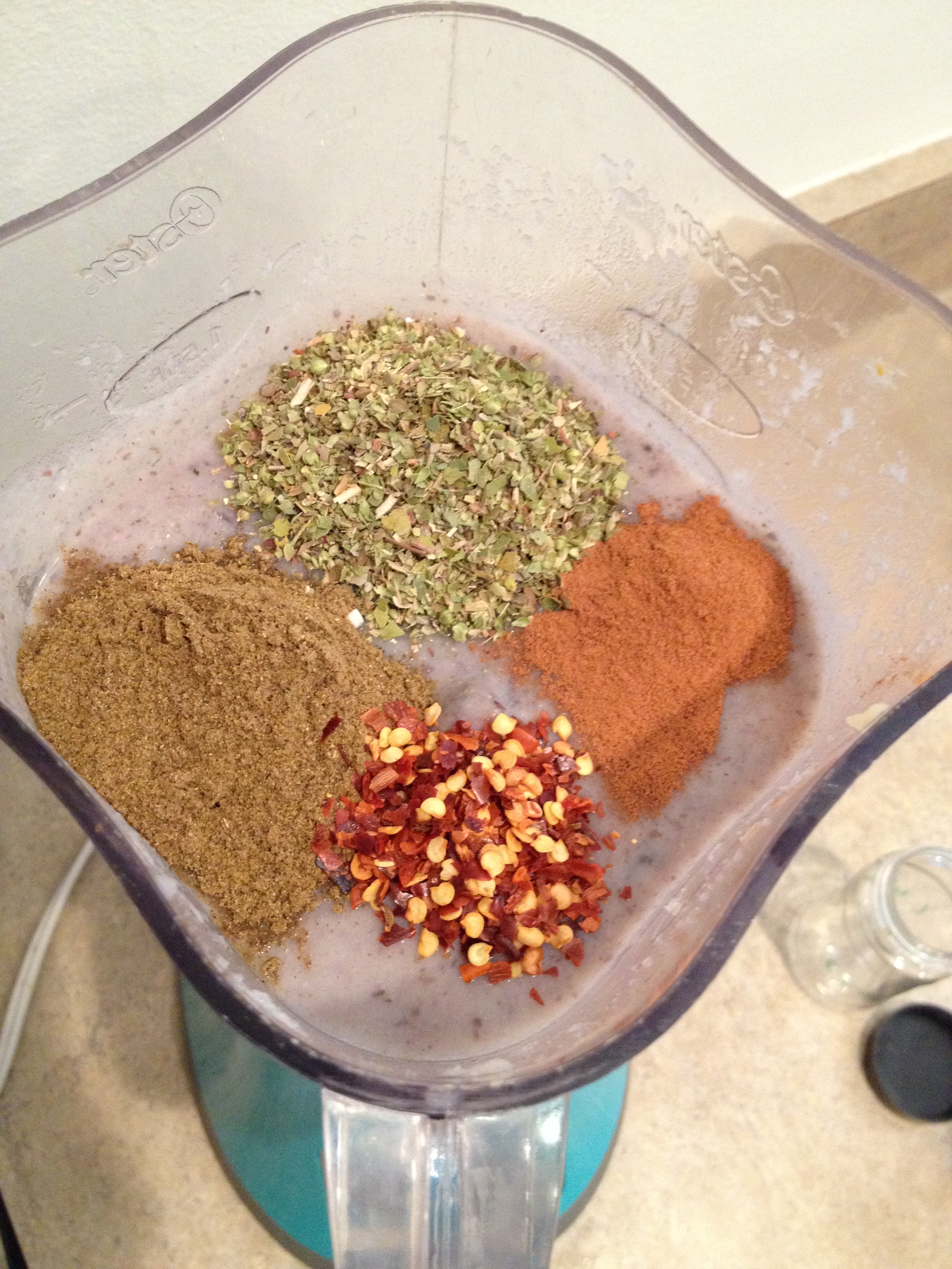 4. In a blender pour one cup milk, the cauliflower and garlic and blend until smooth. Add two cups beans and rest of milk and blend again. Add in all spices and blend until smooth. Set aside.