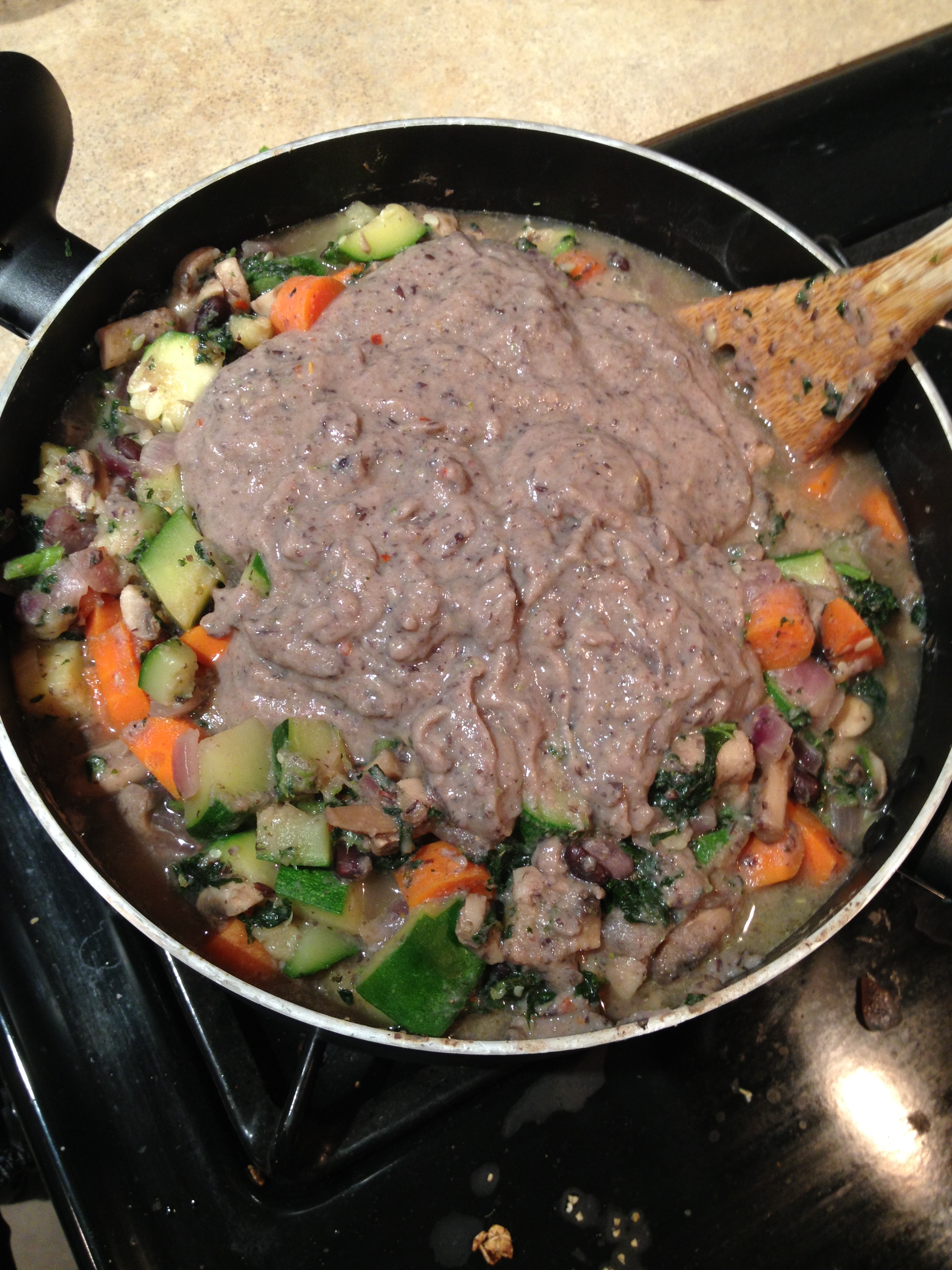 7. Squeeze liquid out of kale then add it and rest of beans to the pot and mix.