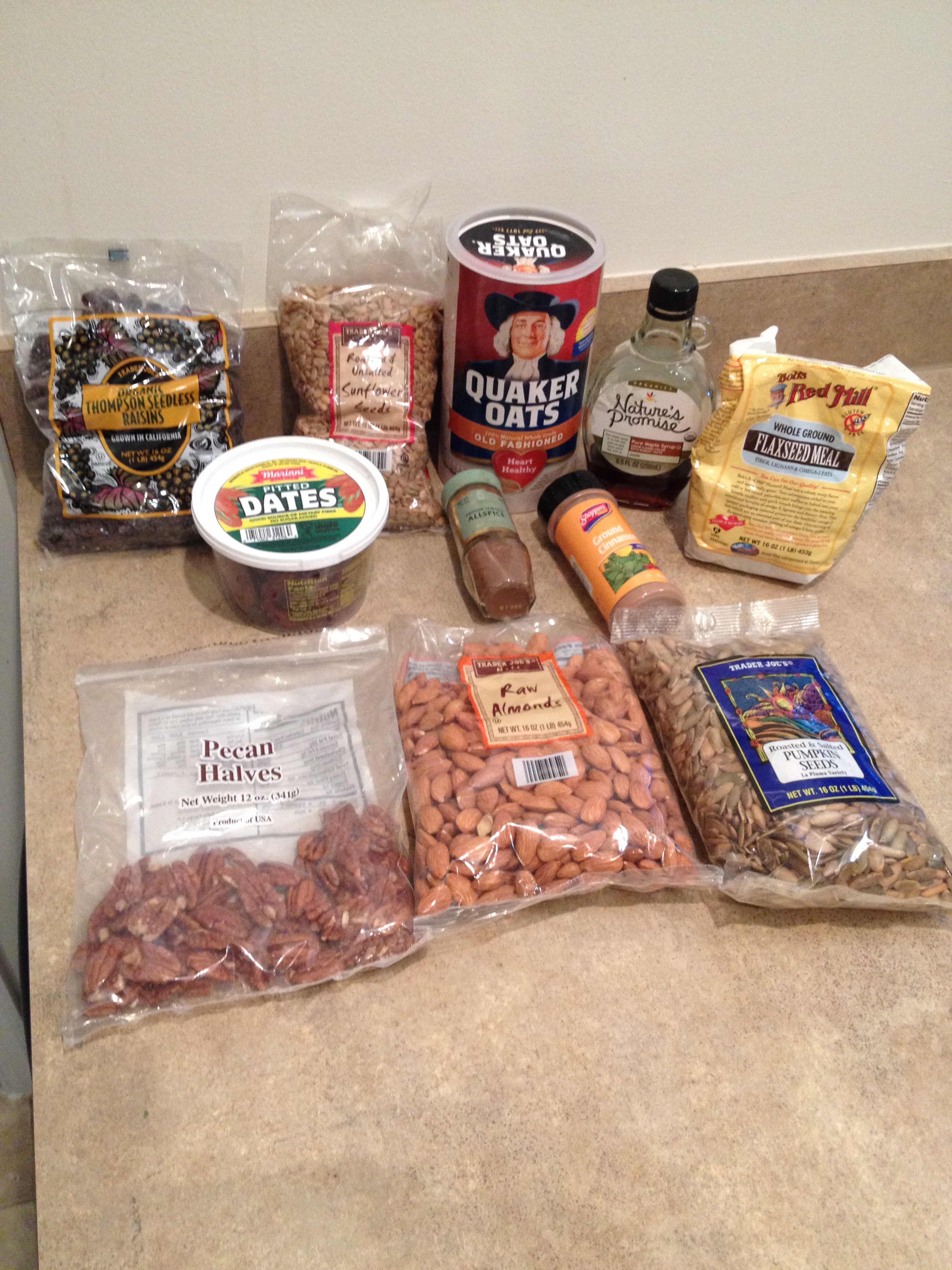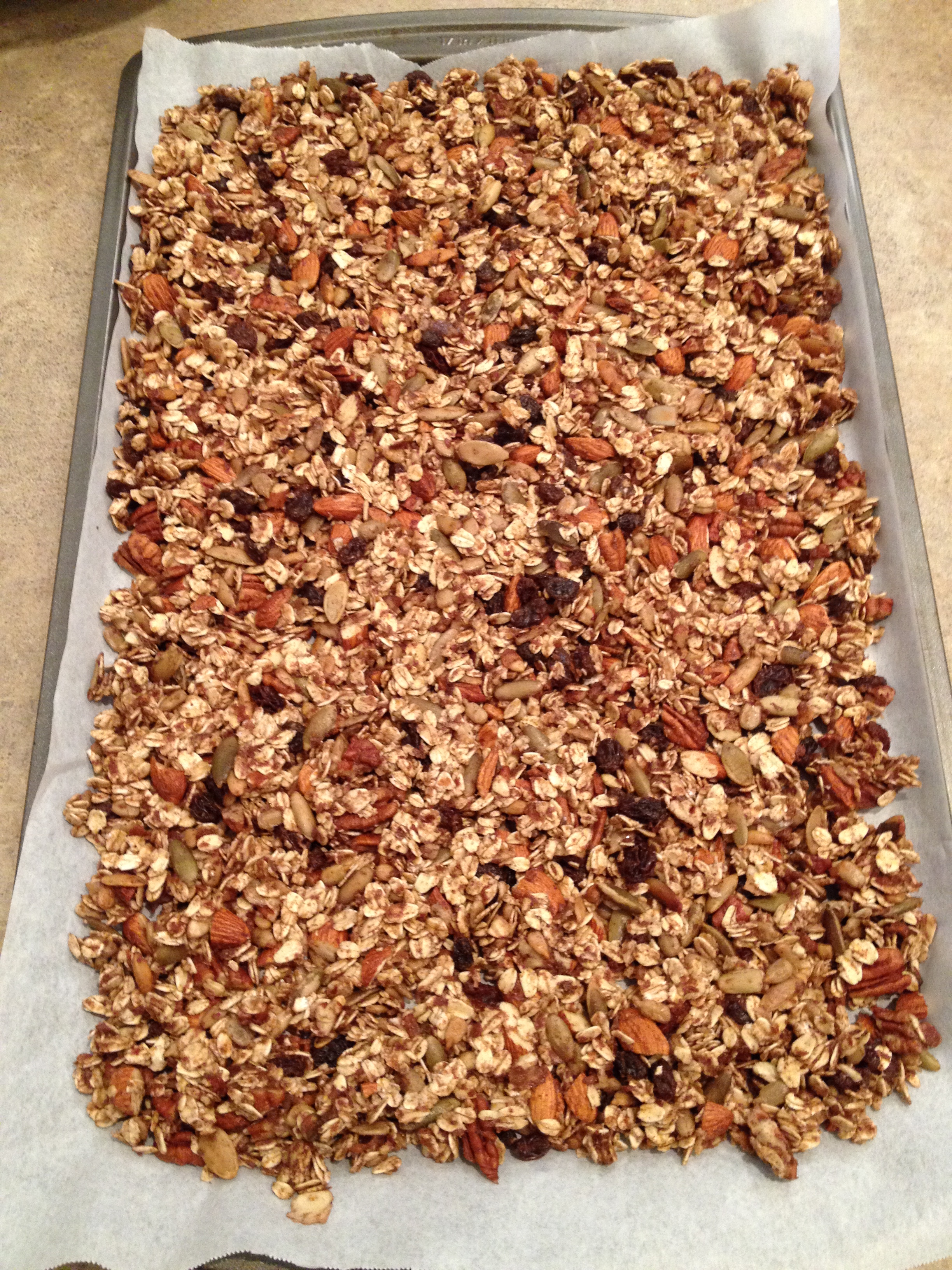 Do you know how hard it is to find fruit that is not sweetened? I mean, I knew it was going to be a little difficult since all packaged fruits have some type of sweetness added but still! Every. Single. Package! I thankfully found the Mariani Dates – or I would have been screwed with my coffee creamer! I took a little trip to Trader Joe’s hoping that they would have cheaper nuts to snack on, but also my elusive unsweetened fruit. Raisins and Bing cherries. That’s it. And not every package of raisins, just one. Little frustrating. I mean – I can’t be the only one who would like to buy unsweetened dried fruit right? Sheesh. Anyway, this granola is everything you would expect to eat on an elimination diet – not sweet and full of nuts and seeds. Like a trail mix. All those nuts packed into a normal granola.