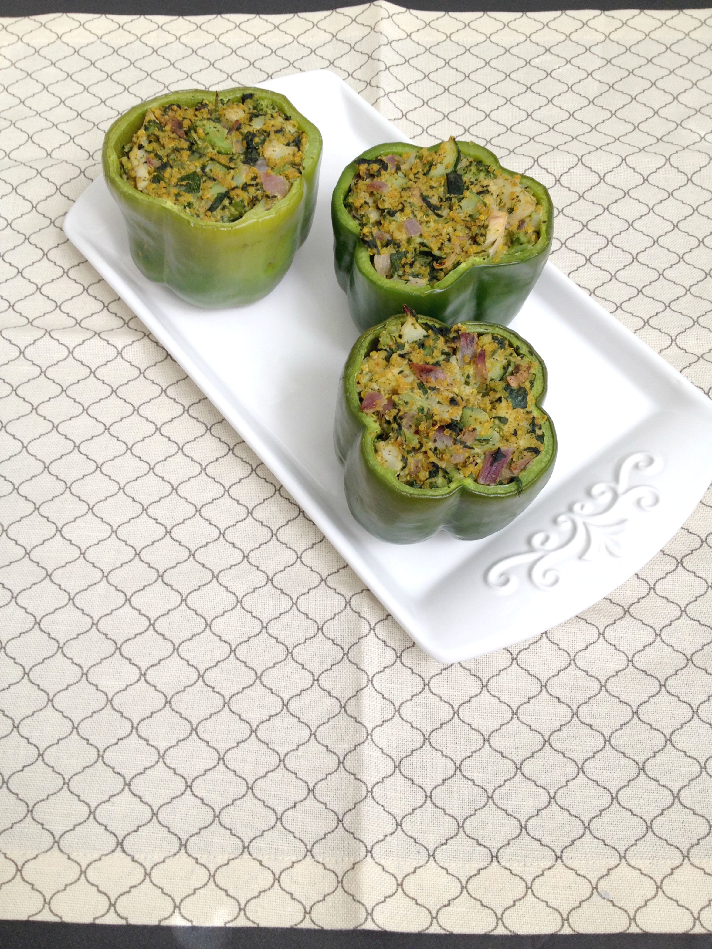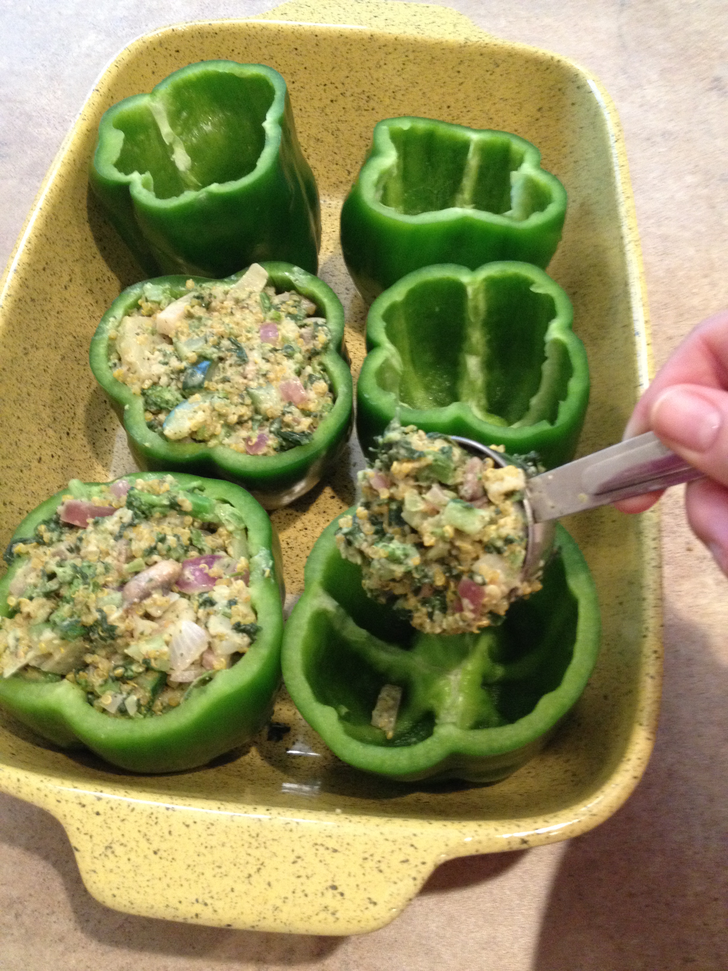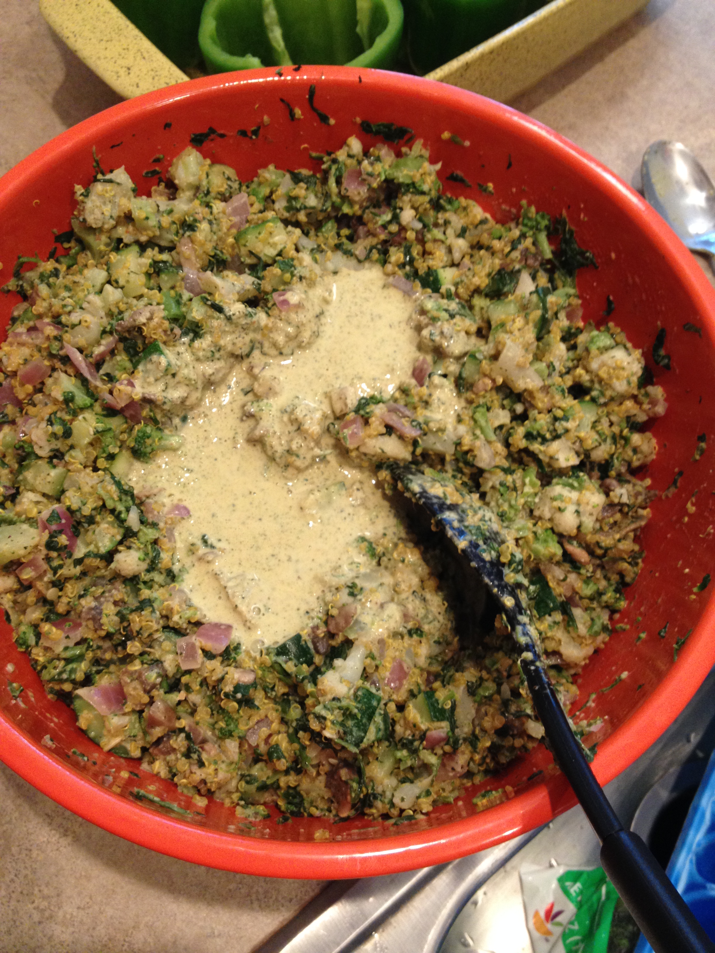 Start by getting your quinoa, spices, and water going in a small pot. Bring to a boil then lower heat to simmer and cover with a lid; simmer for 20 minutes then take off heat and fluff with a fork or spoon and set aside. In a small food processor dump in seeds and grind until dusted. Add in spices and grind then add in chopped garlic and jalapeno along with the sesame oil and vinegar. Mix until it starts to form a ball. Add in milk a quarter cup at a time and process until creamy then set aside. Dice onion and mushrooms into small pieces then lightly saute each about two minute; you do this for each veg-just saute enough to get cooked but you still want the veggies to have a bite to them. Mix veggies in a large bowl then add quinoa and mix again. Add sauce in thirds to the veg and quinoa and mix completely. Use a quarter-cup measuring cup to scoop into hollowed out green peppers. Place filled peppers in a baking dish then pour water into bottom of dish to ensure peppers won’t burn to dish. Bake at 350 degrees for 30 minutes. The peppers will still have a crunch to them. Enjoy!