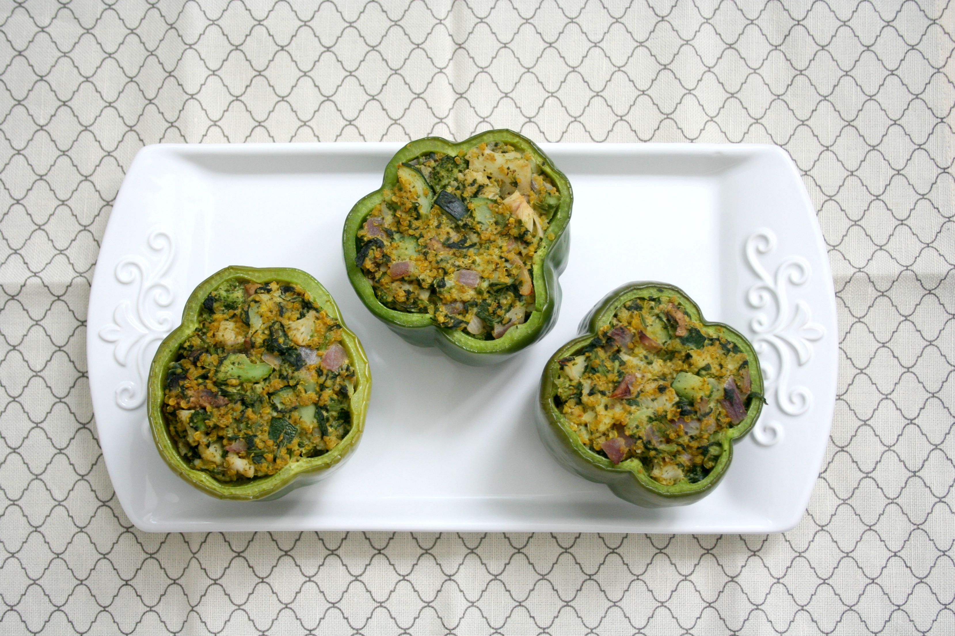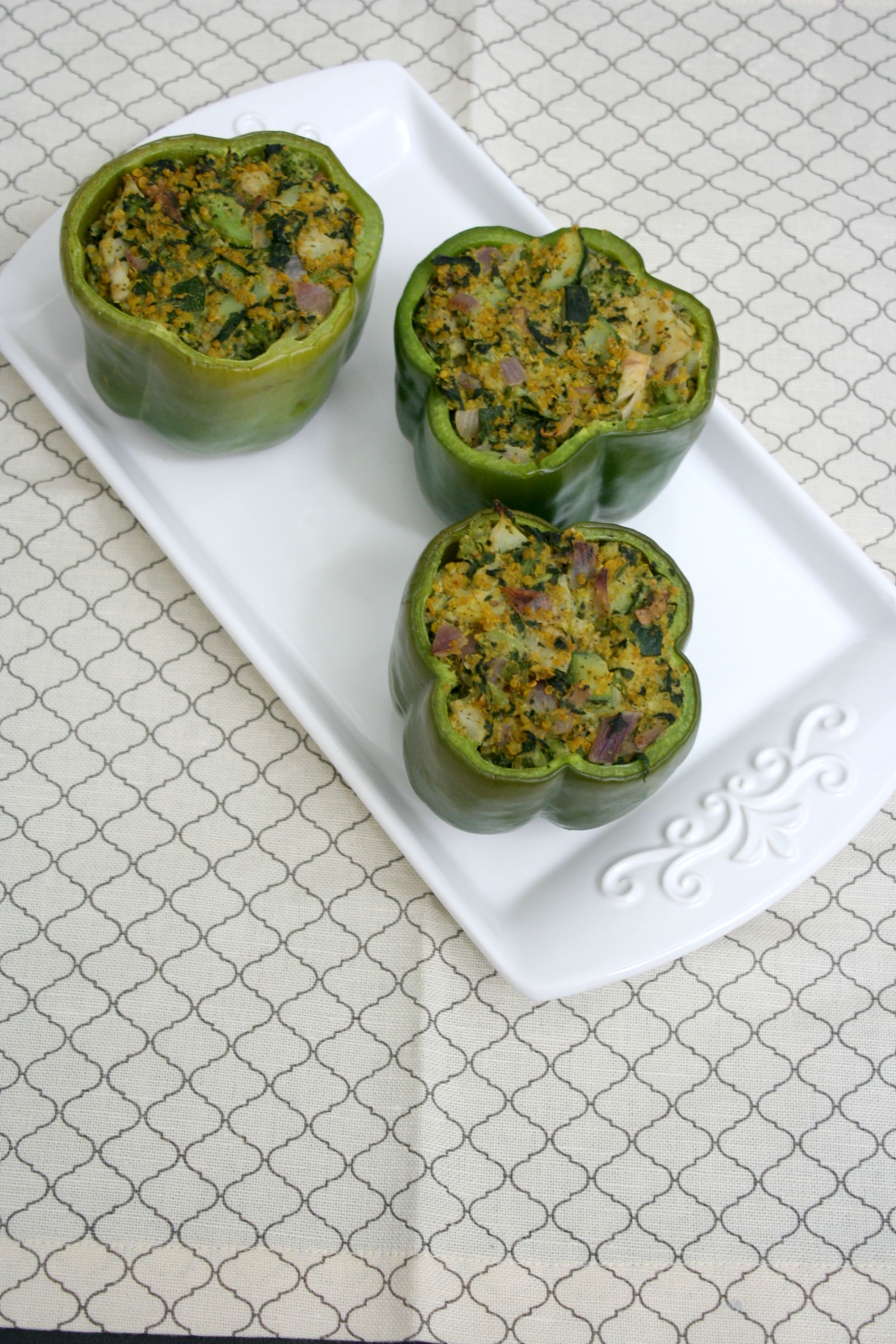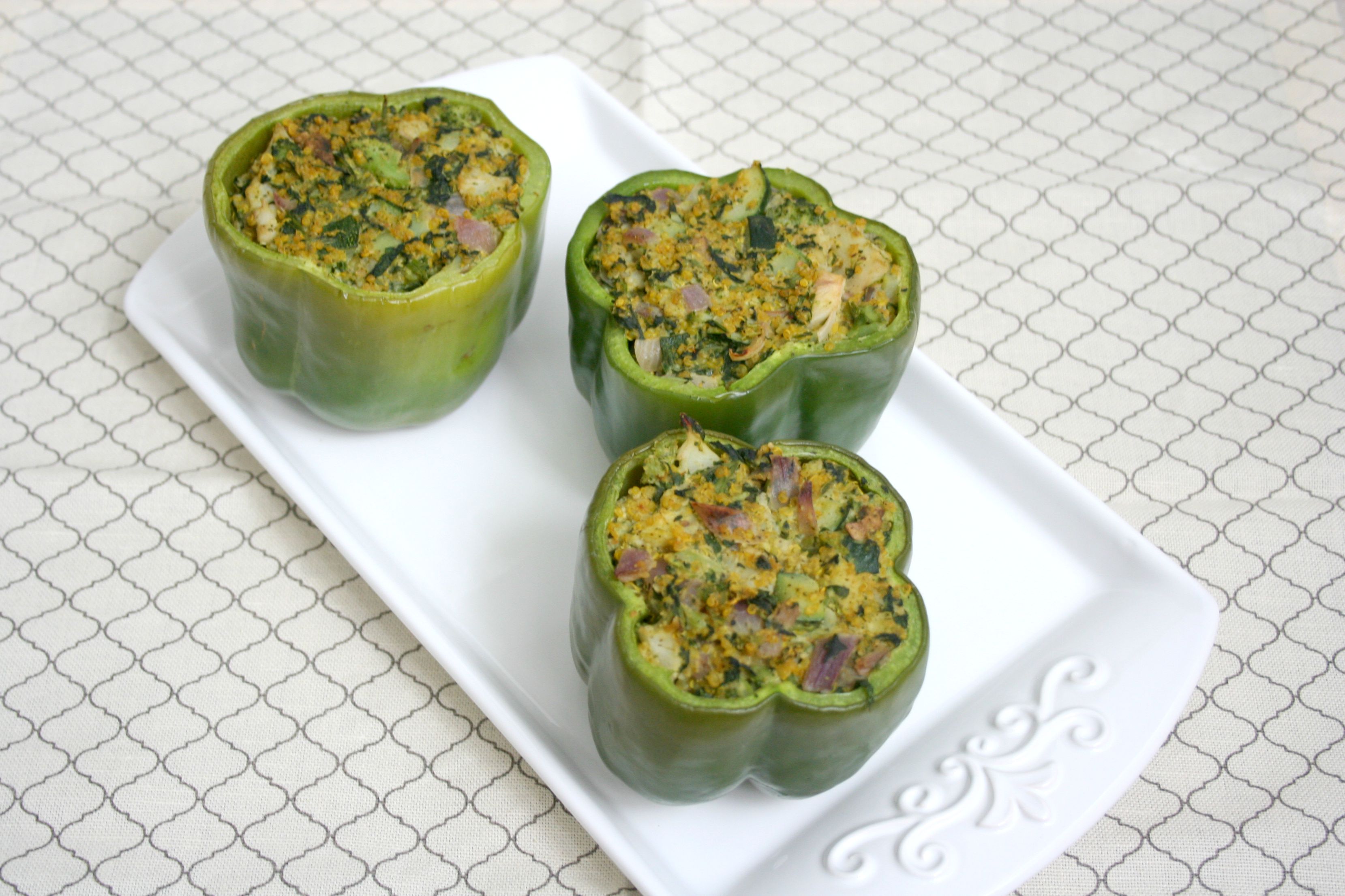 Start by getting your quinoa, spices, and water going in a small pot. Bring to a boil then lower heat to simmer and cover with a lid; simmer for 20 minutes then take off heat and fluff with a fork or spoon and set aside. In a small food processor dump in seeds and grind until dusted. Add in spices and grind then add in chopped garlic and jalapeno along with the sesame oil and vinegar. Mix until it starts to form a ball. Add in milk a quarter cup at a time and process until creamy then set aside. Dice onion and mushrooms into small pieces then lightly saute each about two minute; you do this for each veg-just saute enough to get cooked but you still want the veggies to have a bite to them. Mix veggies in a large bowl then add quinoa and mix again. Add sauce in thirds to the veg and quinoa and mix completely. Use a quarter-cup measuring cup to scoop into hollowed out green peppers. Place filled peppers in a baking dish then pour water into bottom of dish to ensure peppers won’t burn to dish. Bake at 350 degrees for 30 minutes. The peppers will still have a crunch to them. Enjoy!