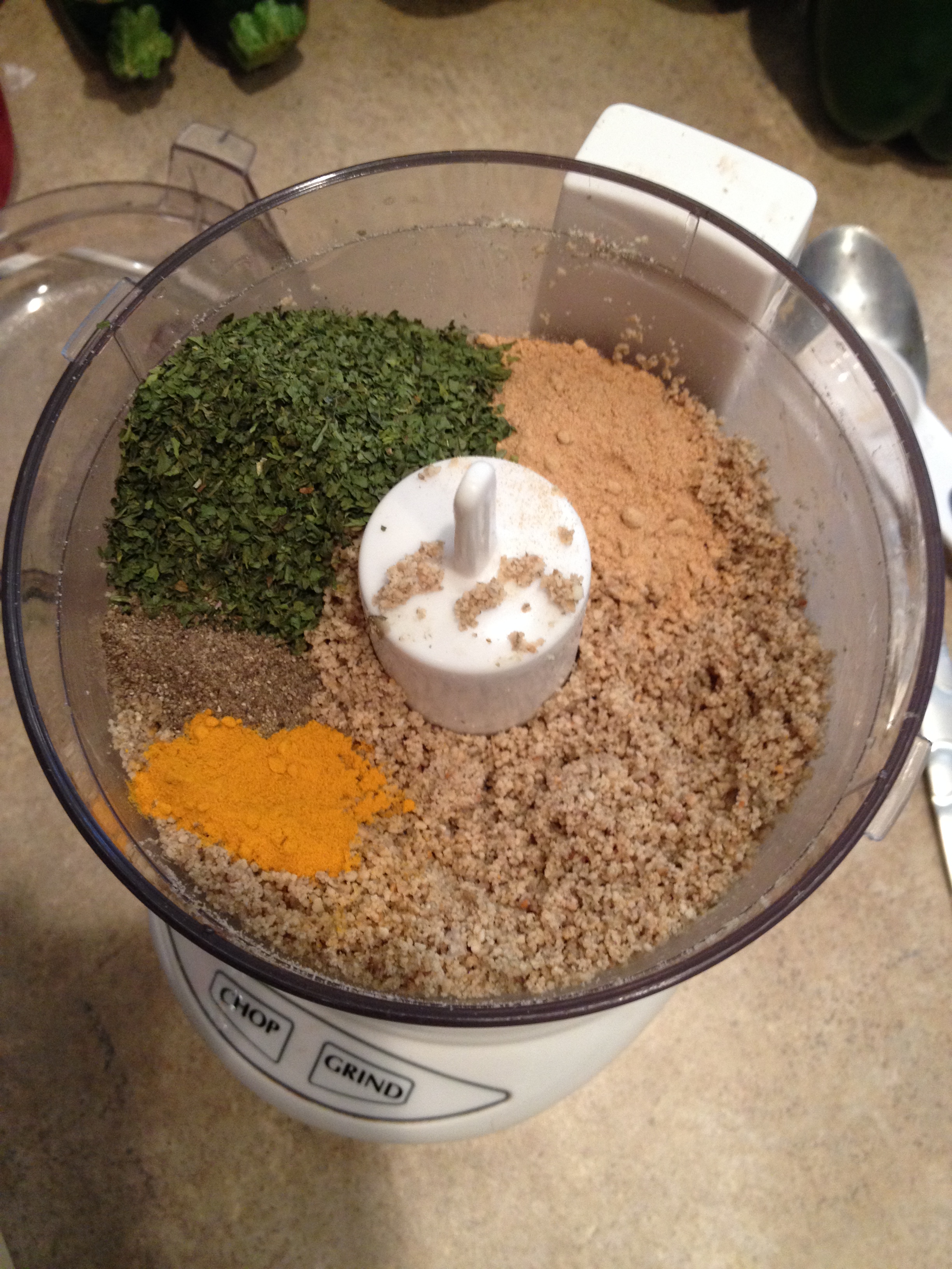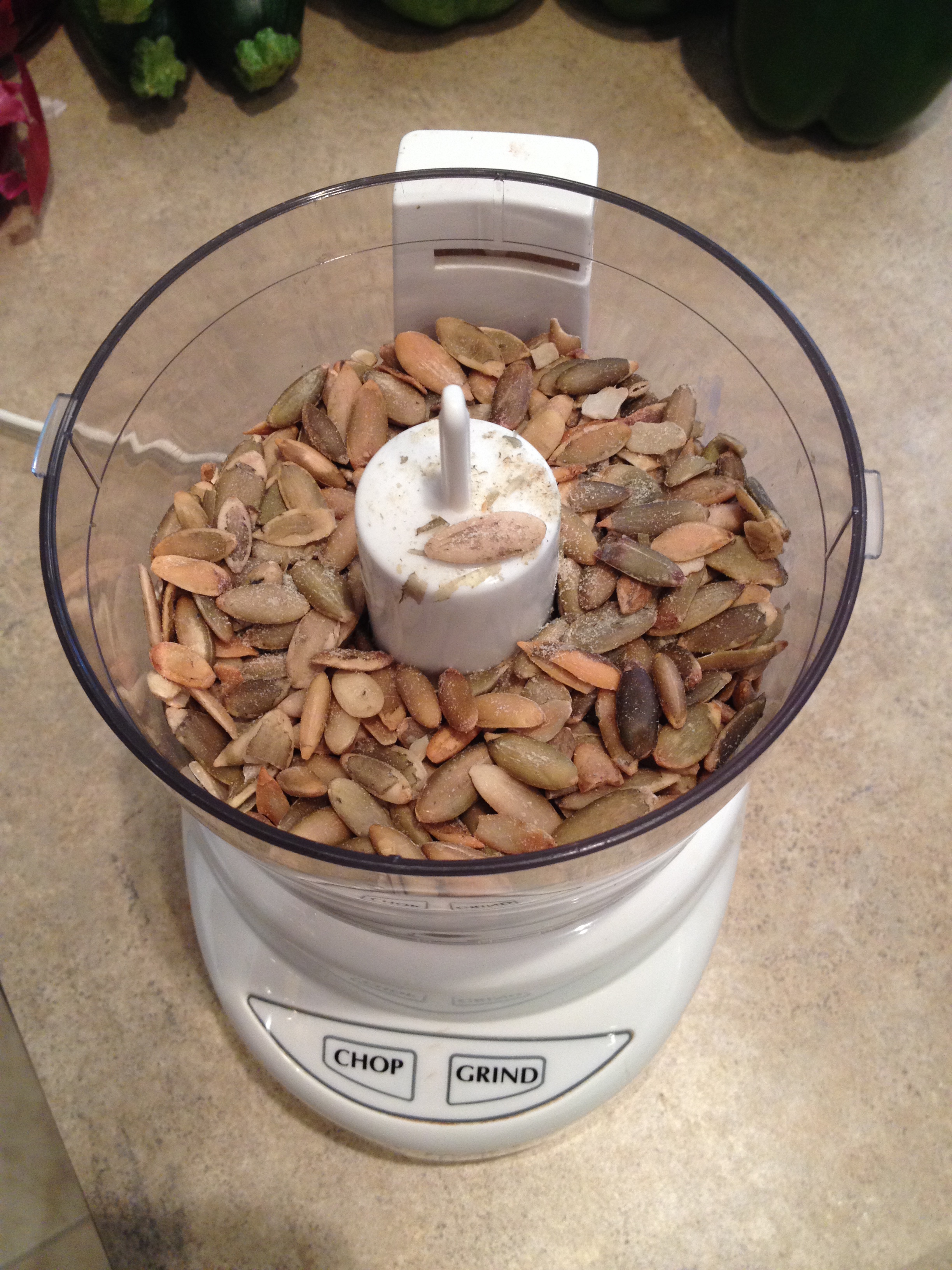 2. Dump pumpkin seeds into a small food processor and grind into dust. Add spices and grind.