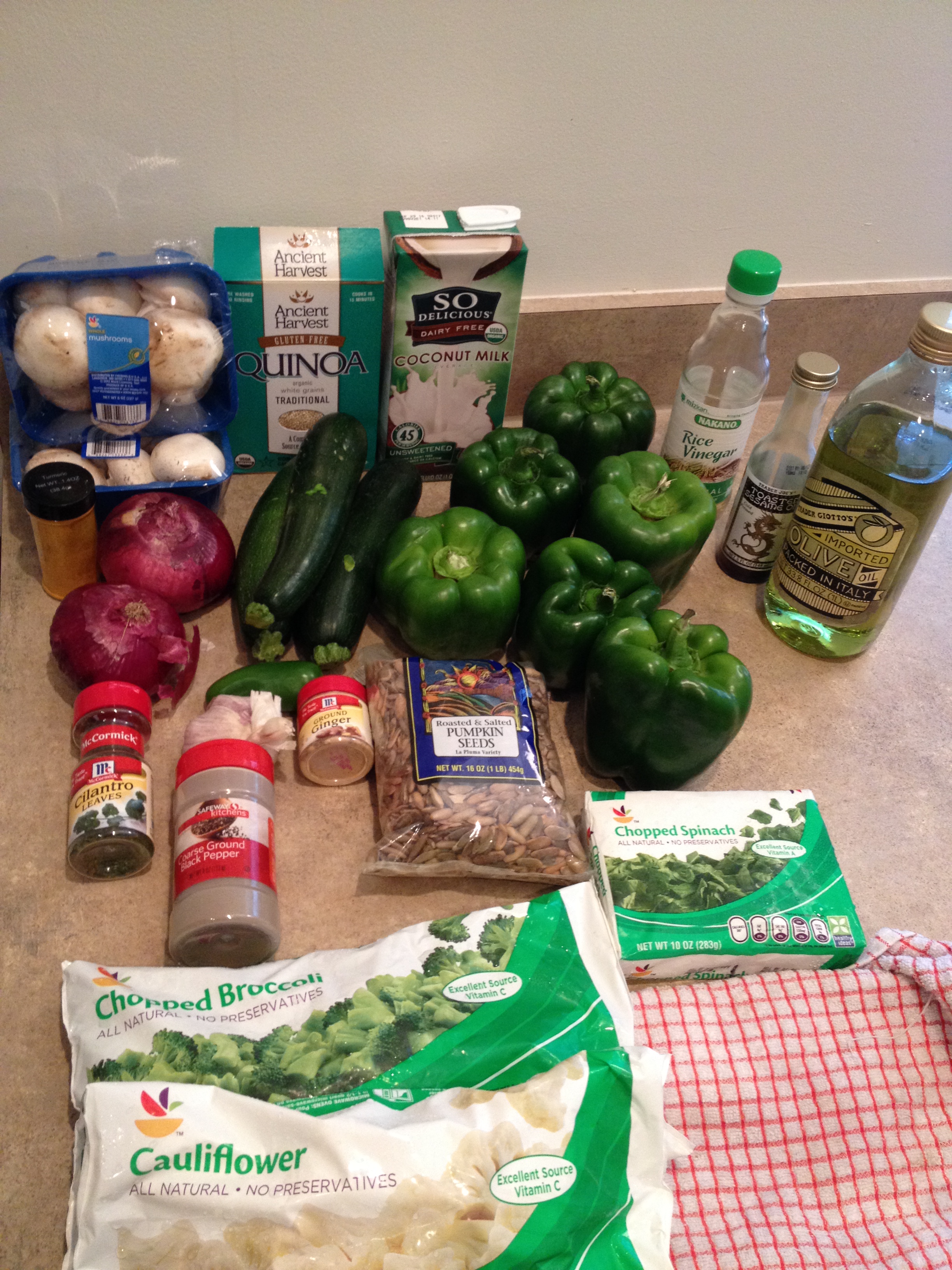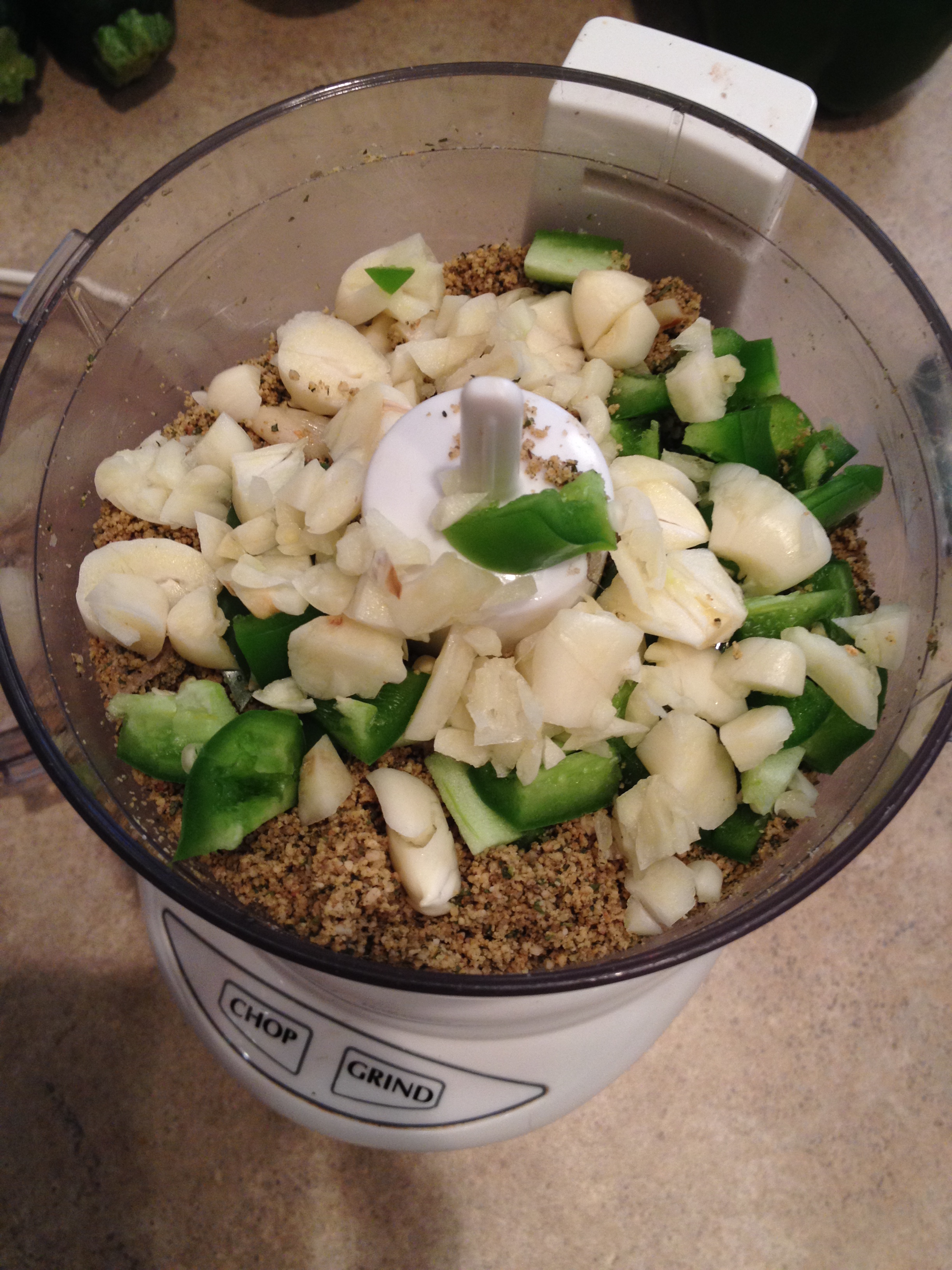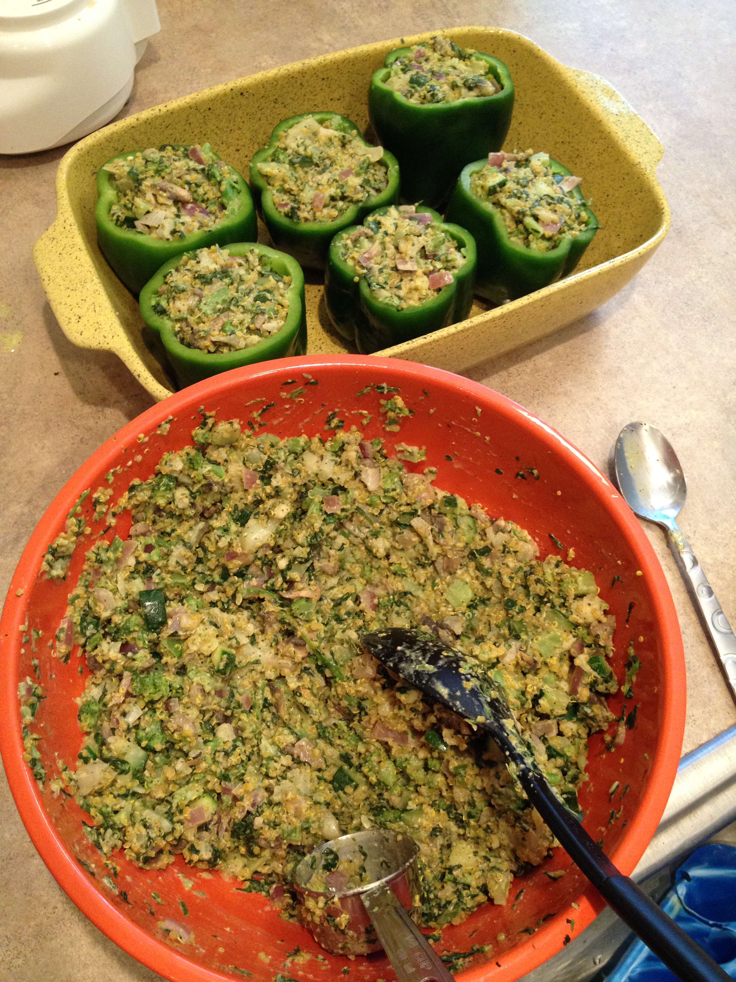 Well this week I decided to cut out almonds – they have become my nut crutch. I started thinking about what I was eating prior to the start of the elimination diet and what I was continuing to eat since, and that led me to thinking about almonds – not that I snacked on almond before the diet (that was peanuts) but I consumed a lot of almond milk. And that led me to wonder if maybe I’m allergic to almonds? Is that even possible? I don’t know that I have ever heard of an almond allergy – but, I figured I would give them up too. I may not have an allergy, but I figured this week I’ll try to live without them. Which is the reason for the seed butter, since my original plan was to make an almond butter. I had tons of leftover pumpkin seeds from my Trail Mix Granola and knew I should use those up, so in the small food processor they went. I also had some leftover quinoa hanging around and decided to have a week of meals without beans. And to make it even healthier I stuffed green peppers – which are way cheaper than any other color, and add a nice tang to meal. And as you can see from the pictures – this makes a ton. I only bought six peppers and each one was stuffed with one cup quinoa mixture, and I had about nine cups left after stuffing. So what to do? Well you can either freeze the leftovers in one cup servings in zip lock baggy’s or eat it throughout the weekend/week dinners. Yum.