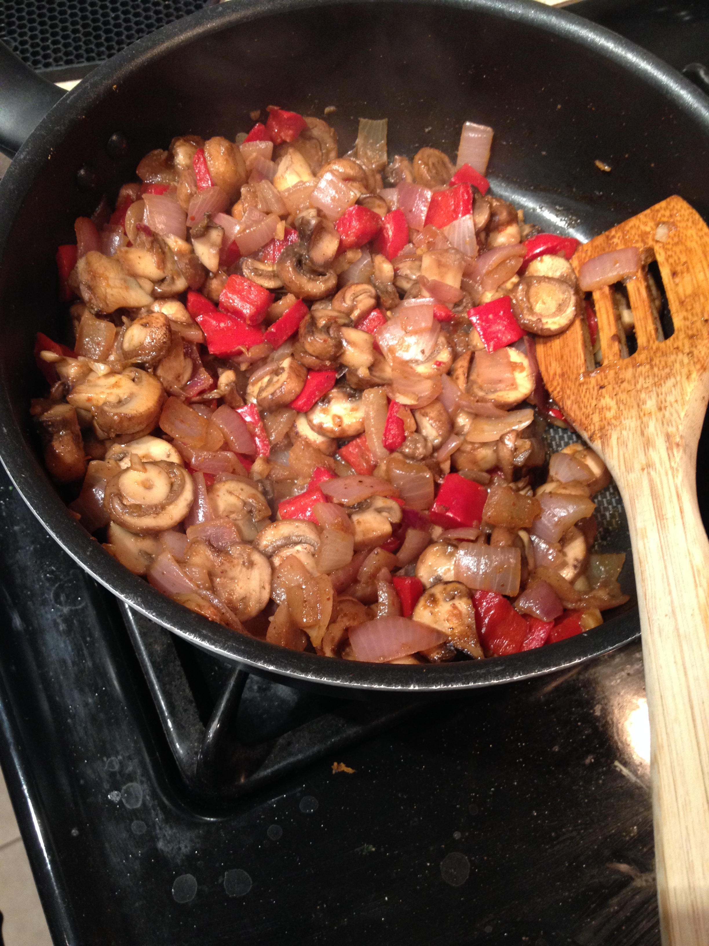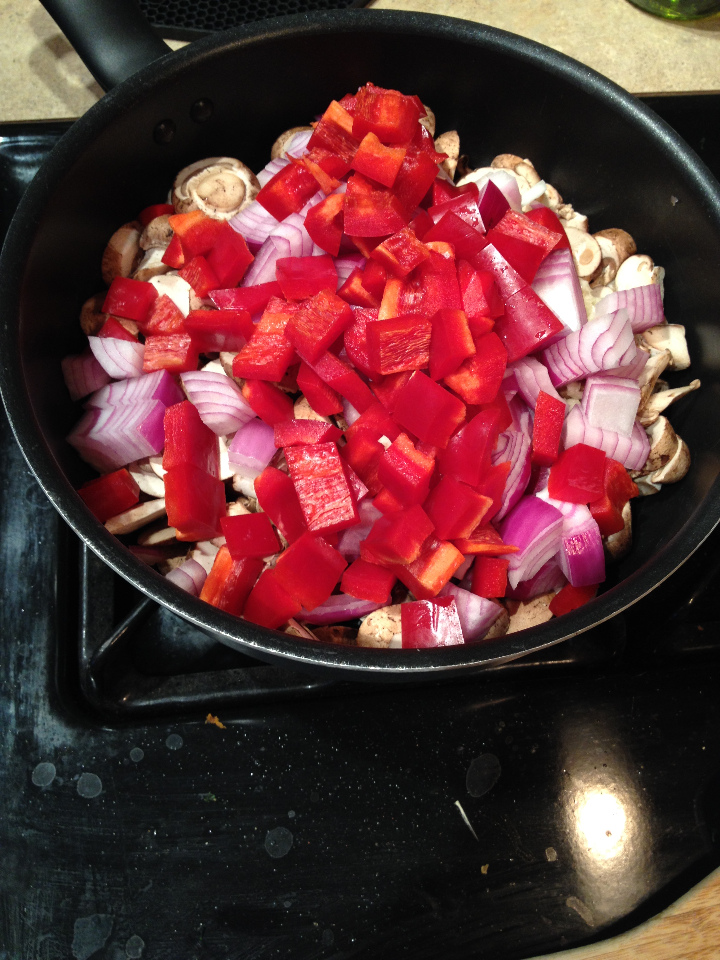 3. Add one tablespoon olive oil to a large saute pan then add all veggies. Mix then put lid on to pull liquid out of mushrooms – about 5 minutes.