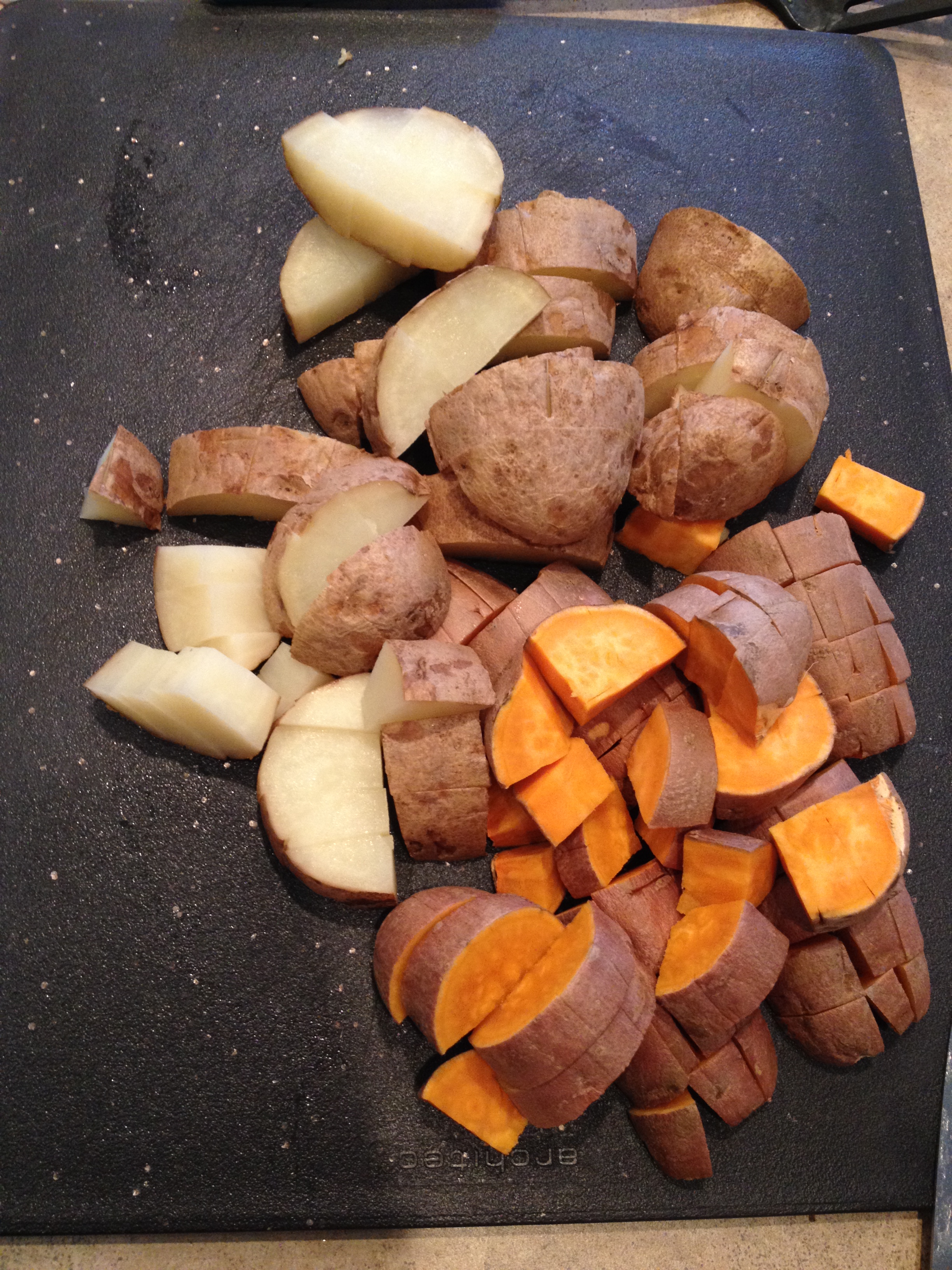 1. Wash and scrub potatoes then poke holes throughout. Bake in microwave until fork tender. Let cool enough to handle then cut into small to medium-size chunks.
