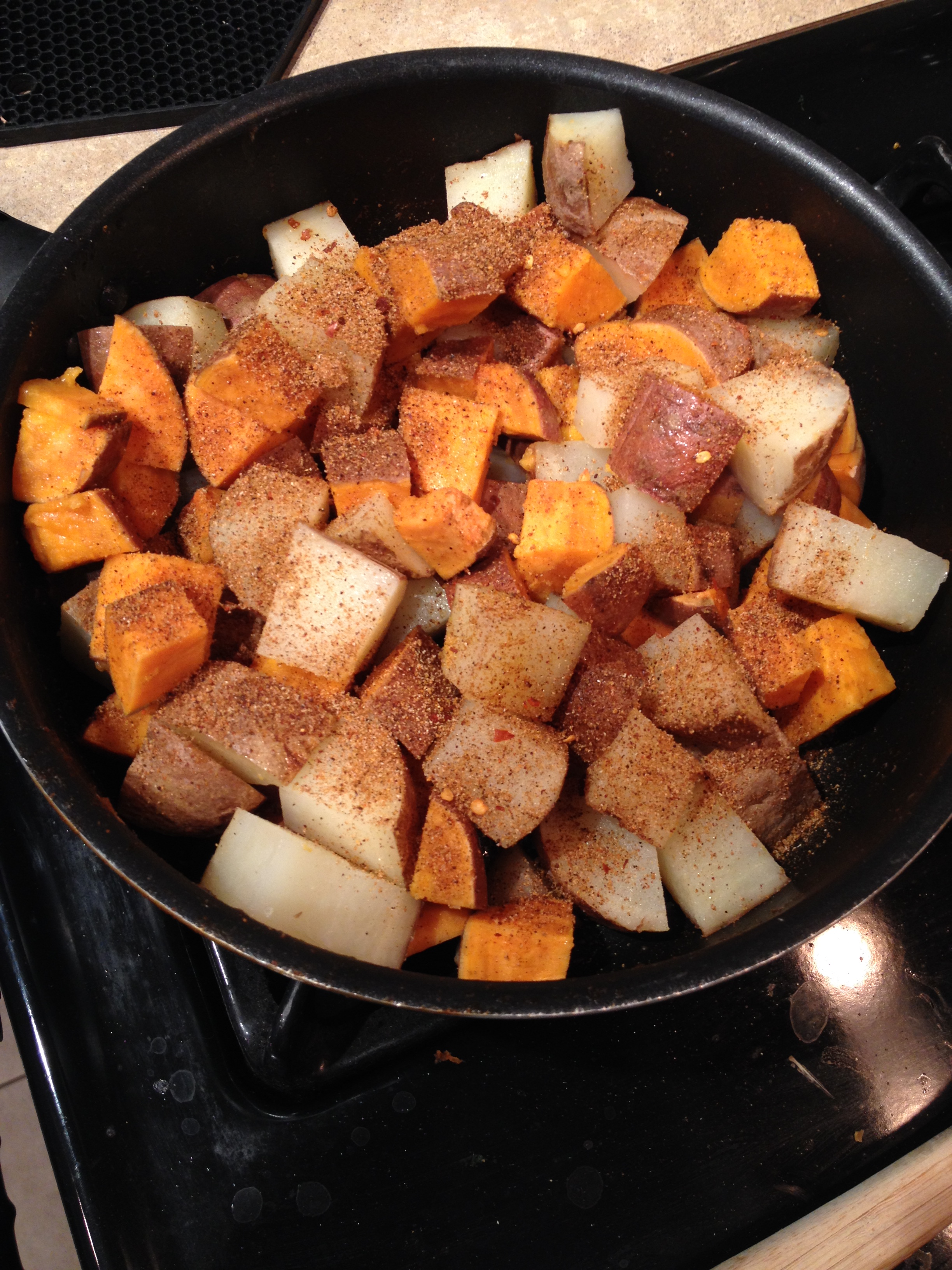 I mean. Potatoes. There isn’t really anything you can do to ruin them. Even if they are burned just dip them in ketchup and they are awesome! But adding some spice and olive oil? A little onion, pepper, and mushrooms. Good. Ness. You can’t get any better. So these are the potatoes I posted about in my mid-August Elimination Diet update. The potatoes that caused a slight gain? Yes – these are awesome, so don’t go eating the whole pan at one time. Because even when you cut everything possible from your diet … you can still overeat. Don’t let anyone tell you that you can’t. You can eat fruit and veggies all day, but it will come back to get you in the gain department. This elimination diet has been what my mind needed in that sense. Yes, I can enjoy mock-fried potatoes but I need to remember that I don’t have to eat the whole pan. I can save some for later. I have to say that I am so glad for this Elimination Diet. And for clean eating potatoes. Because I call these mock-fried but there is really no frying. Just a little olive oil and let the pan do the rest. The veggies just get a sauteed in the mushroom liquid and a little oil. The potatoes get a little slick from the oil then the pan just browns those taters up!