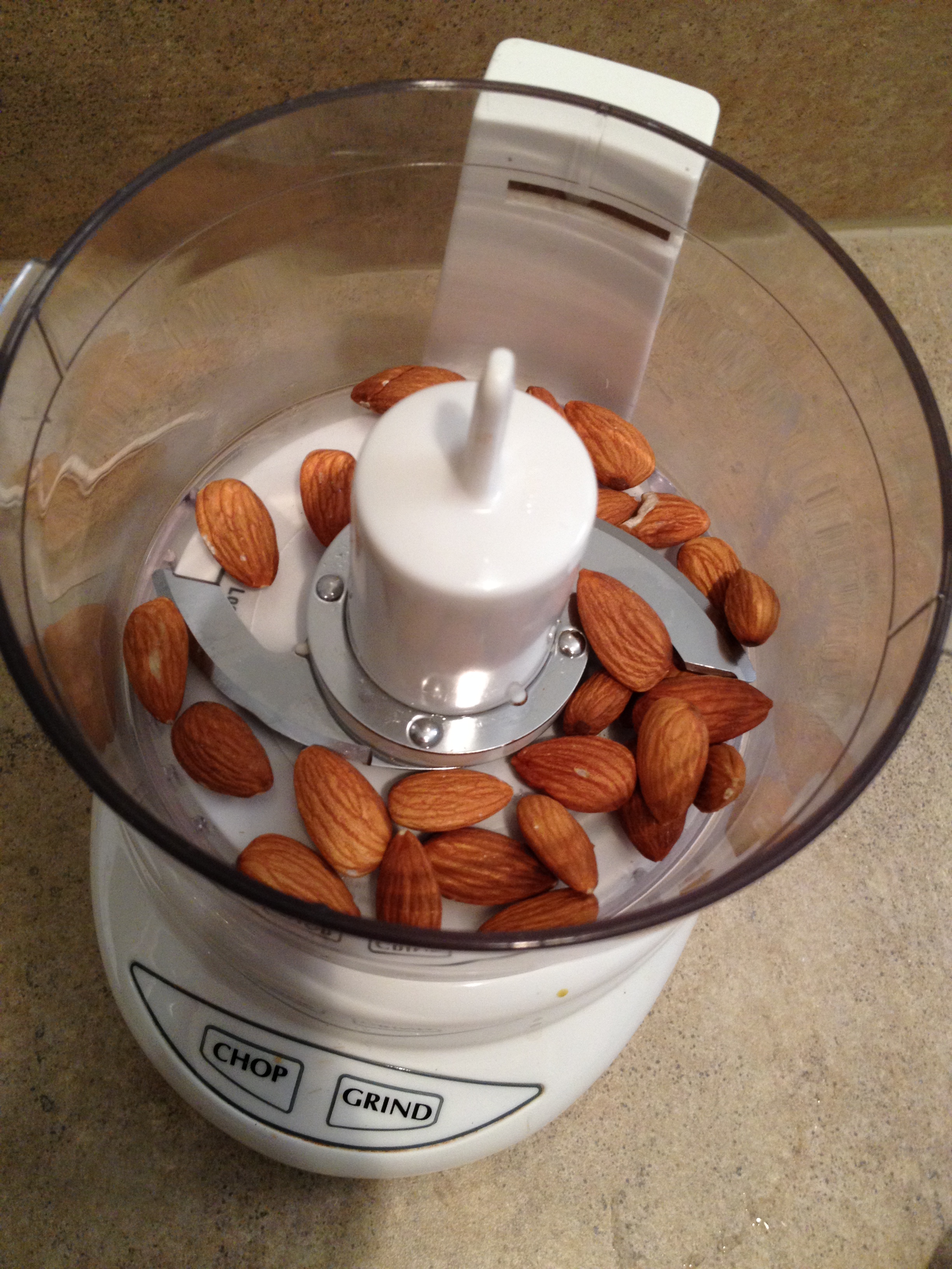 Vegan and Gluten-Free Perfect Appetizer - Savory Stuffed Olives3. Dump almonds in a small food processor and grind into bits.