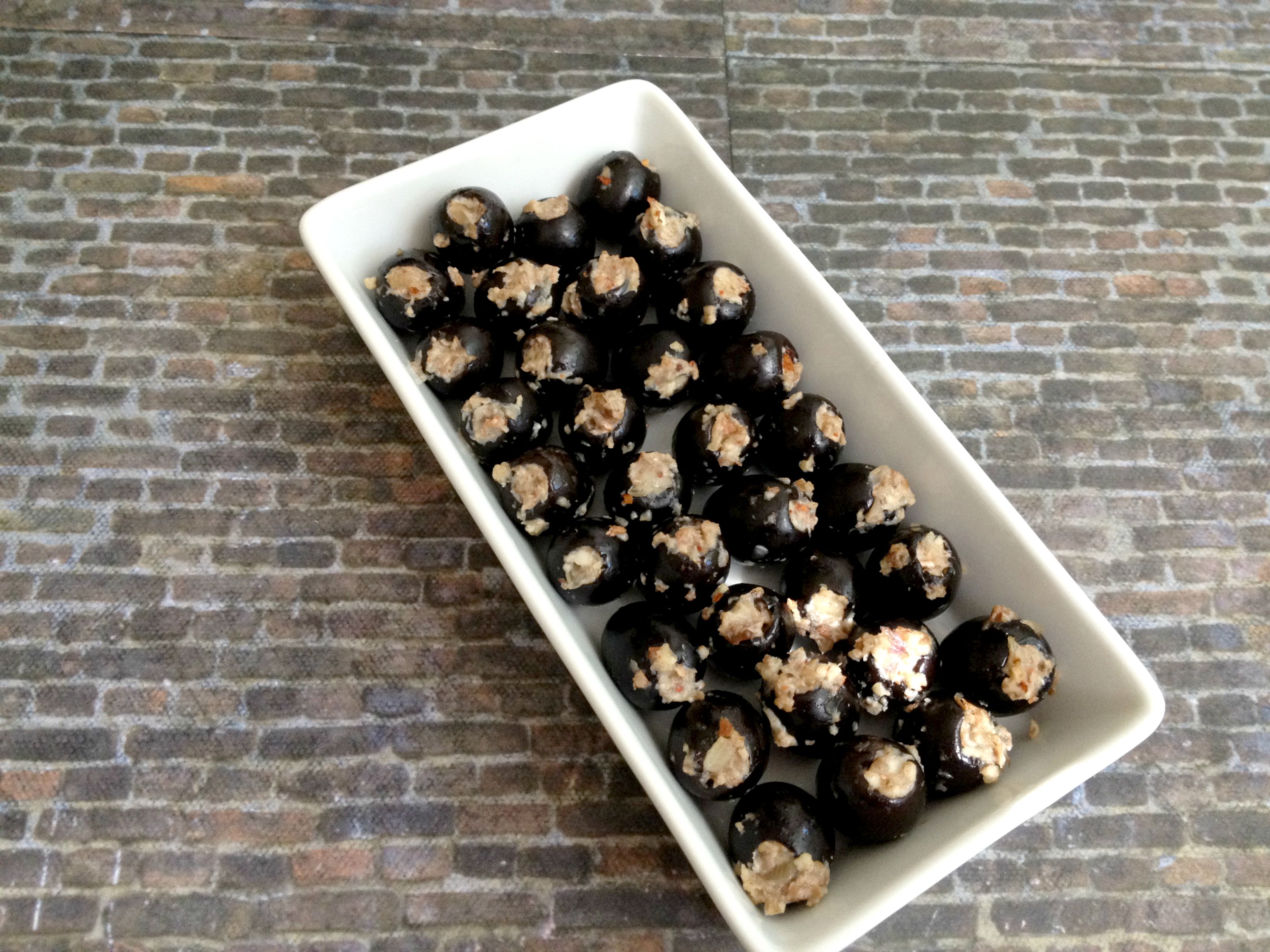 Those two free cans of yummy black olives? It was all I could do not to eat them straight from the can when they showed up! Did you know that olives are actually healthy? This may sound dumb, but I always thought they were just a fattening little side-thing to have at BBQ’s; but no, they are full of vitamin E (.25 mg per serving), iron (.49 mg per serving), vitamin A (60 IU per serving), and fiber (.5 grams per serving) and healthy fats. And seeing that olives are pretty prevalent in a Mediterranean diet I knew this recipe was going to be super healthy. And fun. I didn’t want to go classic with a Greek recipe, since most Greek recipes I see have either meat or feta. I’ve only done one Greek recipe and it turned out great, but I wanted different. Cooky even. Something that you can make that you might serve at parties … maybe a Labor Day? They are awesome as little appetizers and the stuffing will go far since you use so little in the olives. And how about using them for Halloween parties? Cause stuffed olives? They kinda look like eyeballs all lined up. How fun right? I thought stuffing them were going to be a hassle, but they were a little calming. Just standing there and gently pressing teeny bits of stuff into the olives you have to concentrate to not break them, you kinda get lost in your head for a bit. It was nice.