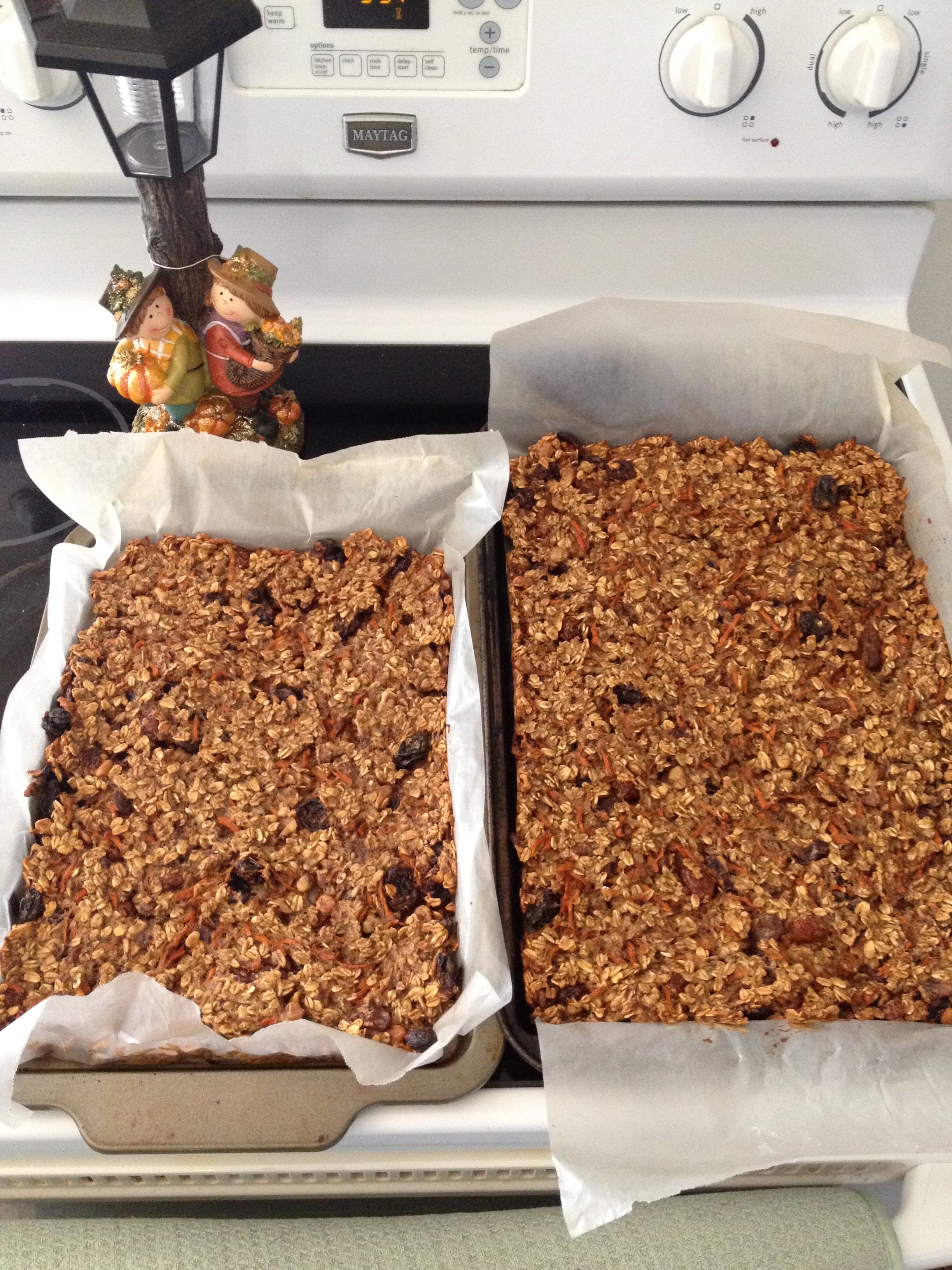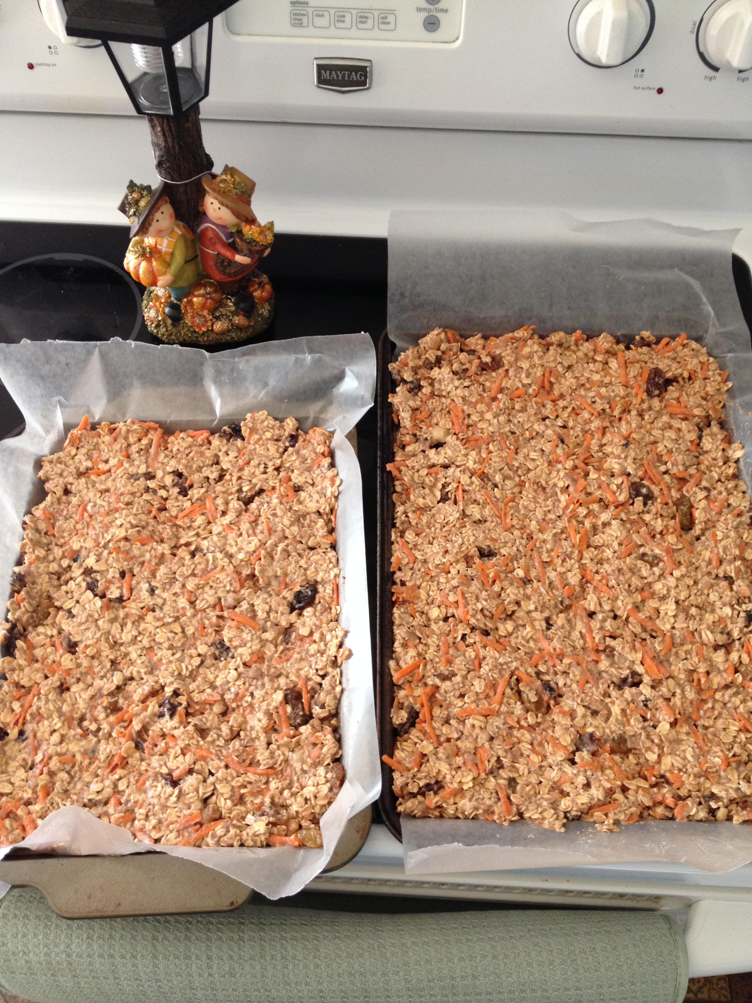 Start by mixing the oats, flax, and baking powder in a large bowl – I don’t know if the powder is really necessary so the next one I’ll try it without. In a smaller bowl mash the bananas with the vanilla – I mash them a little then microwave 30 seconds, mash, micro 30 seconds, then mash again and they are good. I like mine not totally mashed, a little mushy. Add the sugar-free sweetener and spices and mix then add to the oats bowl and mix. Add the unsweetened almond milk and mix. Shred the carrots then add them and the raisins and walnuts and mix. Line baking pan or pans with parchment paper (not wax paper like I had to use – oh man, it all stuck to the paper!) then spread out evenly and bake at 350 degrees for 60 minutes. Let cool then slice and enjoy! Store in a ziplock baggie in the fridge.