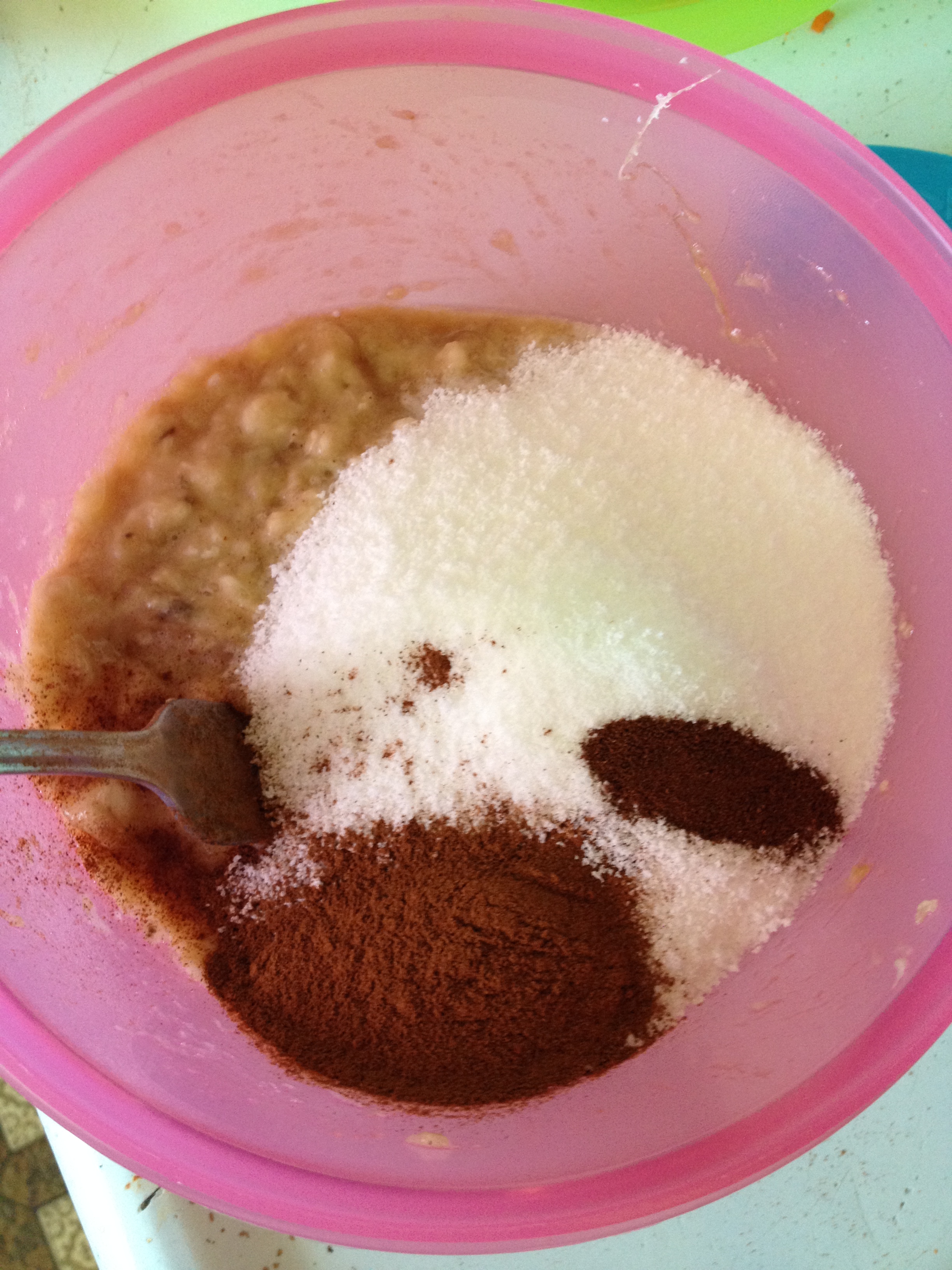 3. In a smaller bowl mash bananas and vanilla, microwaving in 30 second intervals if necessary. Add Splenda, cinnamon and cloves and mix.
