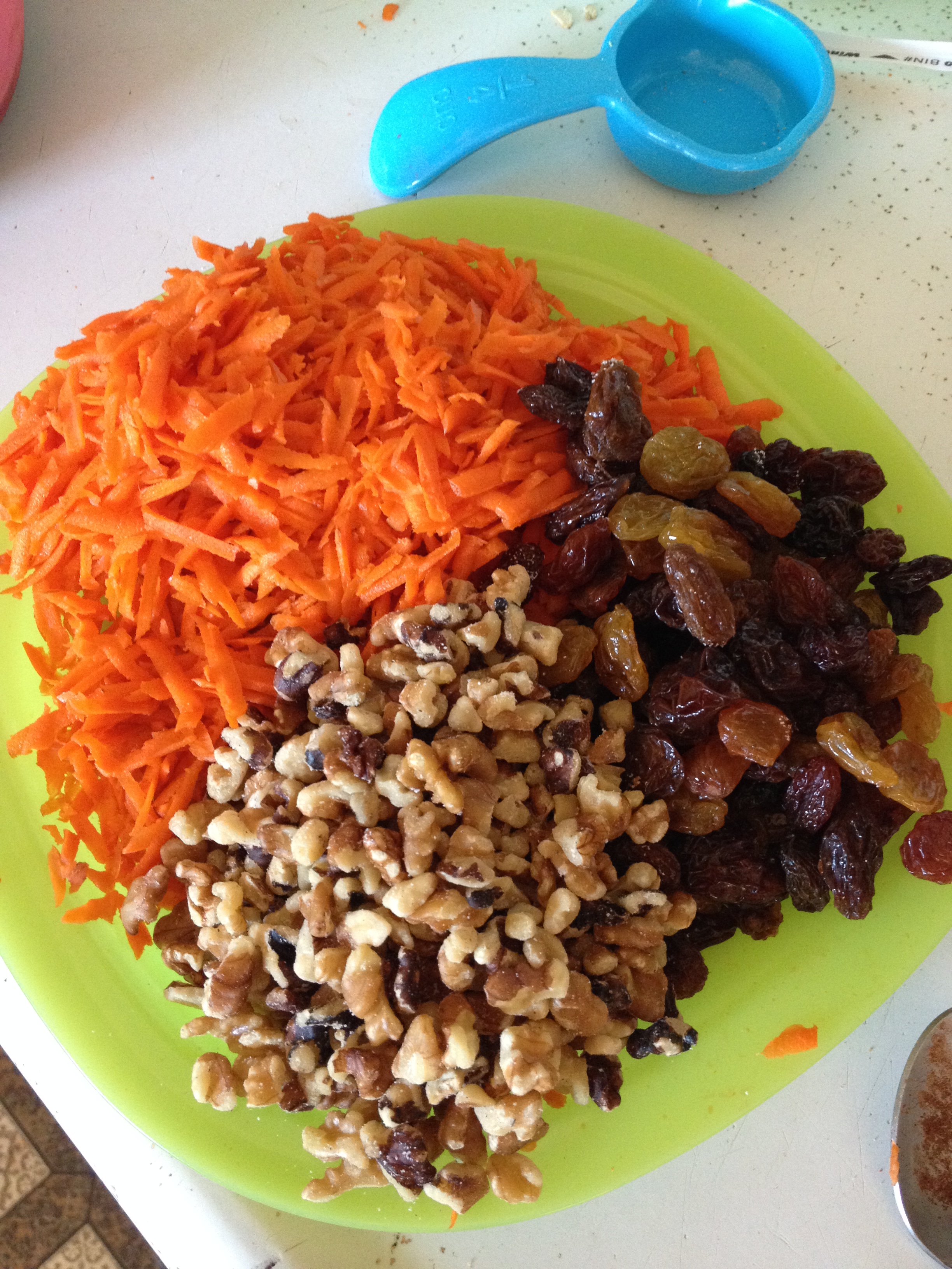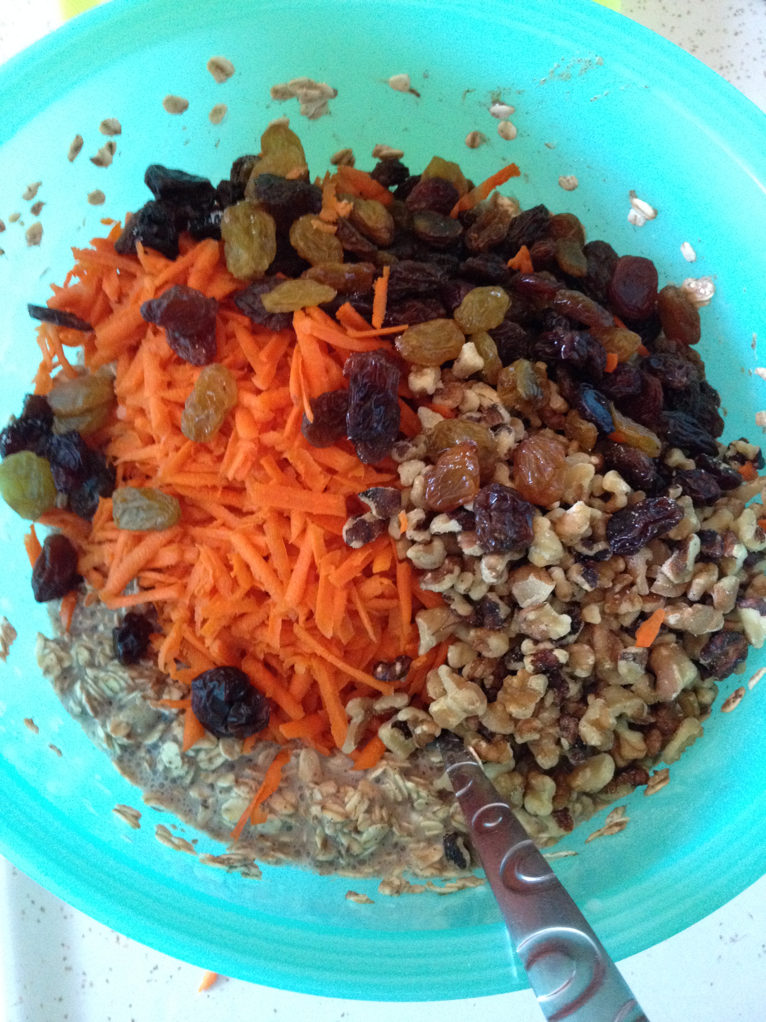 5. Grate carrot then add to oat mixture with raisins and chopped walnuts.