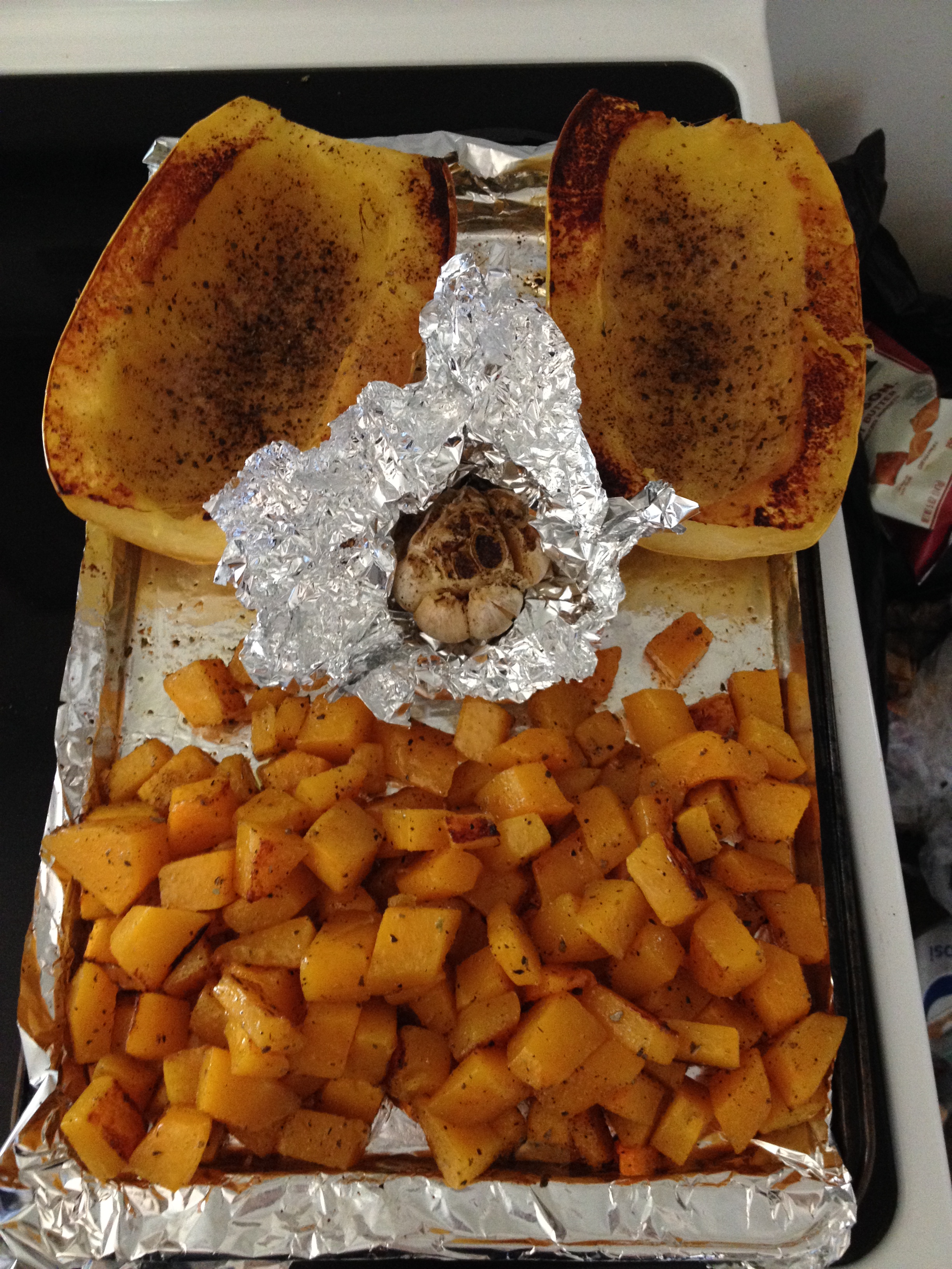 4. Sprinkle olive oil over squash’s and garlic. Sprinkle black pepper over garlic and crunch foil around bulb. Sprinkle black pepper, garlic powder, and oregano over both squash; mix butternut with hands.