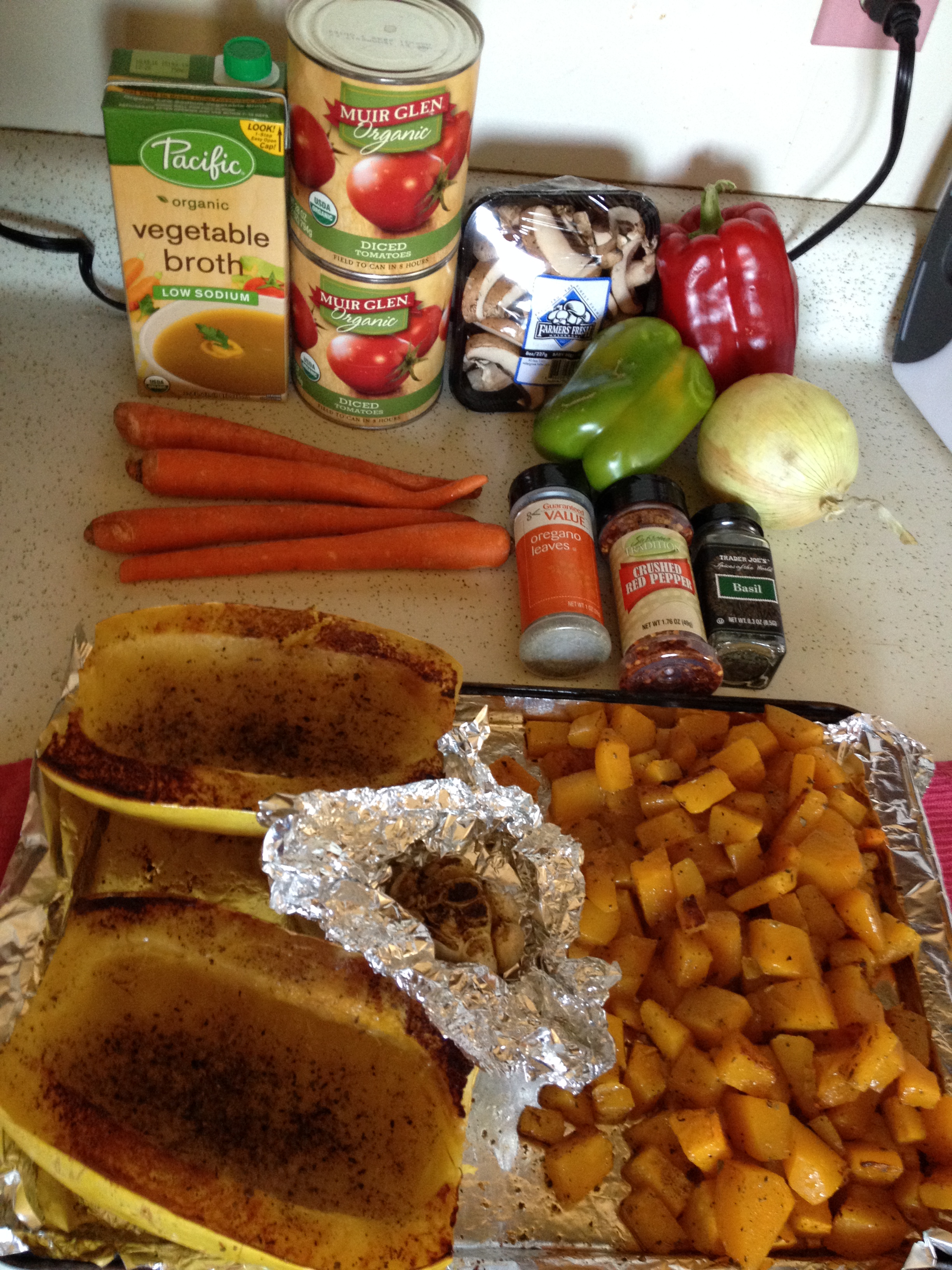Start by roasting the butternut squash, spaghetti squash, and garlic at 350 degrees for 45 minutes. Let cool enough to handle the garlic. While veggies are cooling chop the onion, peppers, carrots, and mushrooms and dump into a large pot with 1/2 cup veg broth and turn on medium heat to start sweating. Dump 1/2 can diced tomatoes, half the pan of butternut squash, half the spices, and all the garlic into a blender and blend until smooth then dump into the pot. Add rest of the can, squash, and spices and blend and dump into pot. Add other can of tomatoes and stir pot then turn heat to simmer and let go one hour. And that’s it! Shred the spaghetti squash, and if you need noodles make a small portion and add a little to each portion of spaghetti squash and add the sauce and there you go! Awesome butternut squash spaghetti!