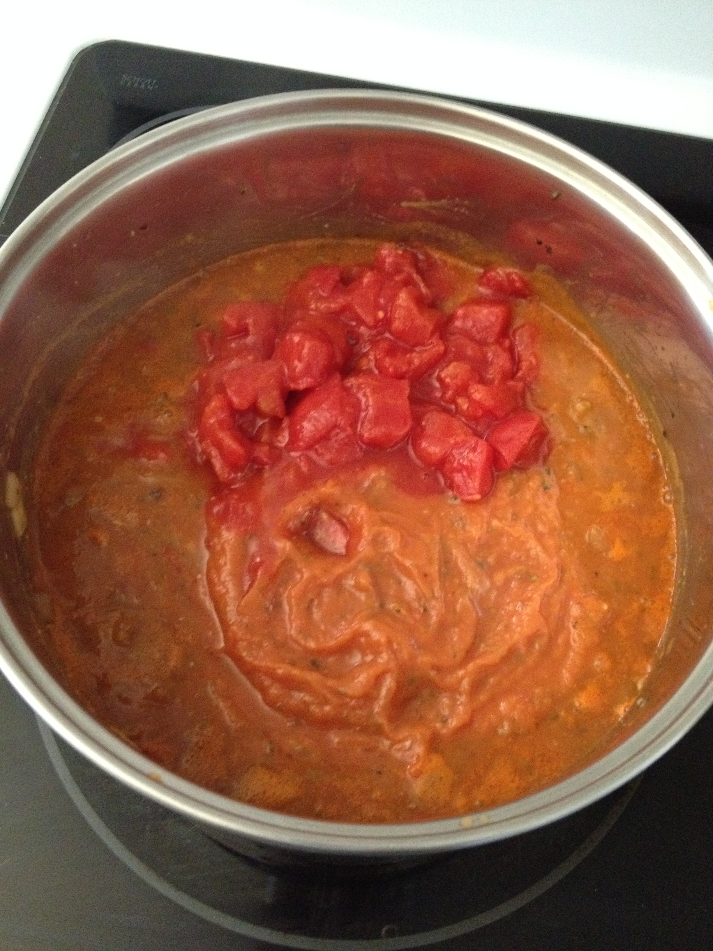 8. Add rest of the can of tomatoes, squash and spices and blend. Dump into pot with other can of tomatoes.