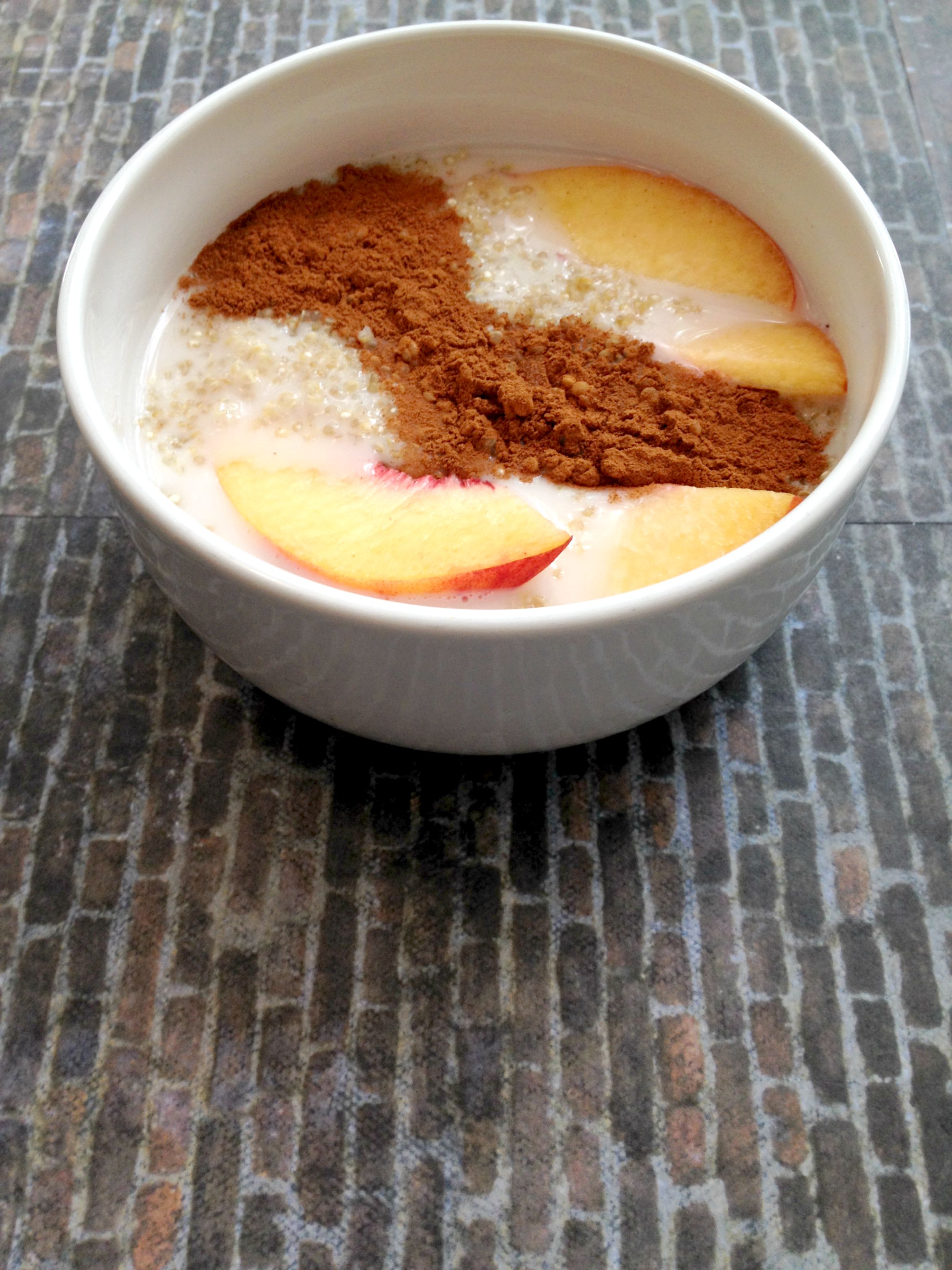2. Pour milk, peach, cinnamon, and maple syrup into a bowl and add quinoa and mix really well.