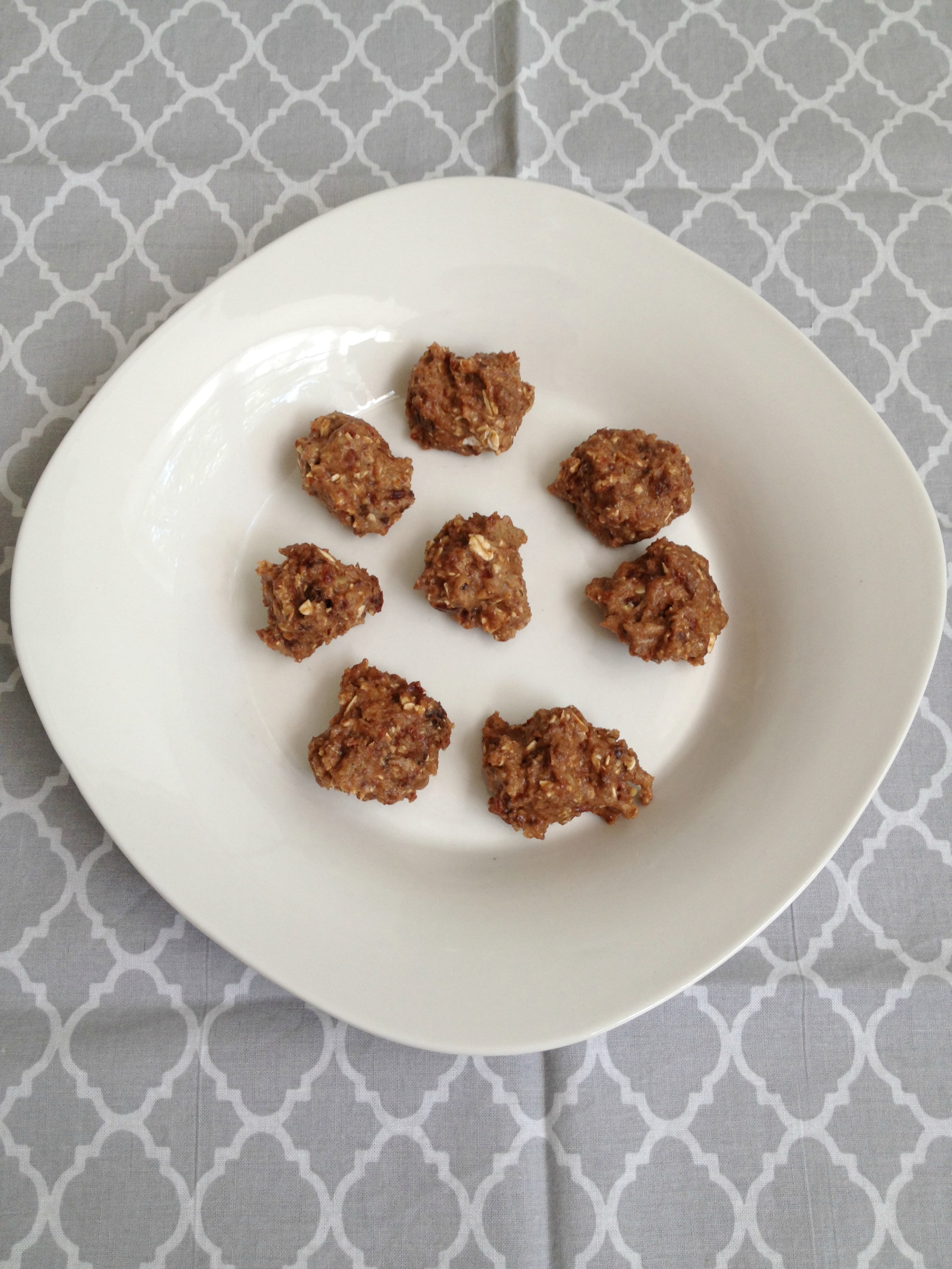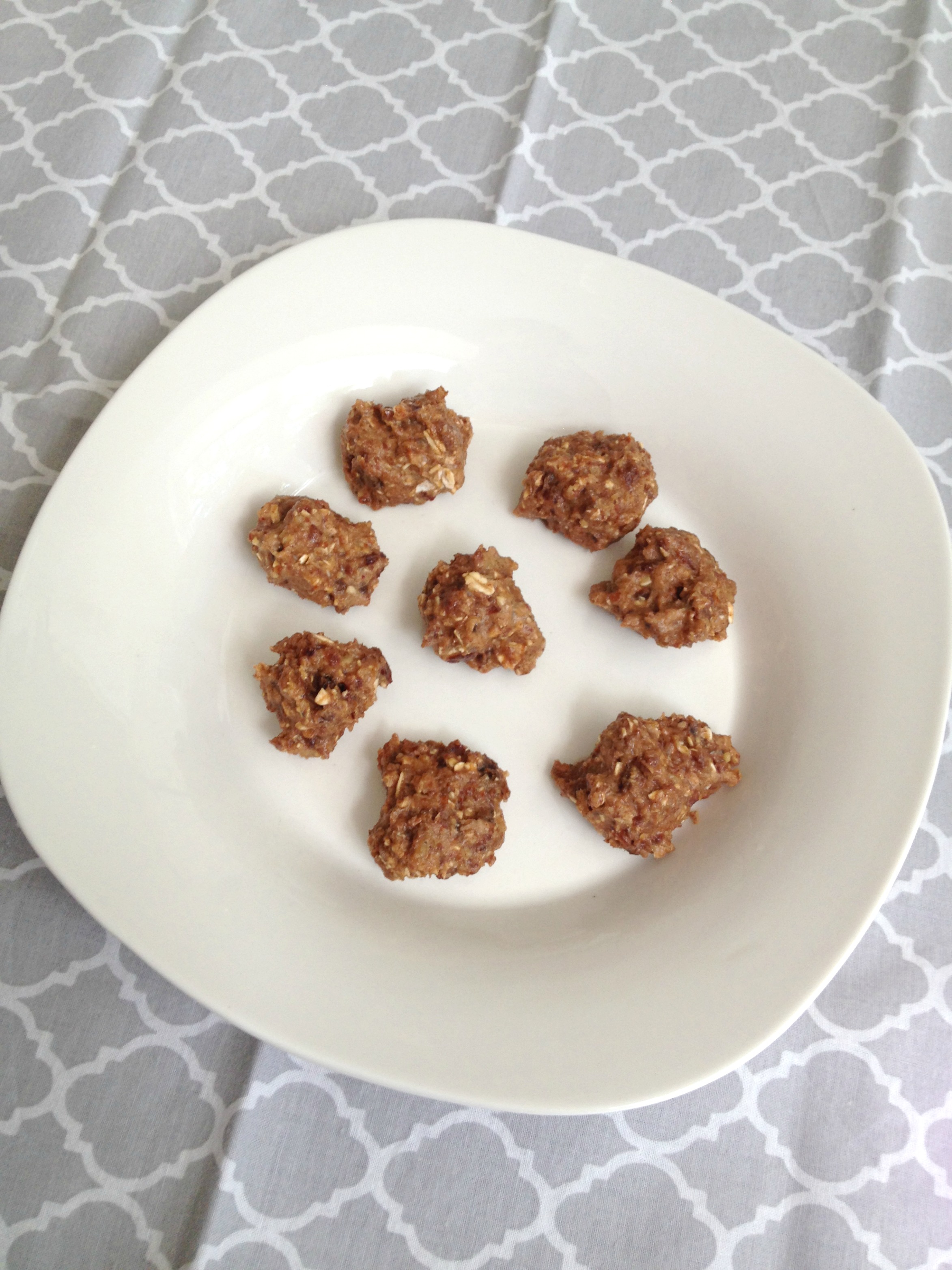 So to get these things going, start by dumping your dates into a small cup and adding hot water and letting them sit about 10 minutes. Even if your dates aren’t dried out, the hot water makes them more blendable. Then just dump everything into a food processor and let whirl until combined. Add the water through the top-spout to get things moving. Once done line a baking sheet with parchment paper then wet your hands and roll everything into little balls. Put tray in the freezer until frozen through then dump them all into a large ziplock bag. Enjoy!