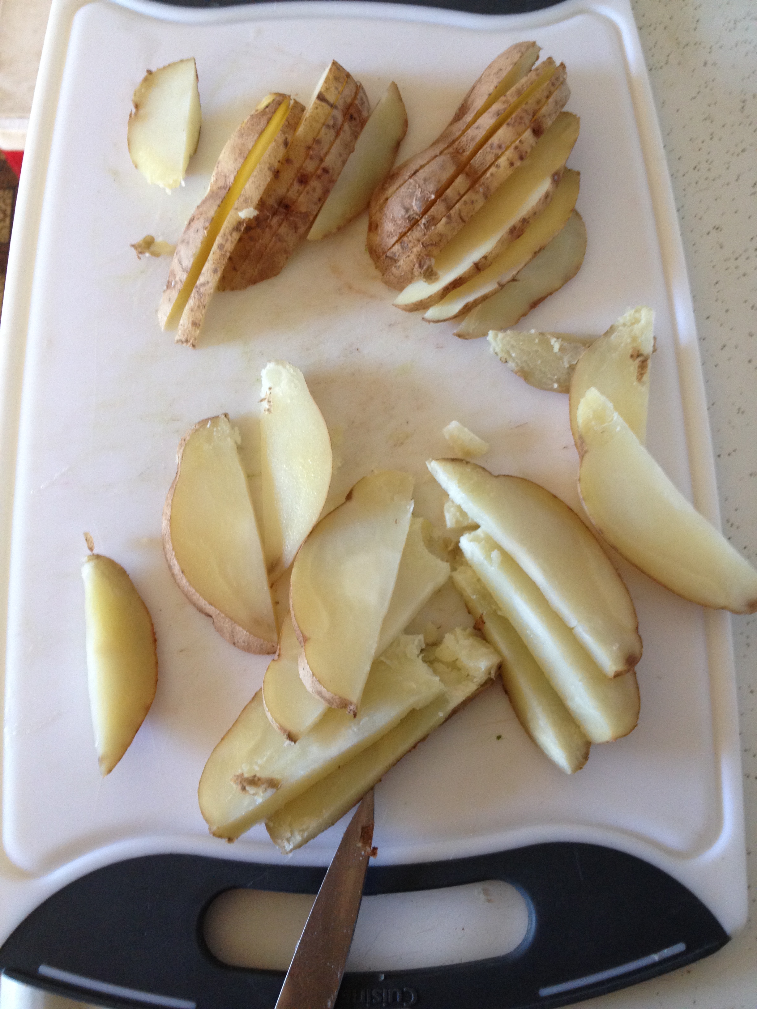 3. Let potatoes cool slightly then slice in half, then slice thinly.