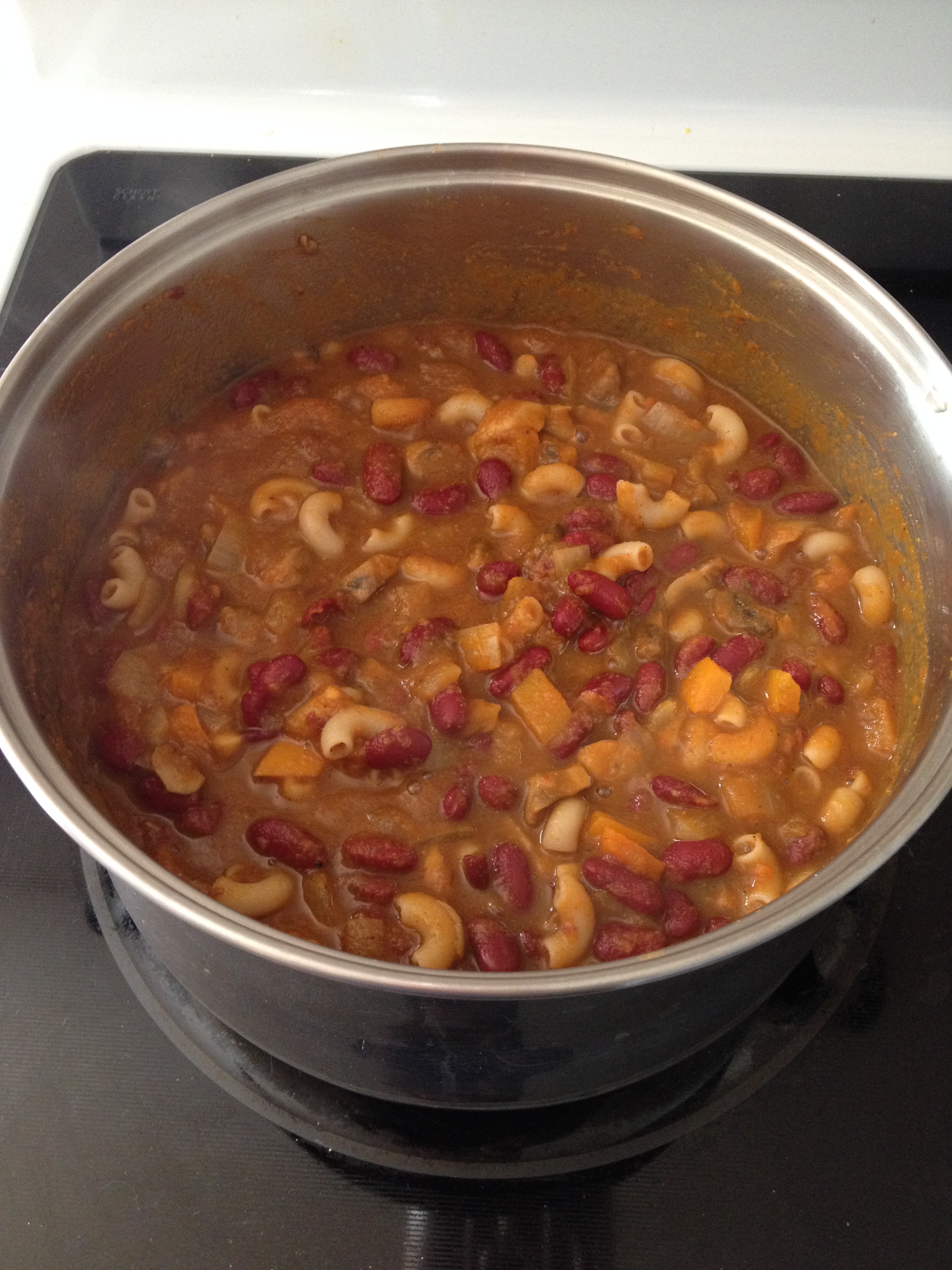 Start by boiling (or steaming) your carrots until tender. Drain and set aside to cool. While carrots are boiling, chop onion, peppers, and mushrooms into small pieces. Once the pot is drained of carrots add 1/4 cup vegetable stock then dump in all the chopped veggies, along with the bay leaf, and saute until tender. Slice the jalapeno in strips – leave the seeds and ribs. In your blender dump half the carrots and jalapeno, one tablespoon homemade taco seasoning, one teaspoon oregano and a couple cups stock and blend until smooth and soupy. Pour into pot with veg. Add rest of the carrots and jalapeno, another tablespoon taco seasoning, last of oregano and stock and blend.Add half the second container of veg stock and the rest of the taco seasoning to the pot and mix. Drain and rinse the beans and add to the pot and mix. Set to low heat and cook about 30 minutes to combine all flavors. In a smaller pot boil half the bag of noodles until just tender then drain and add to chili pot and cook 30 more minutes. Portion out and enjoy!
