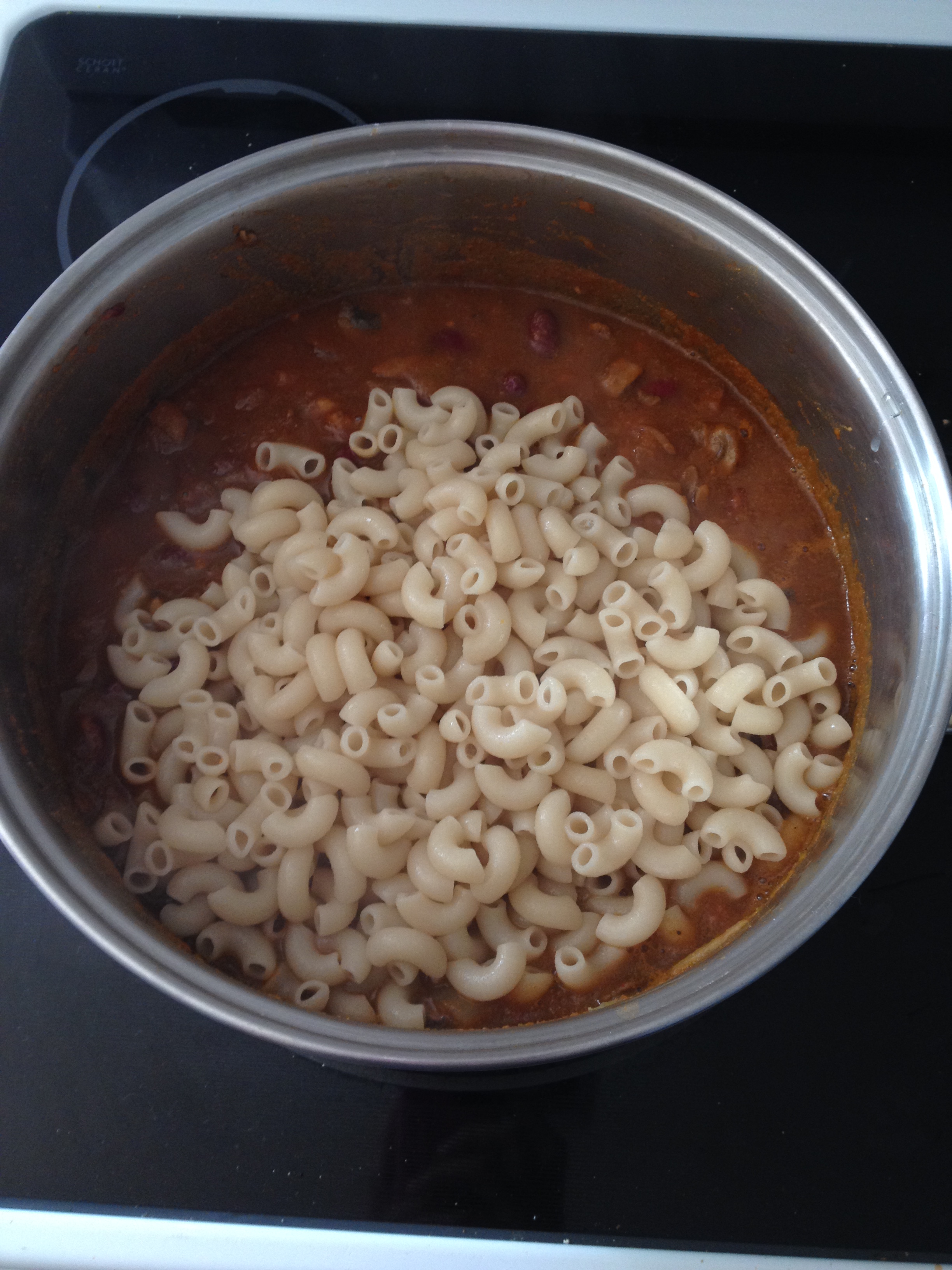 7. In a small pot boil half the bag noodles until tender then drain and add to chili and cook 30 more minutes.