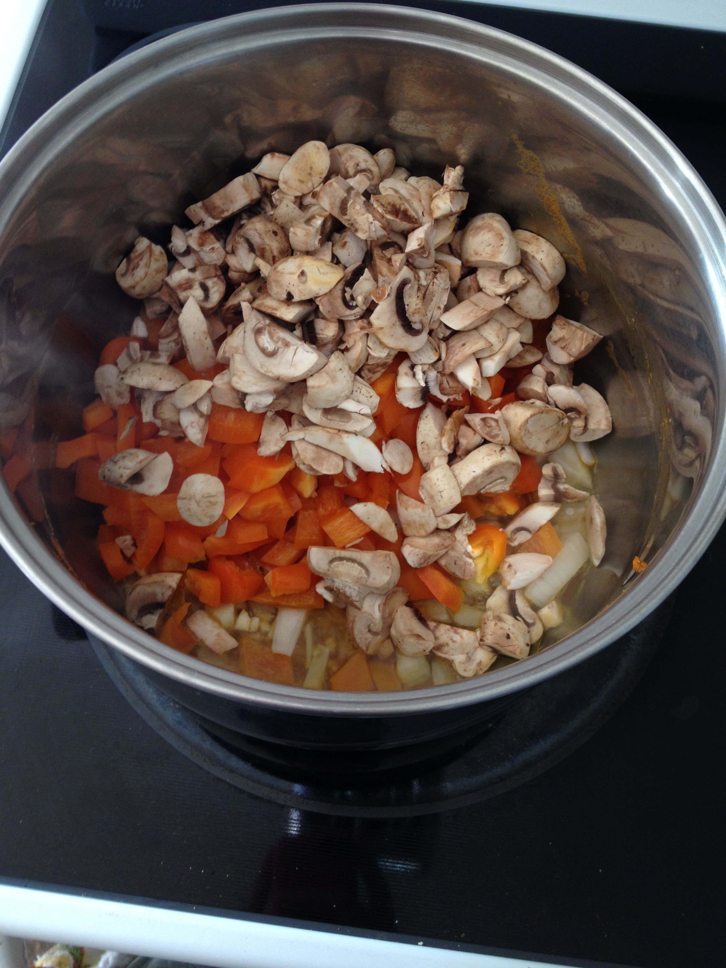2. While carrots are boiling mince garlic then chop onion, peppers and mushrooms into small pieces.
