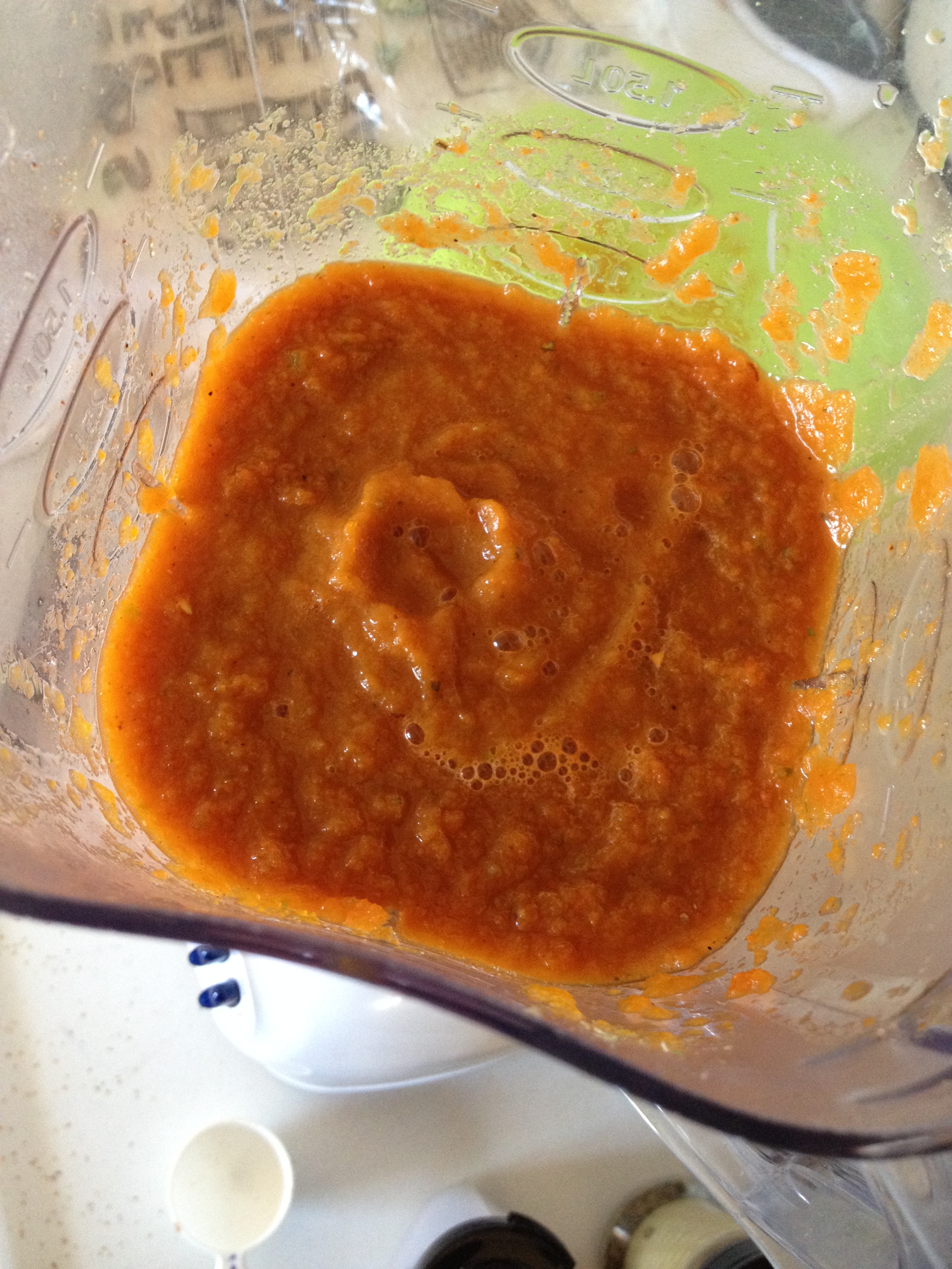 4. In a blender add half the carrots and 1 tablespoons taco seasoning, one teaspoon oregano, and half the jalapeno and 2 cups stock and blend until smooth and soupy. Pour into veg pot and finish other half of carrots, jalapeno, one tablespoon taco seasoning and oregano and stock.