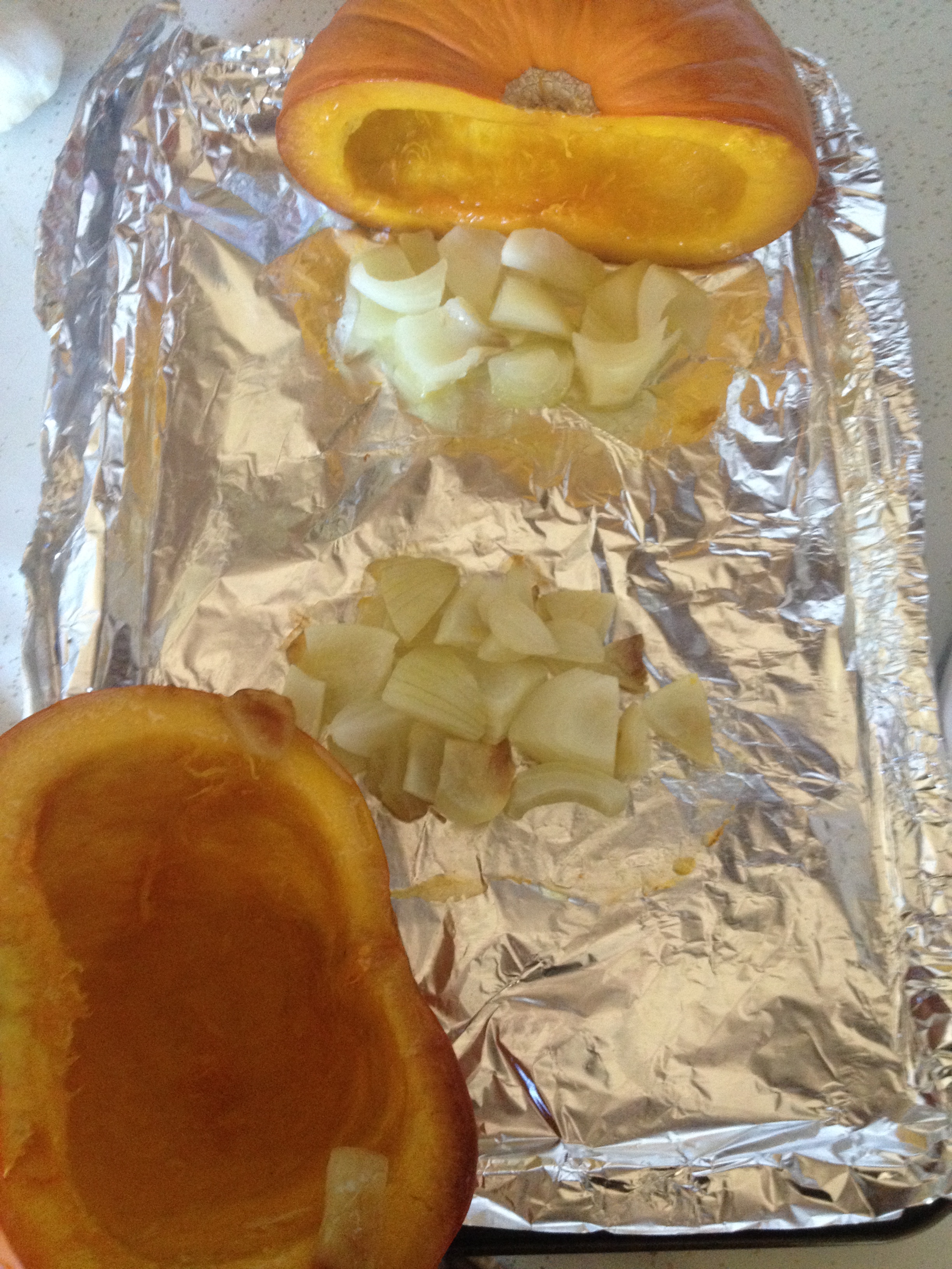 4. Place onions in two piles on foil then place pumpkins cut-side down over the onions.