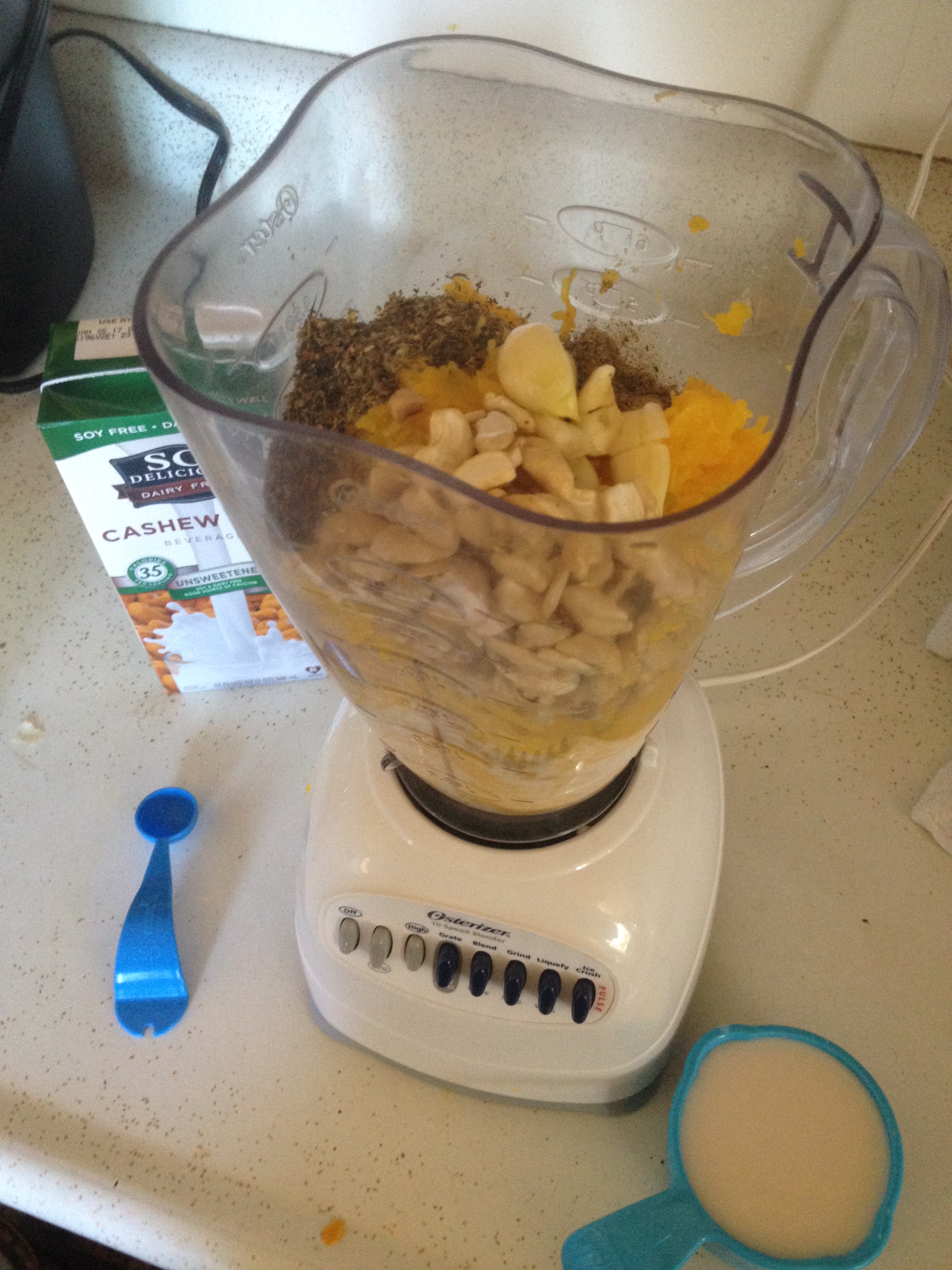Start by halving the pumpkin and scraping out the insides then chopping the onion into chunks – it doesn’t matter the size of the onion chunks since they will be blended later. Line a baking sheet with foil then drizzle olive oil over the pumpkin and onions. Place the onions in two piles on the baking sheet then place the pumpkins cut-side down over the onions. Bake at 375 degrees for 40 minutes then let cool enough to handle. Boil the noodles until completely done – brown rice noodles take awhile to cook and don’t taste all that good unless all the way done; drain noodles then dump back in the pot. In a blender dump the onions then scrape in the pumpkin then add everything else. Be sure not to dump the cashews first because it will be harder to get blending. Blend everything until smooth, then immediately pour over the drained noodles – be sure to complete the sauce before the noodles are done so you can pour the sauce right over the done noodles. This makes a ton of sauce so you can either freeze the leftovers or save for later use during the week.