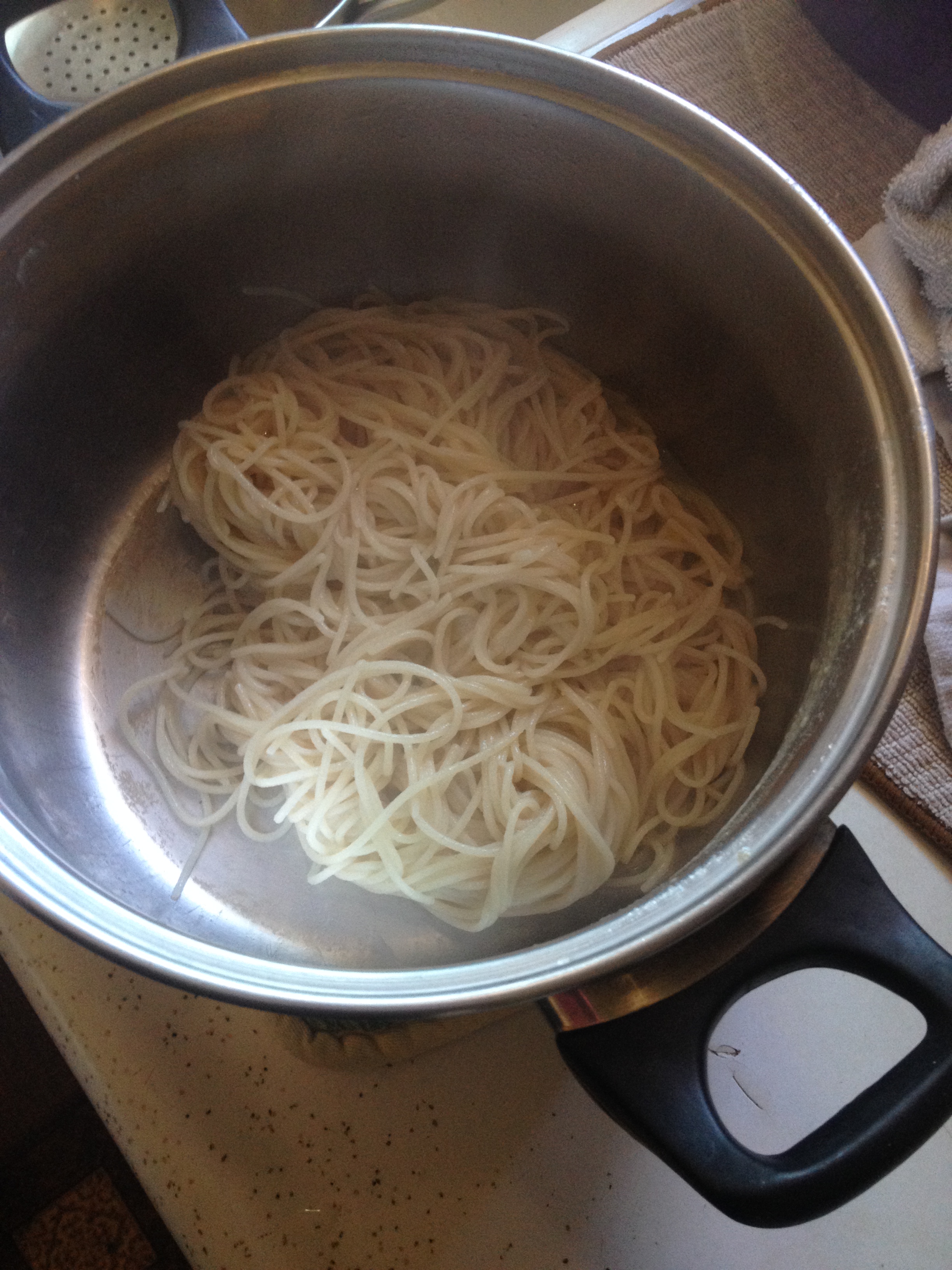 8. Dump half the Alfredo over noodles (or all of it depending on how much noodles you made) and mix.