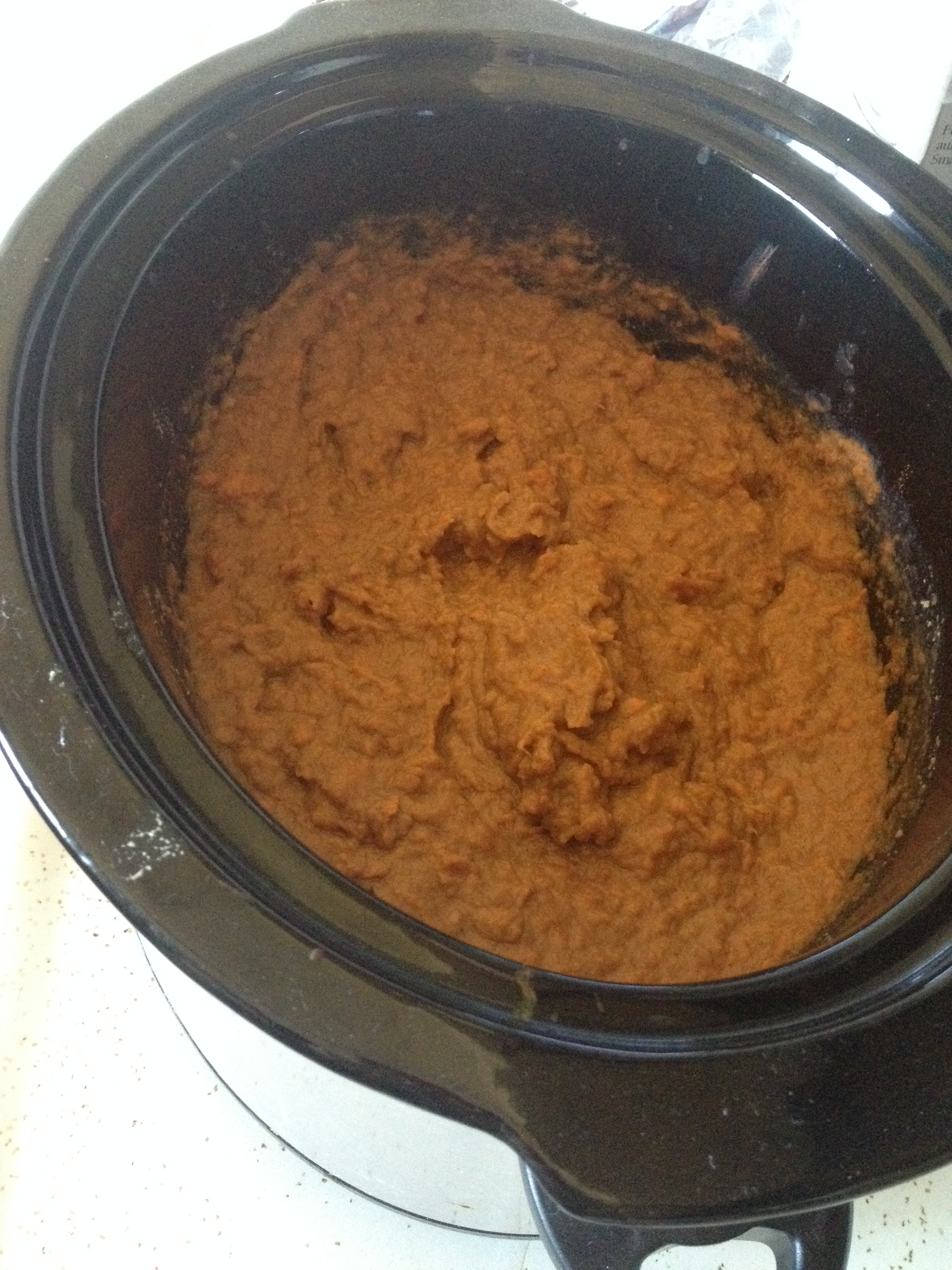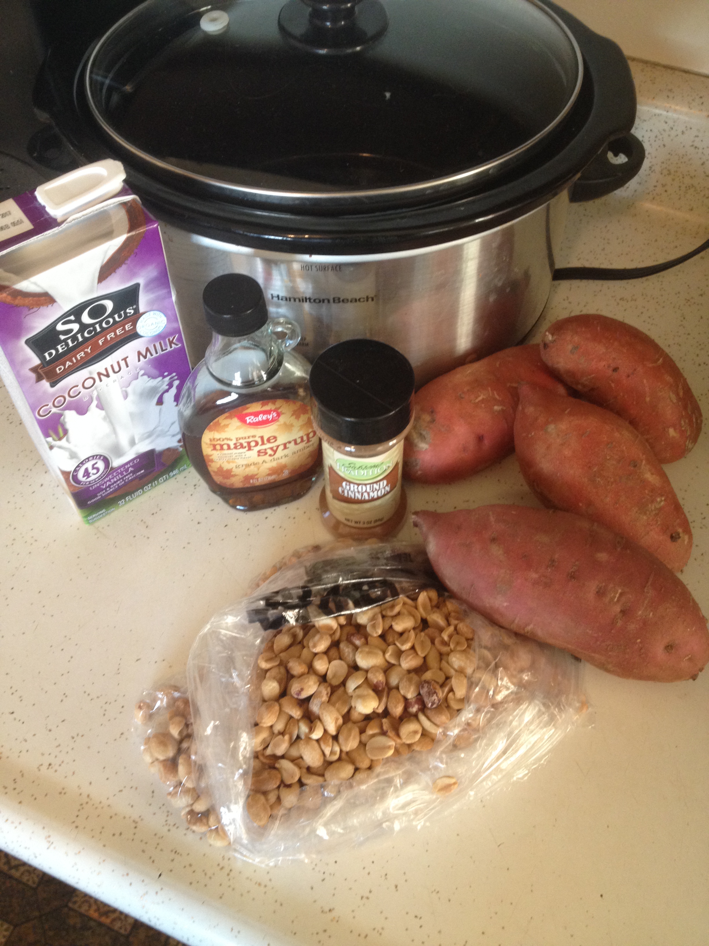 Start by turning your crockpot to Hi then wash and peel the sweet potatoes. Chop the potatoes into small chunks and dump into the heating crockpot then pour in all the milk, cinnamon, and maple syrup and stir. Put the lid on and let go about 3 1/2 hours, stirring a few times during that time. Once chunks are done to the point of being mashable, grind your peanuts with some liquid from the pot into a buttery consistency then dump in the pot. I used a potato masher – if you have handheld blender you can use that, but make sure the potatoes are over done and be careful since it’s really hot. Mash or blend until everything is creamy – yes it’s thick and delicious. Simple and easy as that! Enjoy!